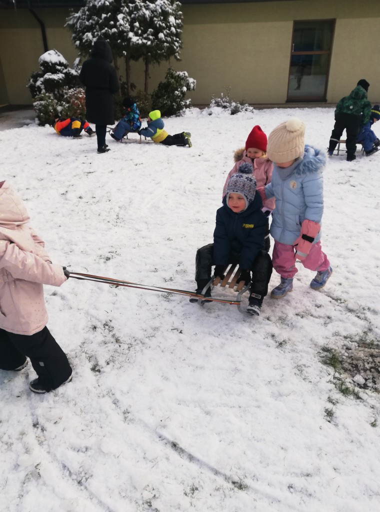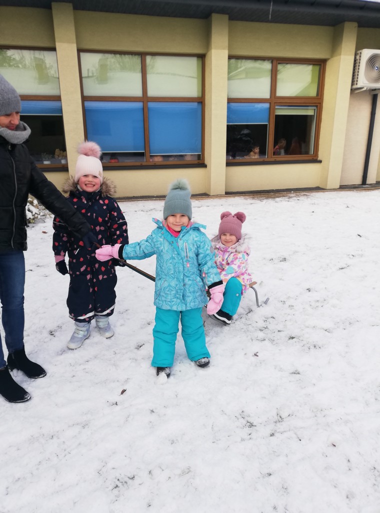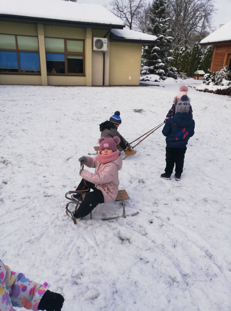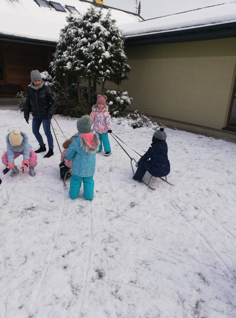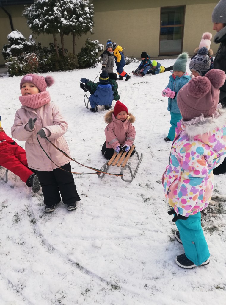 Za oknem z dnia na dzień przybywa śniegu, co sprawia dzieciom radość. Wreszcie mogliśmy urządzić wesołe zabawy na śniegu. Z zapałem rzucaliśmy się śnieżkami, jeździliśmy na sankach i robiliśmy śnieżne „aniołki”. Z uśmiechami na twarzach wróciliśmy do przedszkola na ciepły obiad.