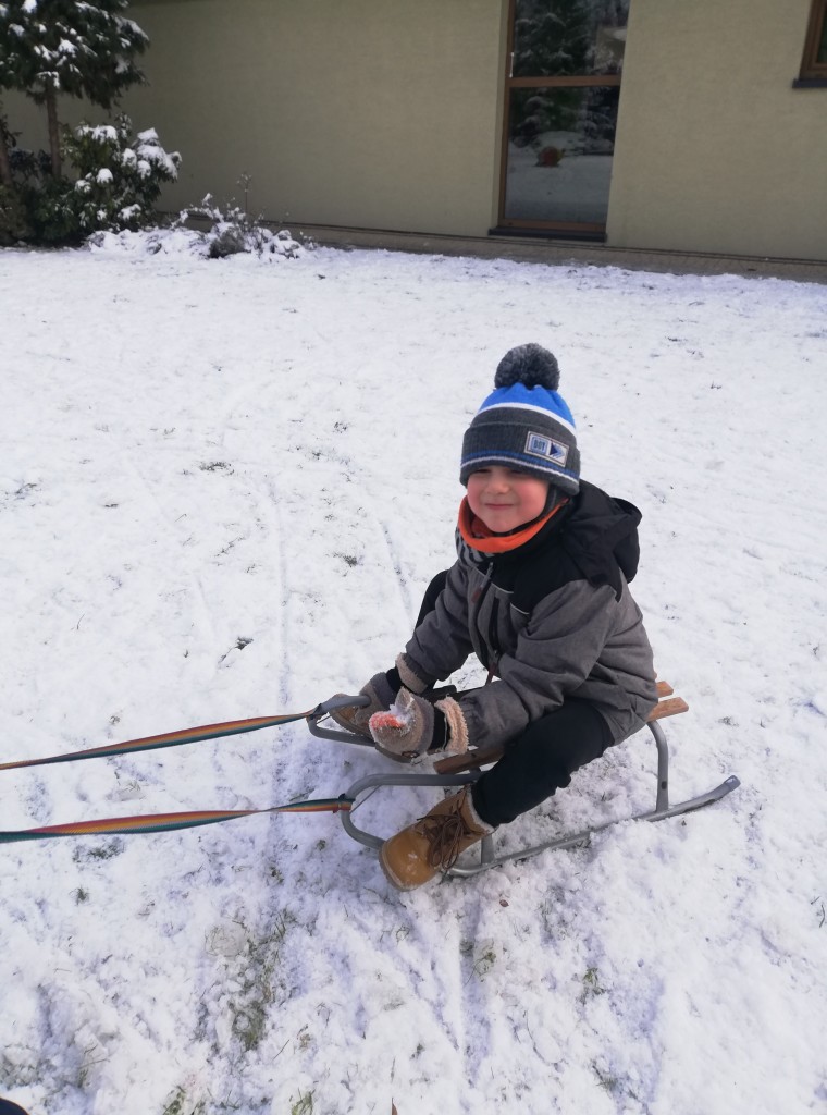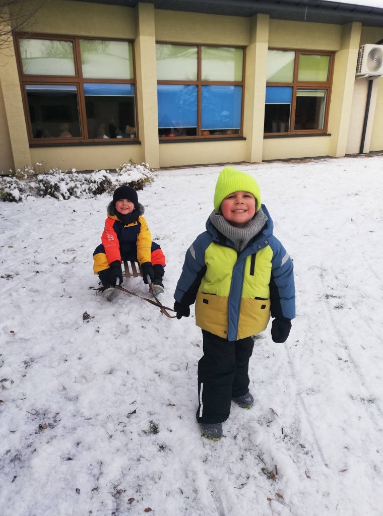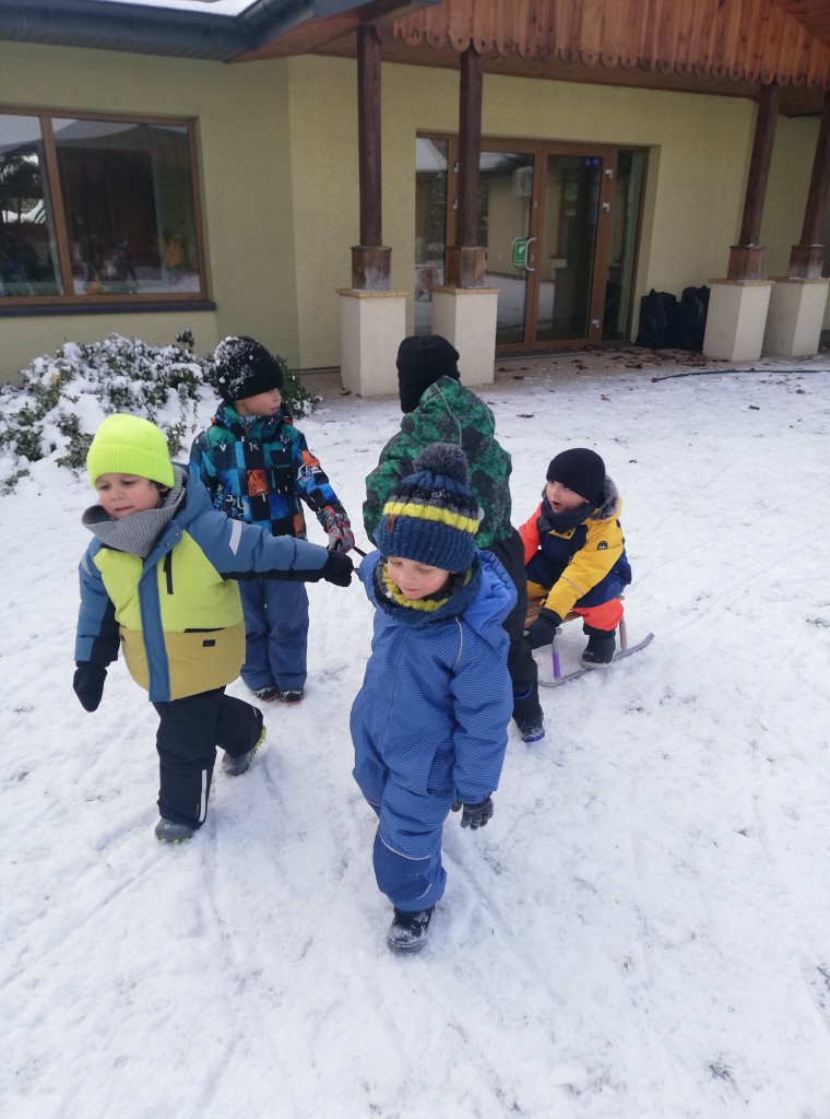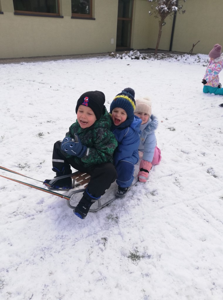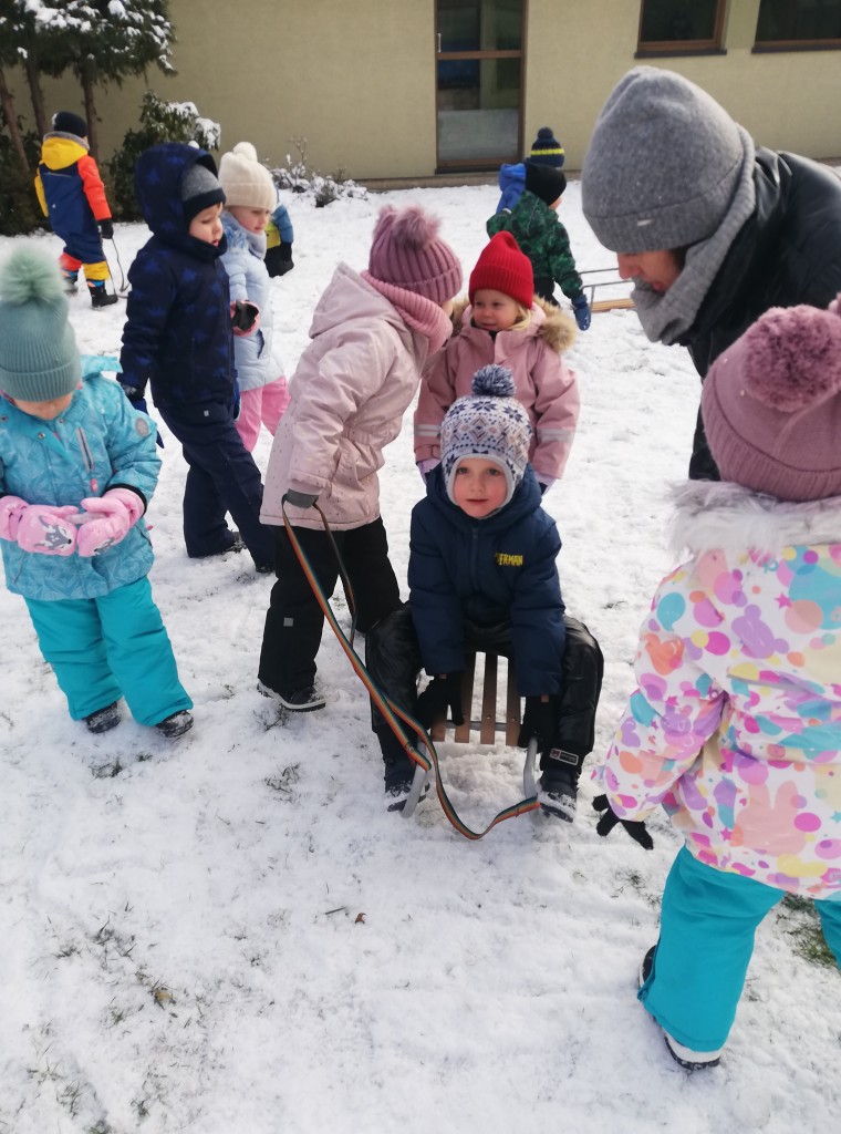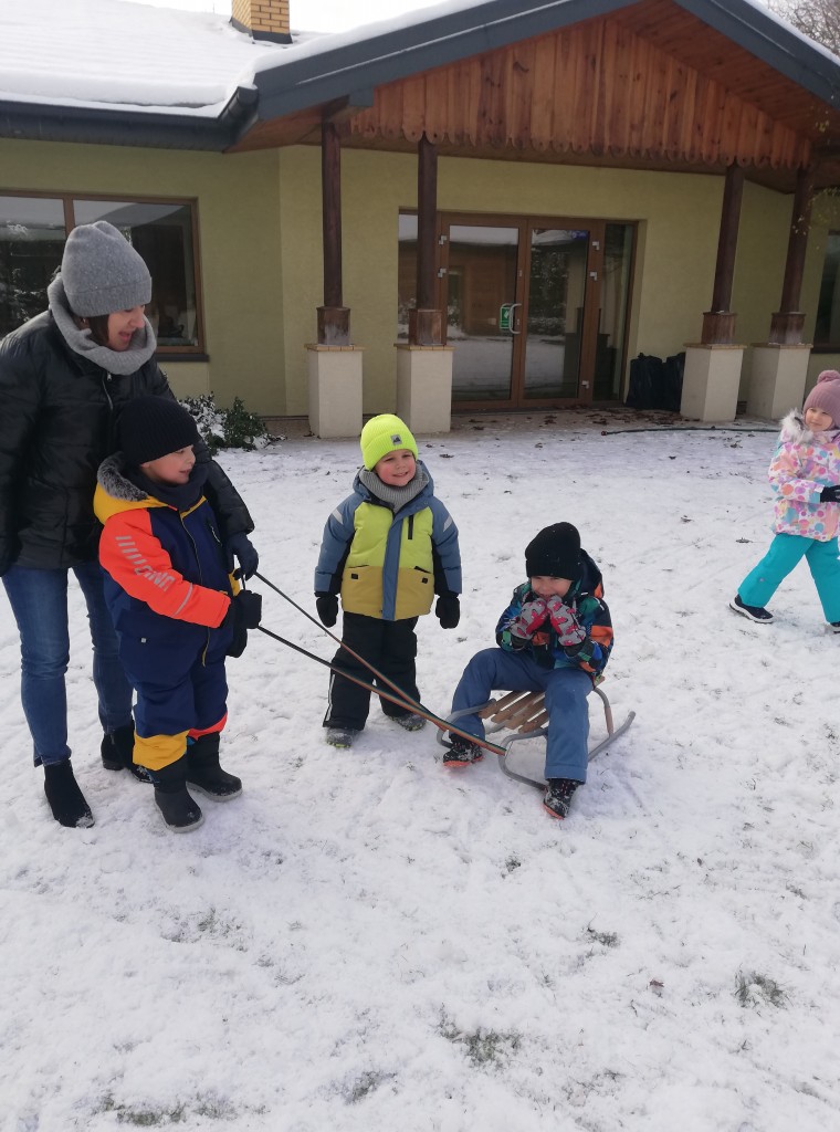 Za oknem z dnia na dzień przybywa śniegu, co sprawia dzieciom radość. Wreszcie mogliśmy urządzić wesołe zabawy na śniegu. Z zapałem rzucaliśmy się śnieżkami, jeździliśmy na sankach i robiliśmy śnieżne „aniołki”. Z uśmiechami na twarzach wróciliśmy do przedszkola na ciepły obiad.
