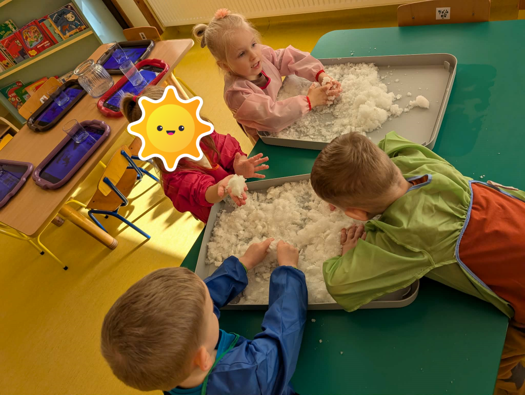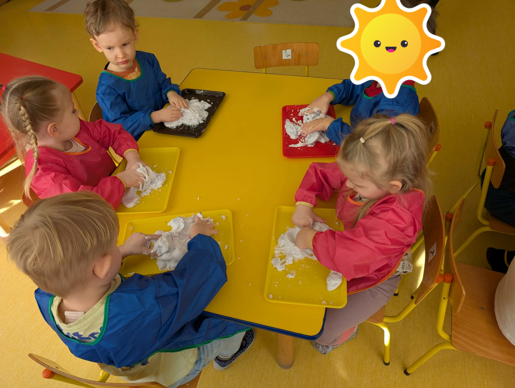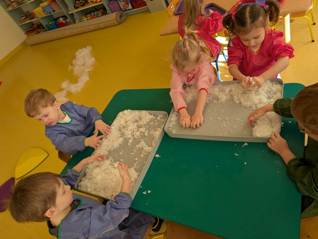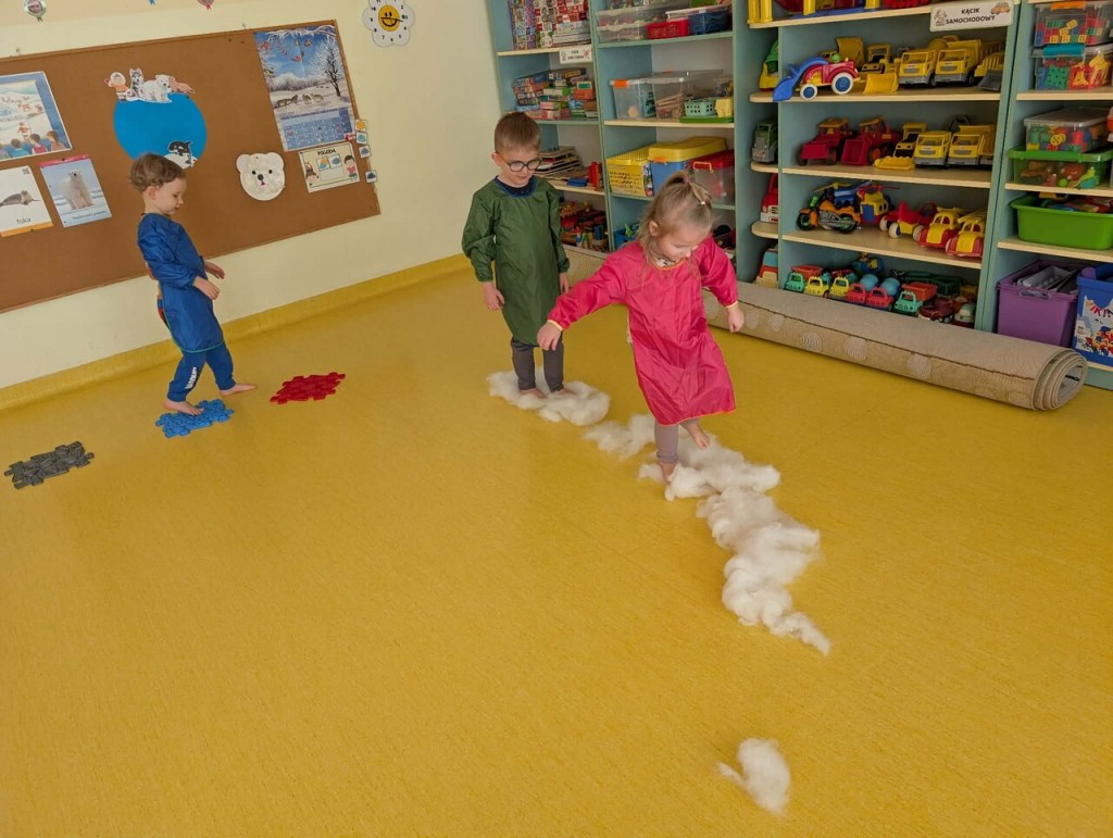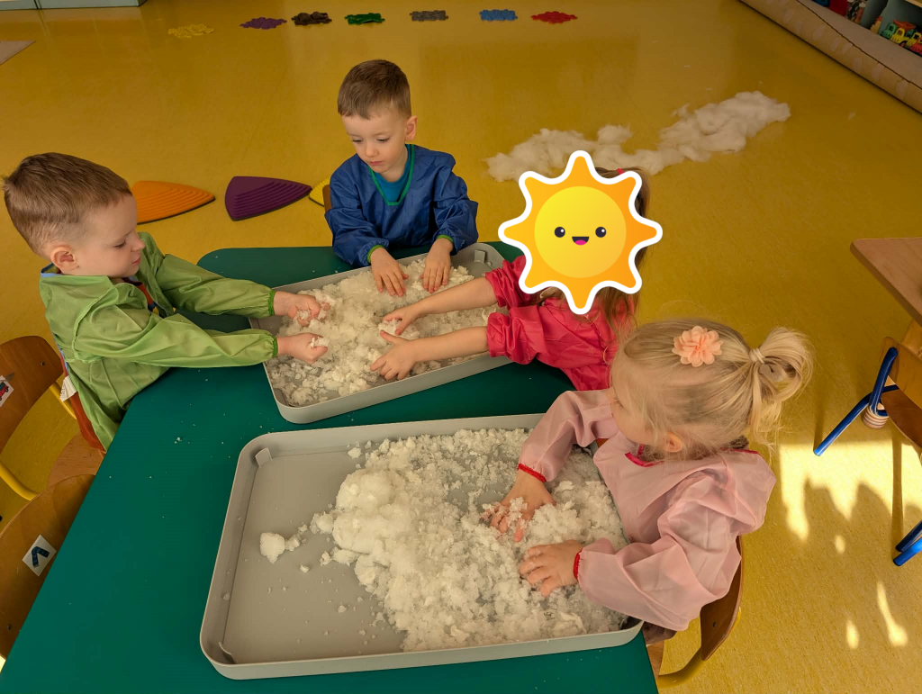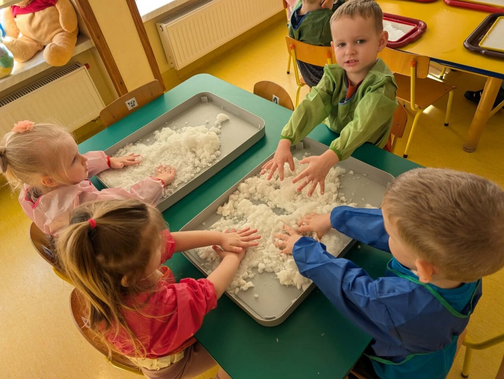 Czas na zimowe zabawy. Tym razem nasza wyobraźnia przeniosła nas do „Krainy wiecznych lodów”, do której drogę przemierzaliśmy pokonując boso ścieżkę sensoryczną. W „Lodowej krainie” czekał na nas śnieg i lód do złudzenia przypominający prawdziwy. Do naszych działań sensorycznych wykorzystaliśmy mąkę ziemniaczaną, wodę, mydło w płynie oraz wkłady z pieluszek. Sensoryczne zabawy sztucznym śniegiem były niezwykłą przyjemnością dla małych rąk. Lepienie, ugniatanie, formowanie – dokładnie te czynności wspomagają rozwój małych paluszków. Zabawy sztucznym śniegiem sprawiły nam wiele radości.