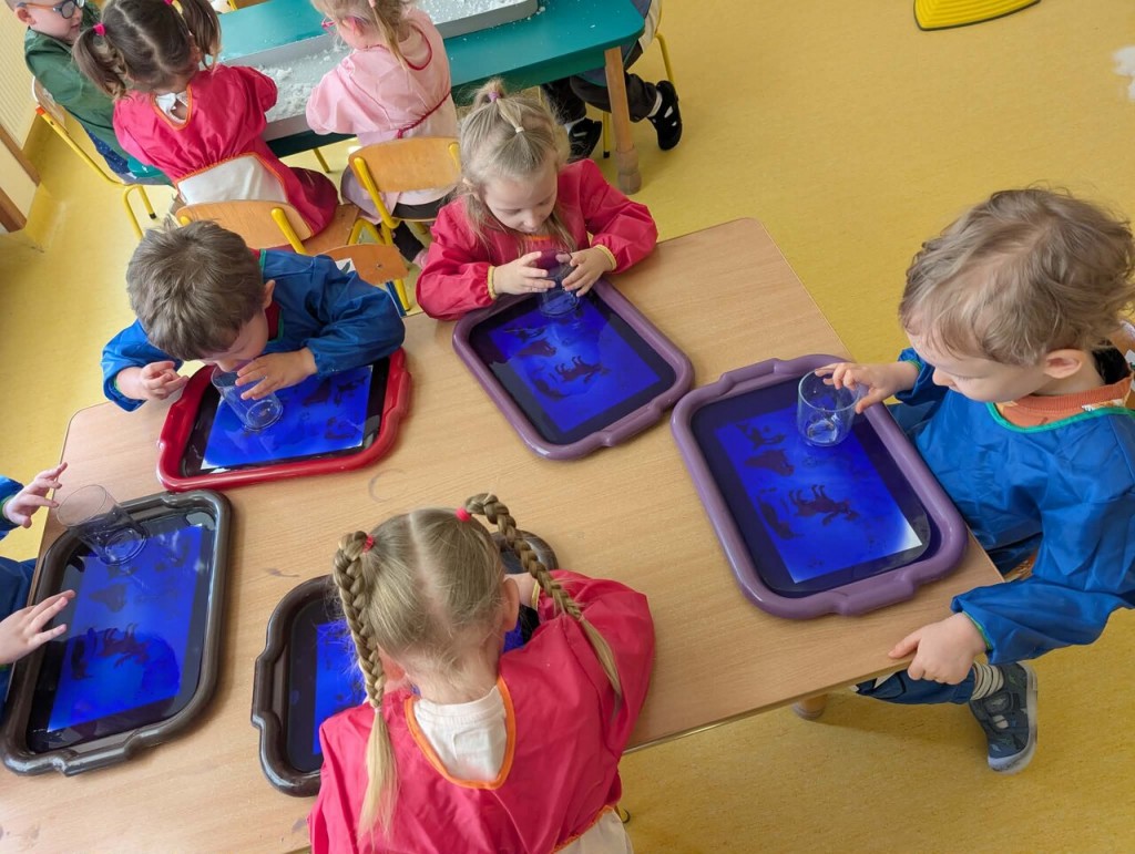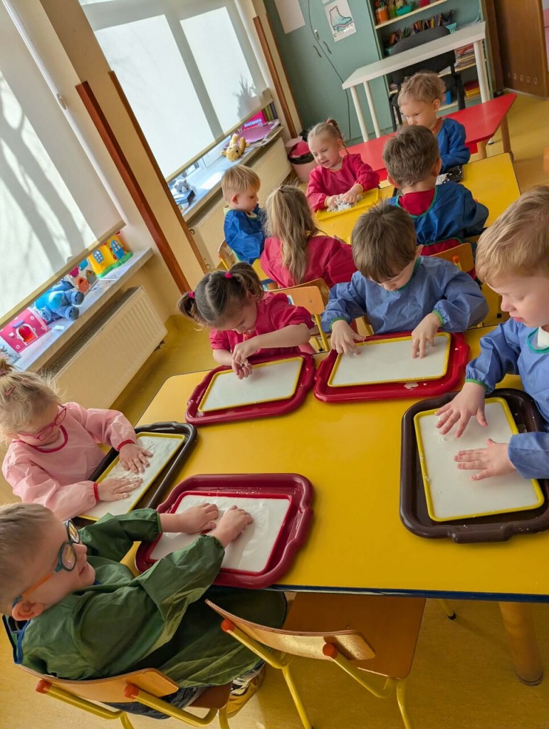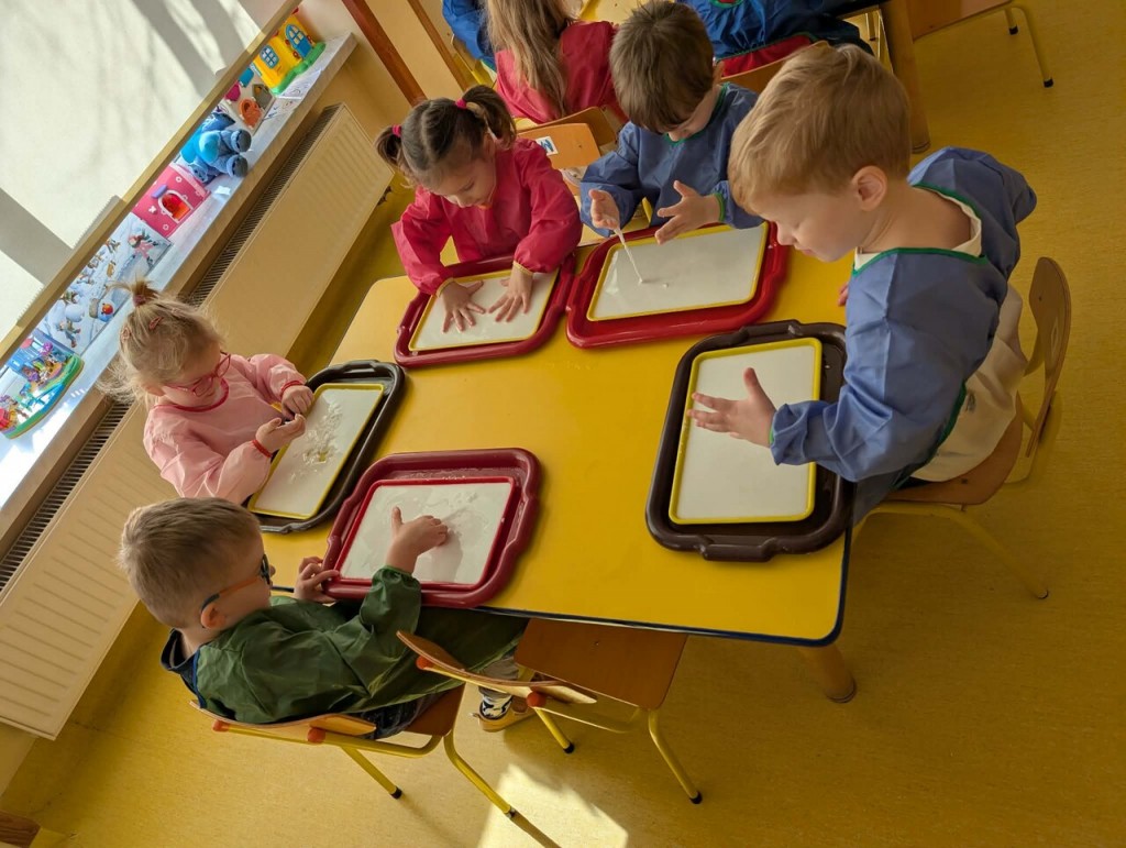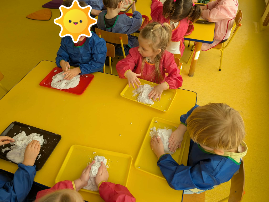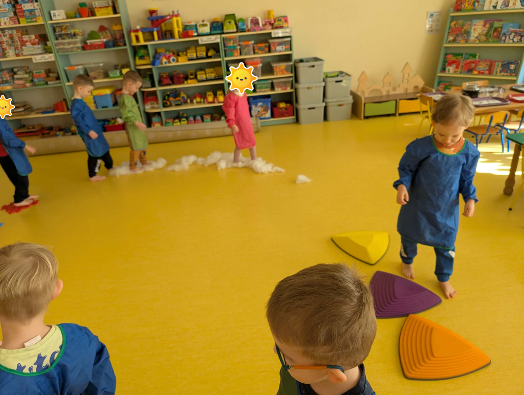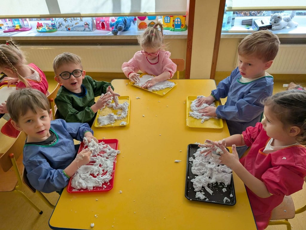 Czas na zimowe zabawy. Tym razem nasza wyobraźnia przeniosła nas do „Krainy wiecznych lodów”, do której drogę przemierzaliśmy pokonując boso ścieżkę sensoryczną. W „Lodowej krainie” czekał na nas śnieg i lód do złudzenia przypominający prawdziwy. Do naszych działań sensorycznych wykorzystaliśmy mąkę ziemniaczaną, wodę, mydło w płynie oraz wkłady z pieluszek. Sensoryczne zabawy sztucznym śniegiem były niezwykłą przyjemnością dla małych rąk. Lepienie, ugniatanie, formowanie – dokładnie te czynności wspomagają rozwój małych paluszków. Zabawy sztucznym śniegiem sprawiły nam wiele radości.