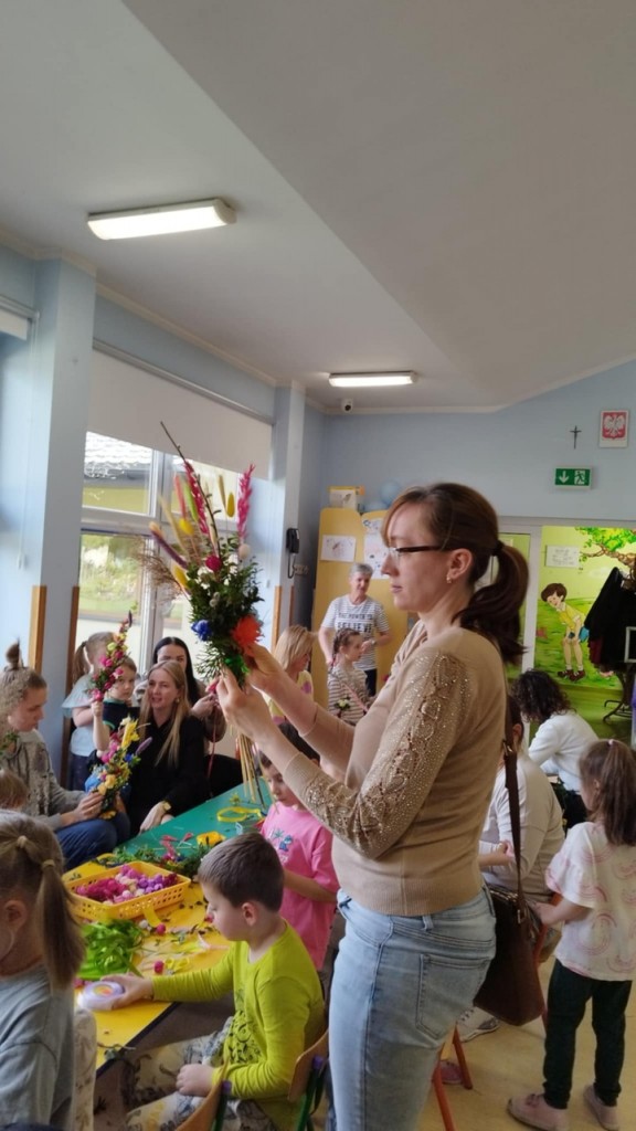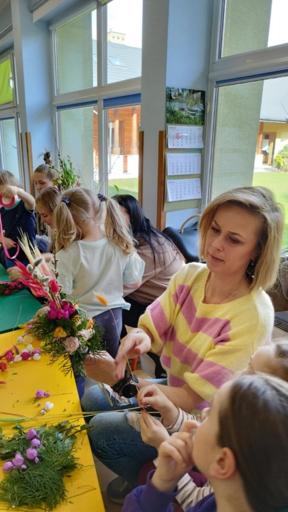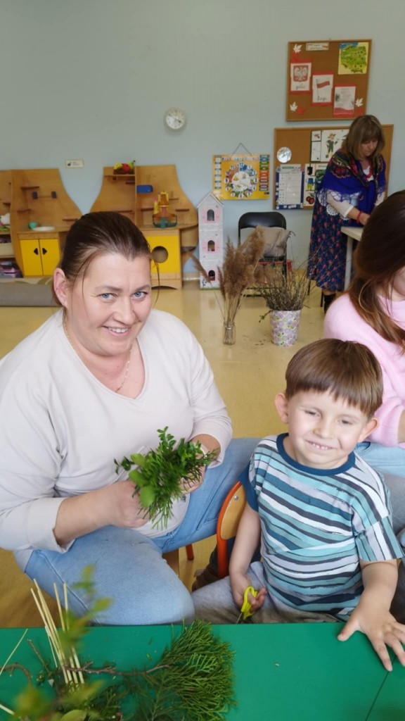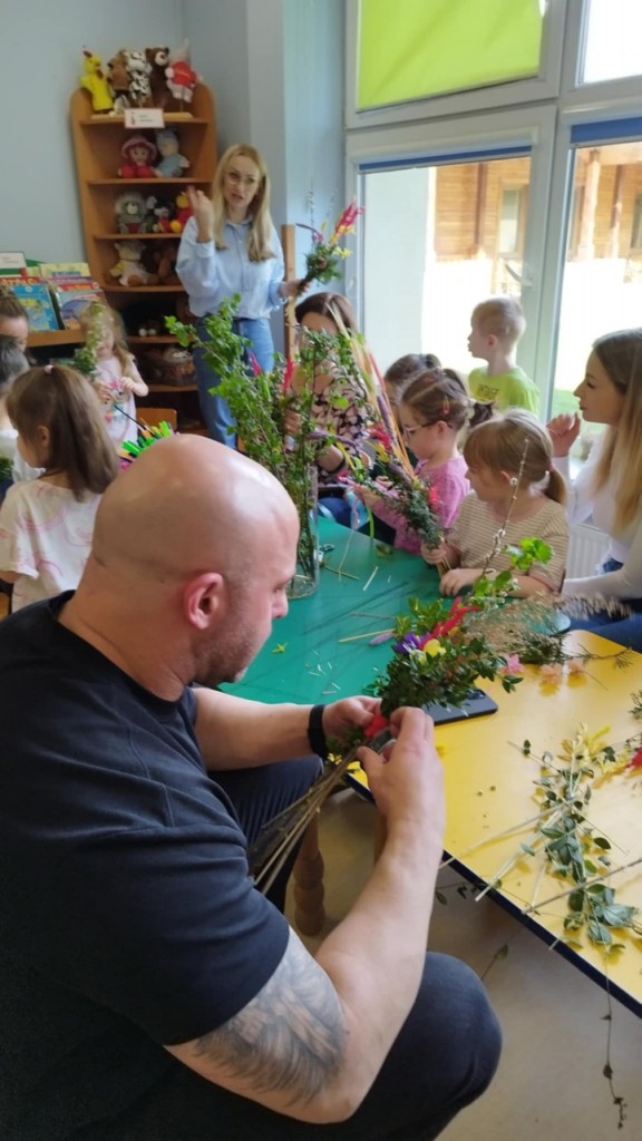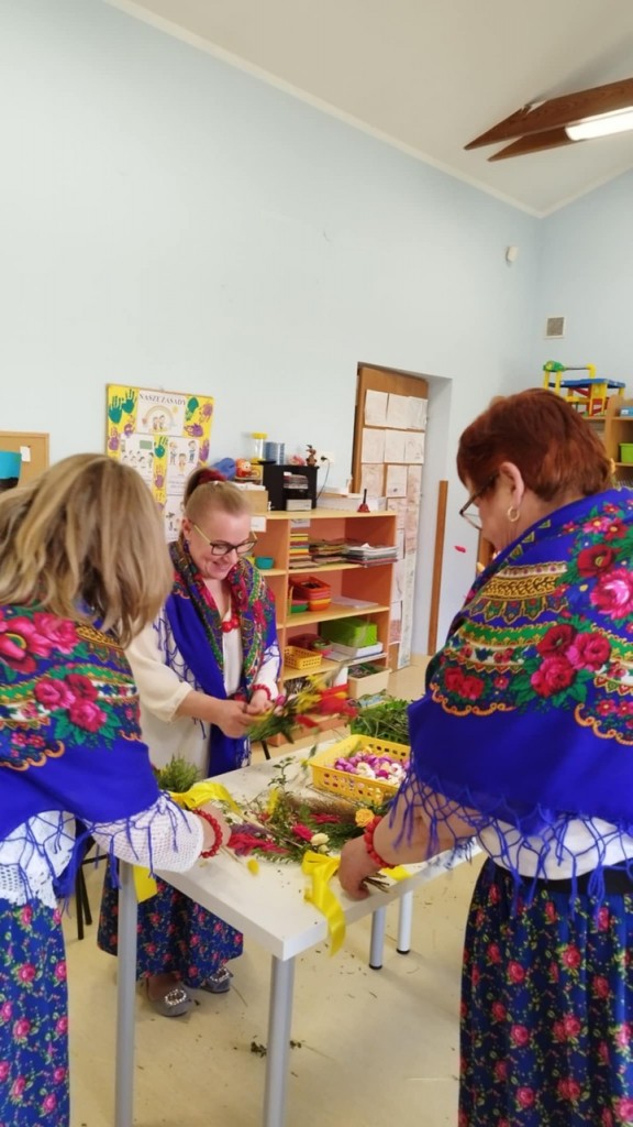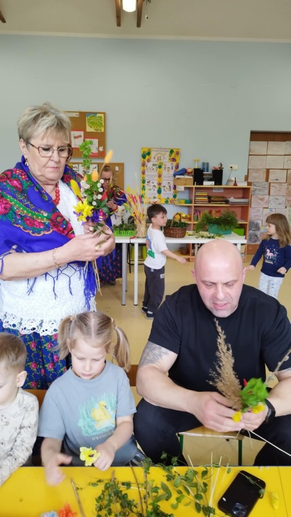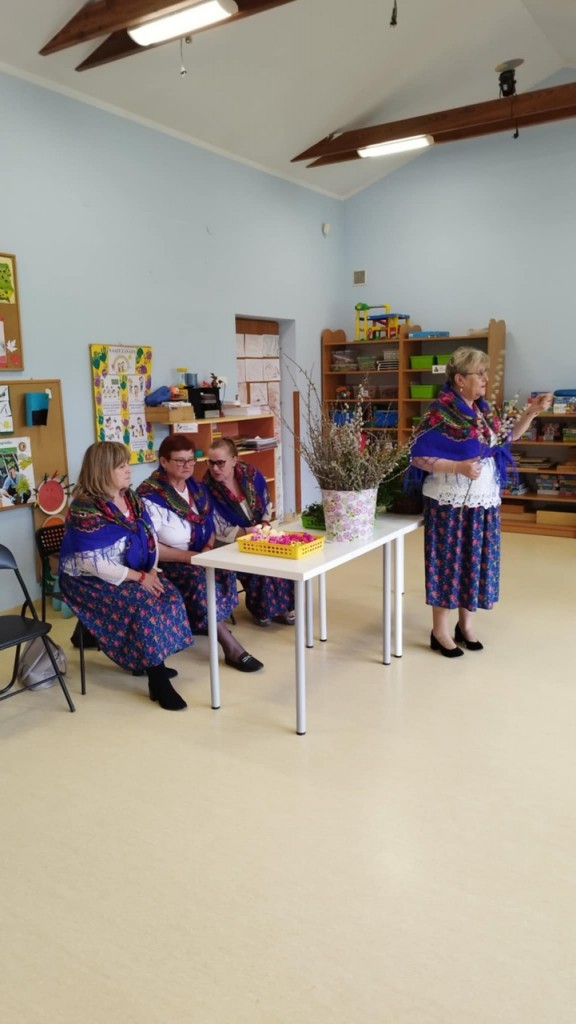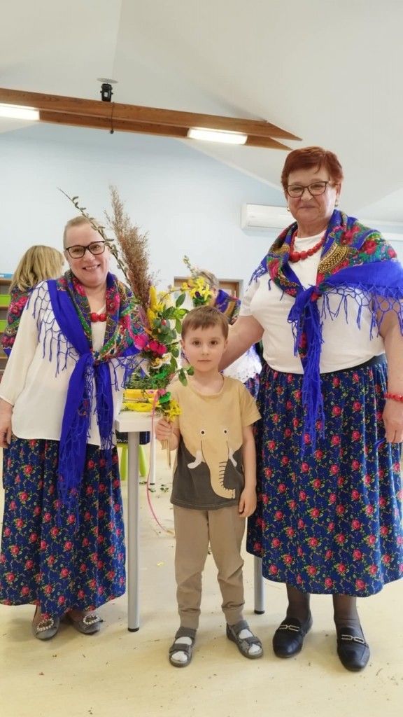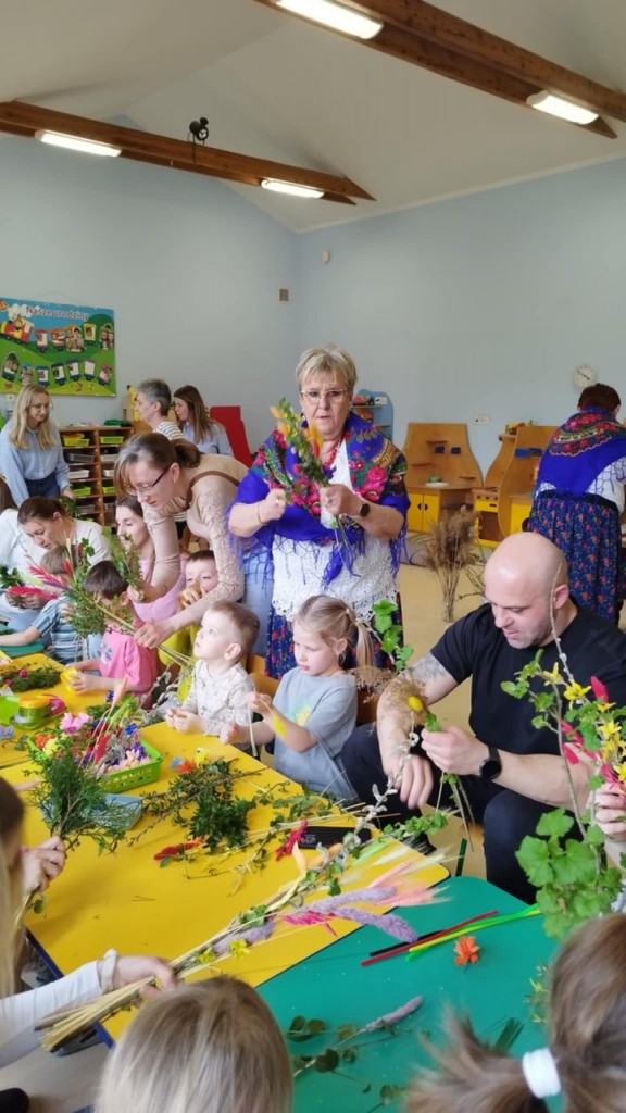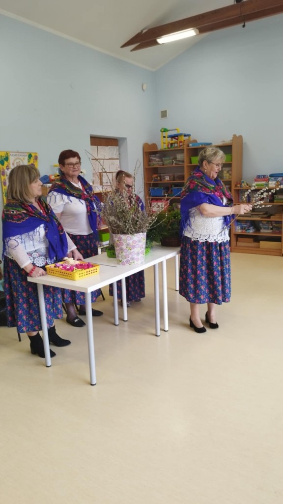 Dnia 8 kwietnia podczas zajęć otwartych z naszymi rodzicami mieliśmy zaszczyt i przyjemność gościć Panie z Koła Gospodyń Wiejskich z Koroszczyna. Panie przybliżyły nam tradycje ludowe związane ze Świętami Wielkanocnymi oraz wyjaśniły z czego i jak powinno się tworzyć palmę wielkanocną. Następnie wspólnie z rodzicami pod czujnym okiem „Ekspertów” wykonywaliśmy palmy. Wyszły przepiękne, kolorowe, każda inna i niepowtarzalna…A na zakończenie pięknie podziękowaliśmy i wręczyliśmy małe upominki dla naszych gości. Pięknie dziękujemy Paniom za odwiedziny w naszej grupie i podzielnie się z nami swoją wiedzą na temat zwyczajów ludowych.