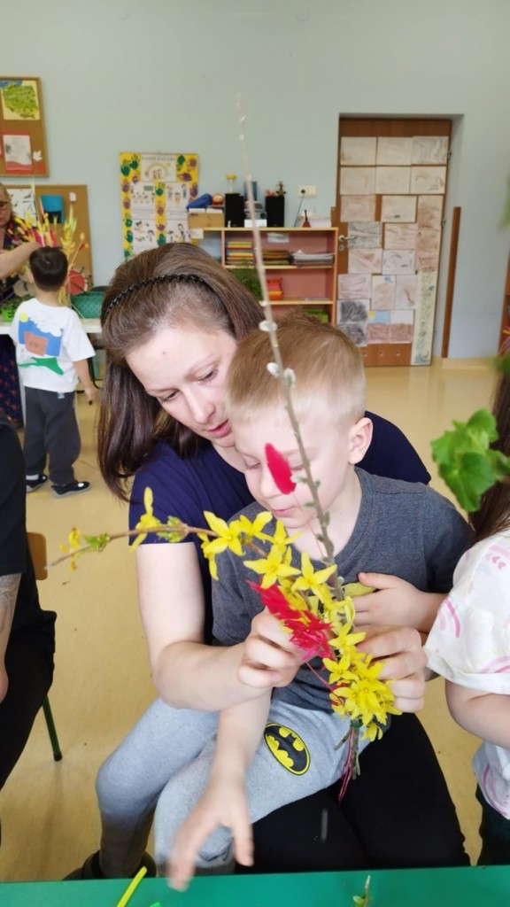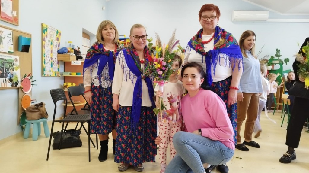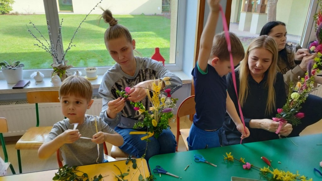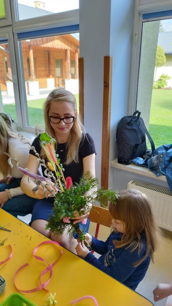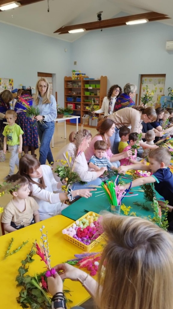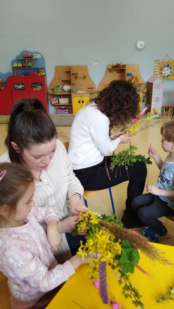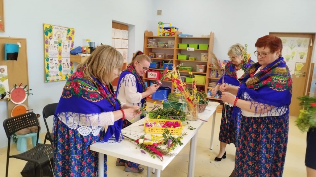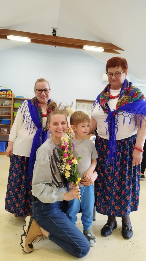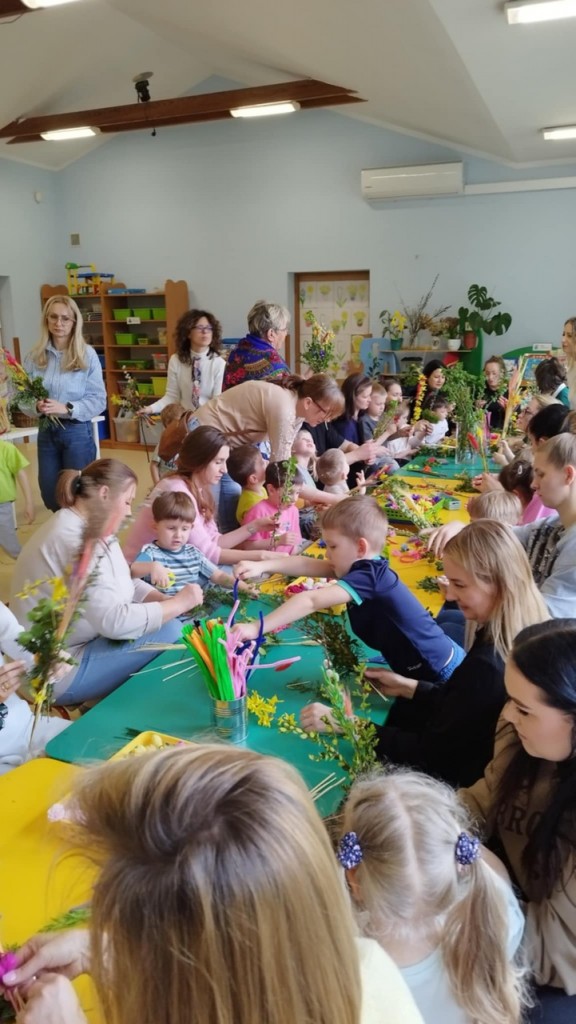 Dnia 8 kwietnia podczas zajęć otwartych z naszymi rodzicami mieliśmy zaszczyt i przyjemność gościć Panie z Koła Gospodyń Wiejskich z Koroszczyna. Panie przybliżyły nam tradycje ludowe związane ze Świętami Wielkanocnymi oraz wyjaśniły z czego i jak powinno się tworzyć palmę wielkanocną. Następnie wspólnie z rodzicami pod czujnym okiem „Ekspertów” wykonywaliśmy palmy. Wyszły przepiękne, kolorowe, każda inna i niepowtarzalna…A na zakończenie pięknie podziękowaliśmy i wręczyliśmy małe upominki dla naszych gości. Pięknie dziękujemy Paniom za odwiedziny w naszej grupie i podzielnie się z nami swoją wiedzą na temat zwyczajów ludowych.