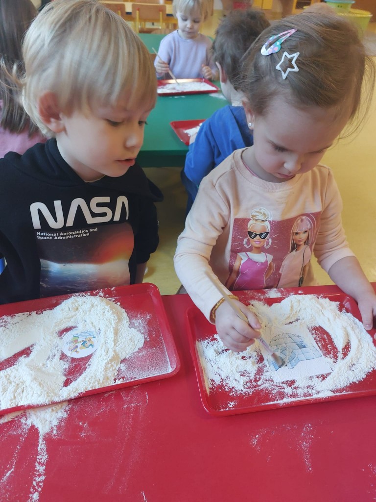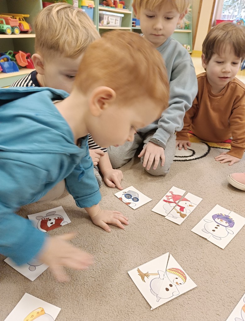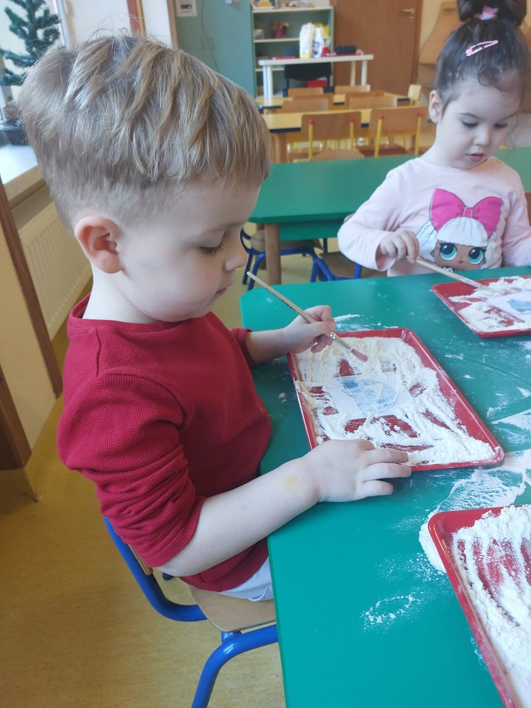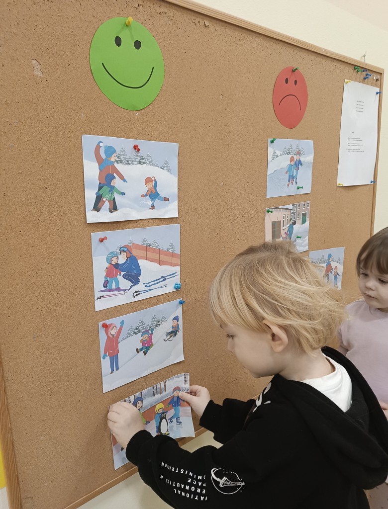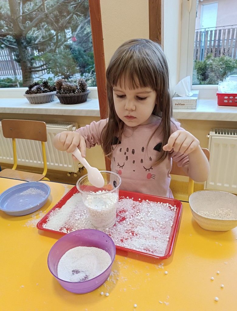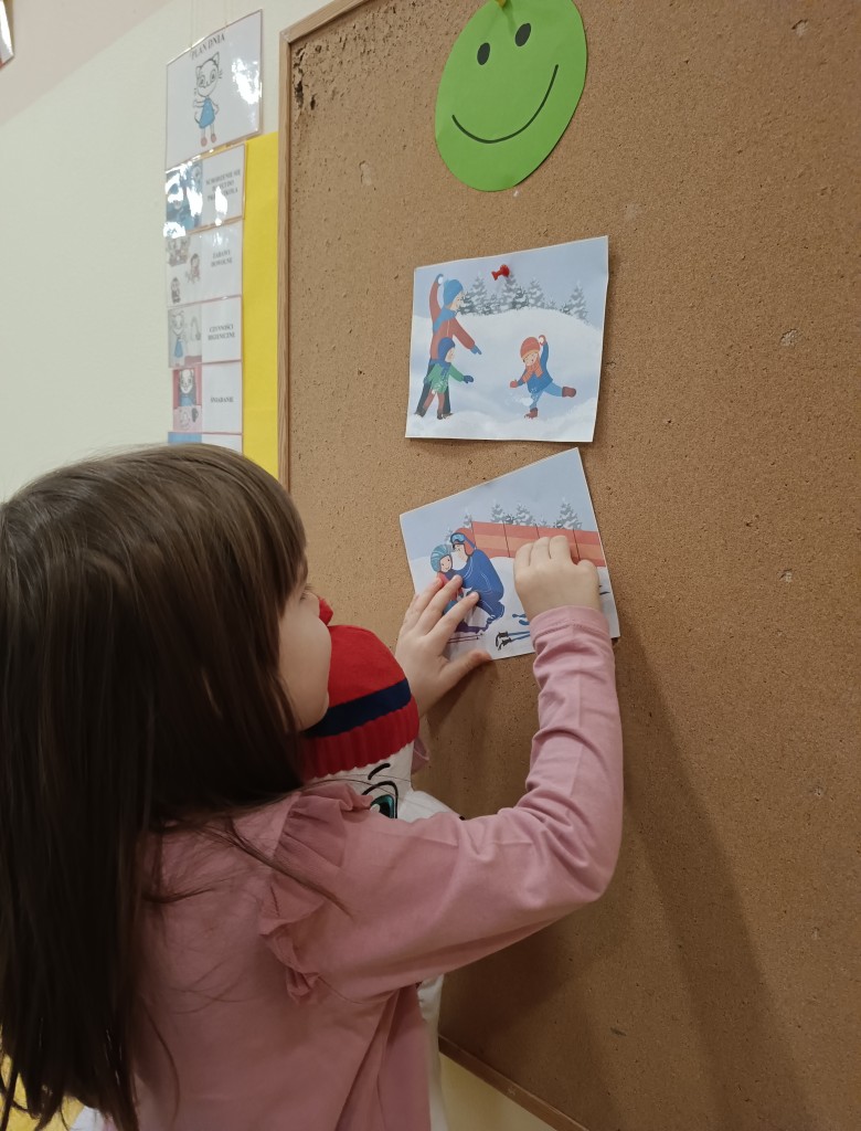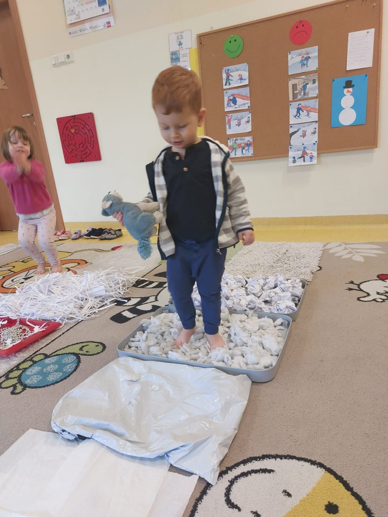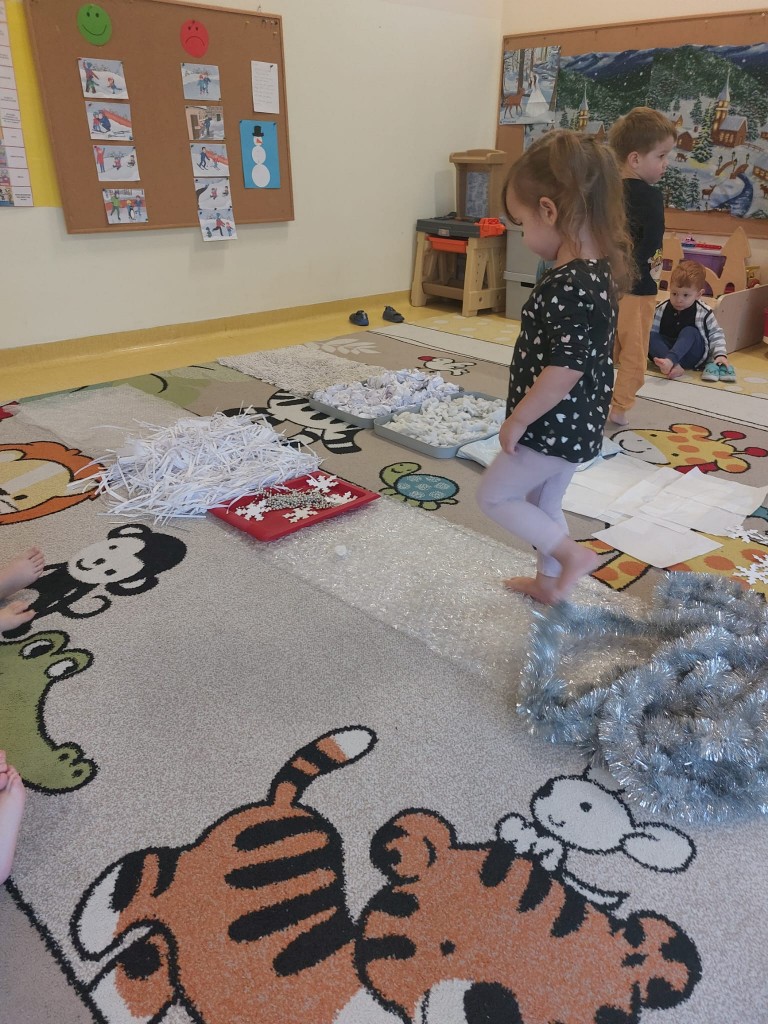 W minionym tygodniu dzieci realizowały temat związany z zimowymi zabawami. Tydzień zaczęliśmy zajęciami o tym,jak bezpiecznie bawić się zimą. I choć za oknem śniegu brak,my stworzyliśmy zimowa atmosferę w naszej sali. Dzieci spacerowały po ścieżce sensorycznej, zabawiliśmy się w zimowe odśnieżanie. Usypaliśmy bałwanki z różnych materiałów sypkich przy okazji ćwicząc sprawność małych rączek. W oparciu o wiersz D. Kossakowskiej dzieci "ulepily" bałwana. Nie zabrakło również zabaw rytmiczno-ruchowych oraz spacerów na świeżym powietrzu.