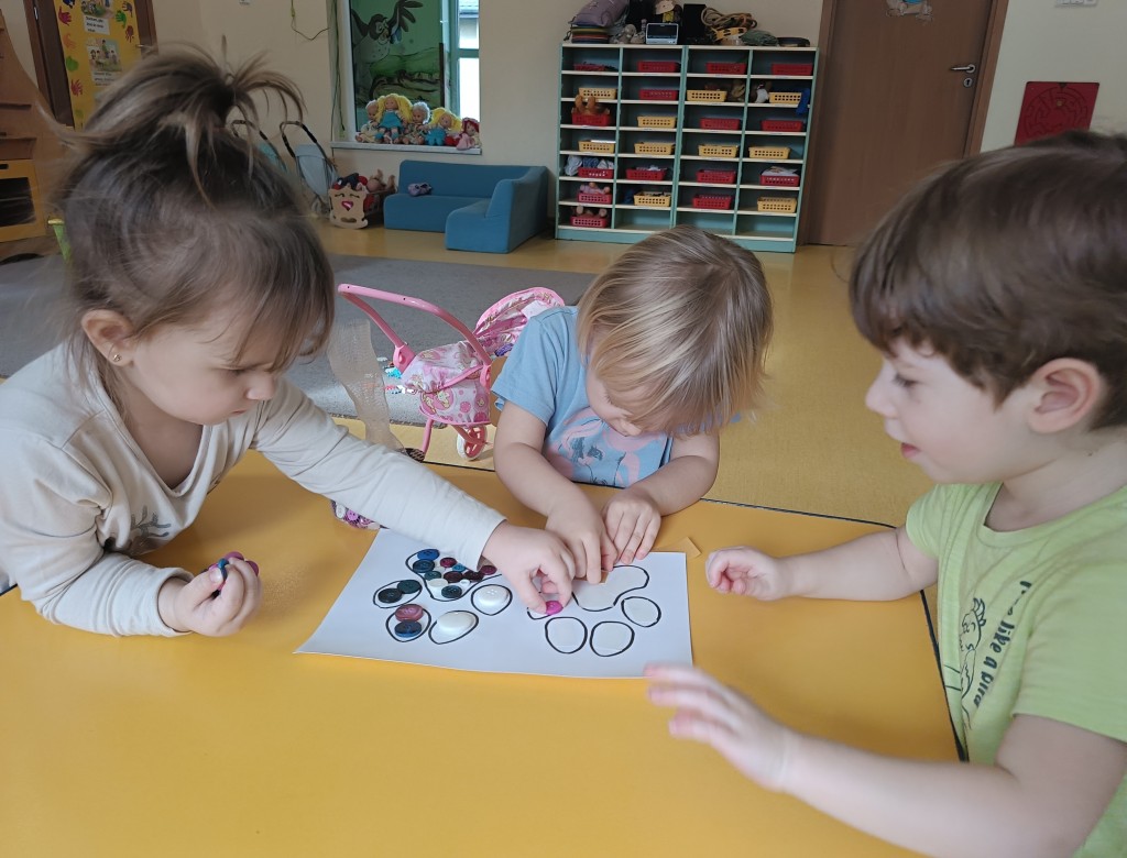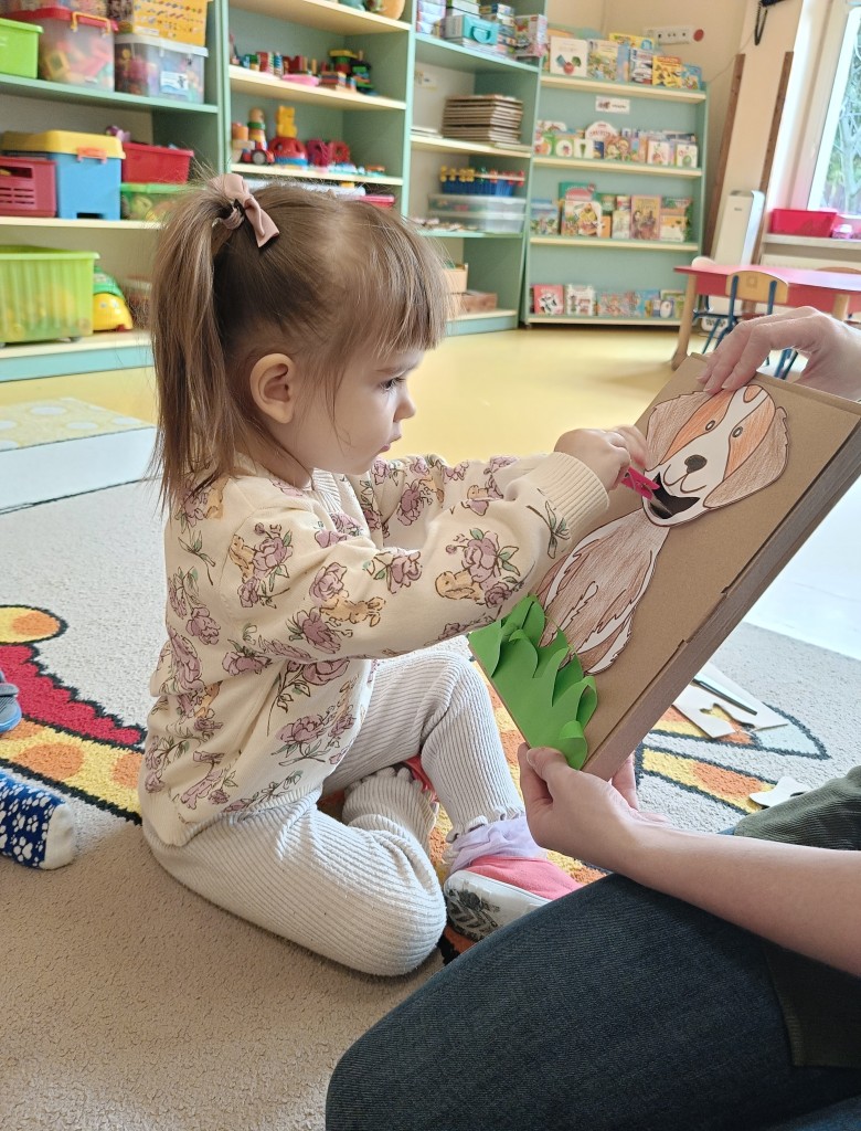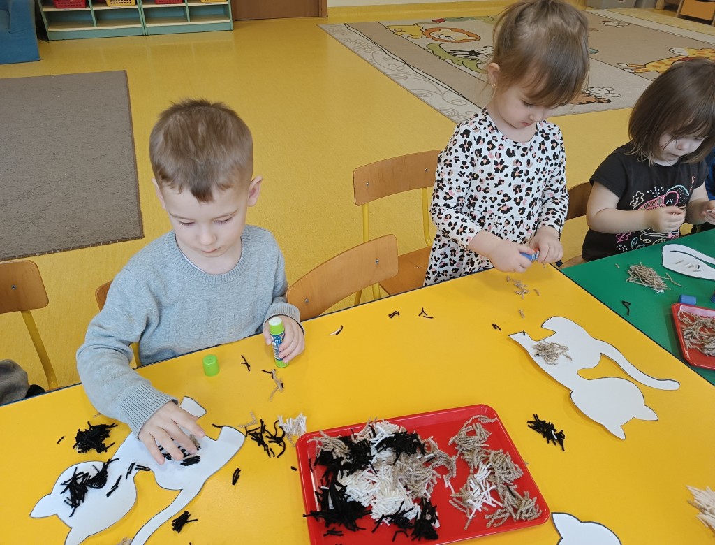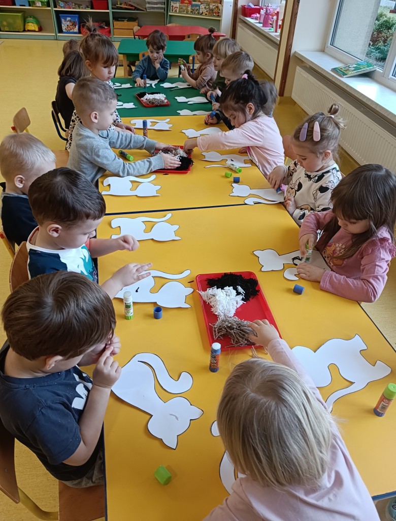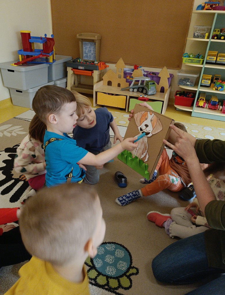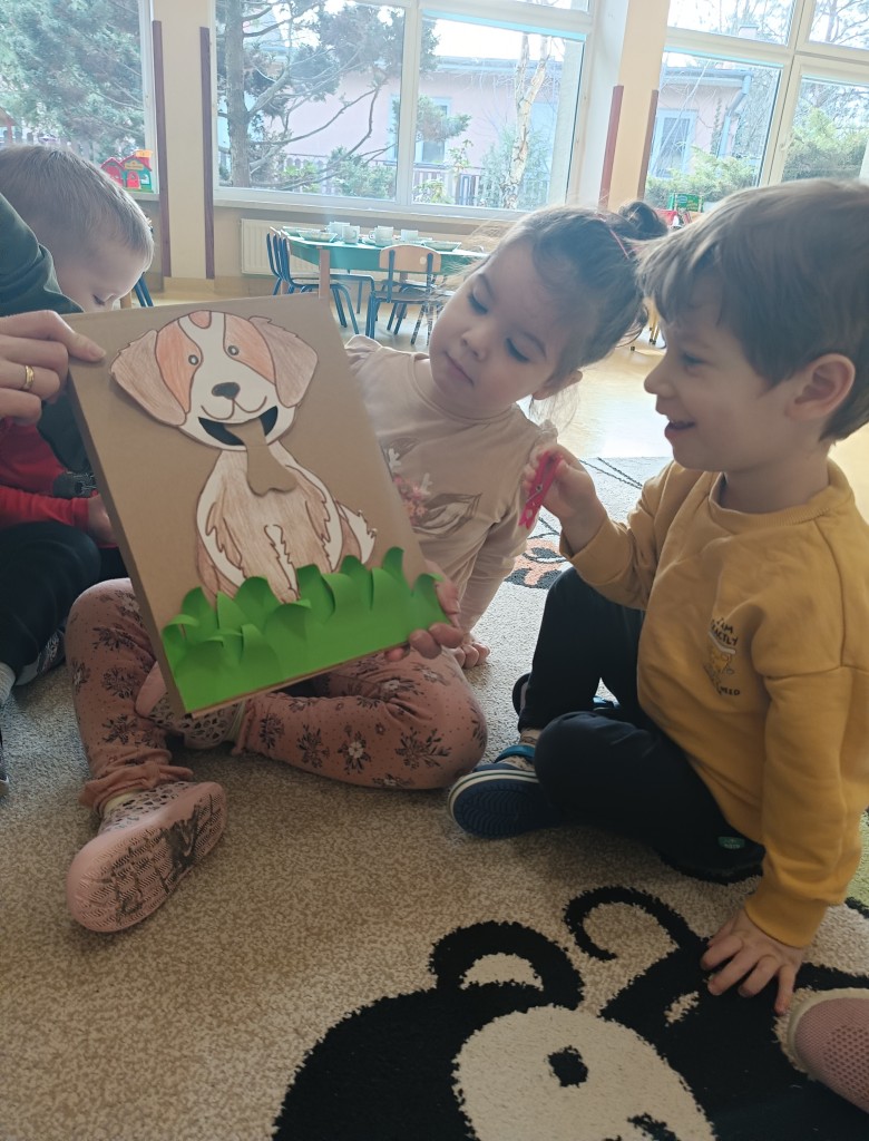 Nasze najmłodsze przedszkolaki poznawały zwierzęta mieszkające w domu. Mówiły o swoich marzeniach posiadania własnego zwierzątka. Dowiedziały się jakie potrzeby i zwyczaje mają zwierzęta mieszkające w domu, a także w jaki sposób należy codziennie opiekować się i dbać o swoich pupili. Maluszki chętnie naśladowały zwierzątka, oraz ćwiczyły sprawność małych rączek. Na zakończenie całego tygodnia wykonały pracę plastyczną- kotka.