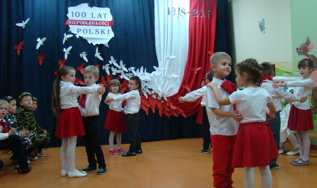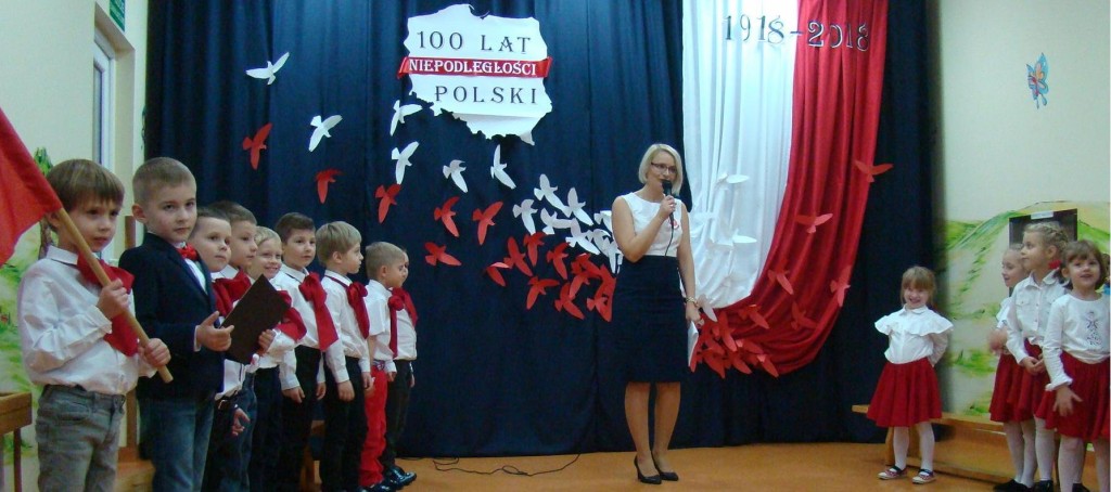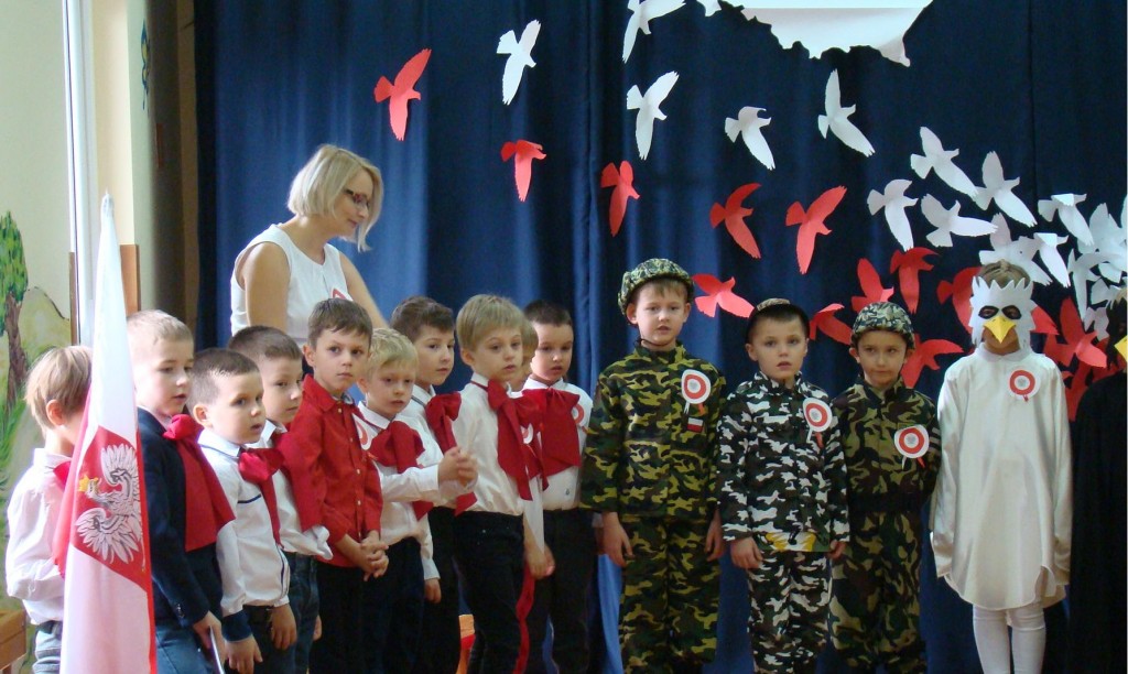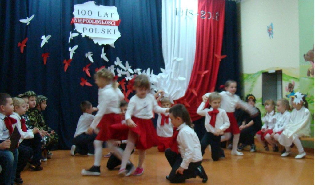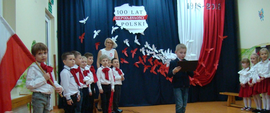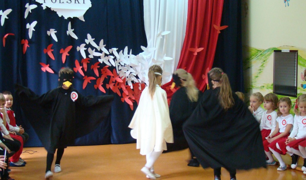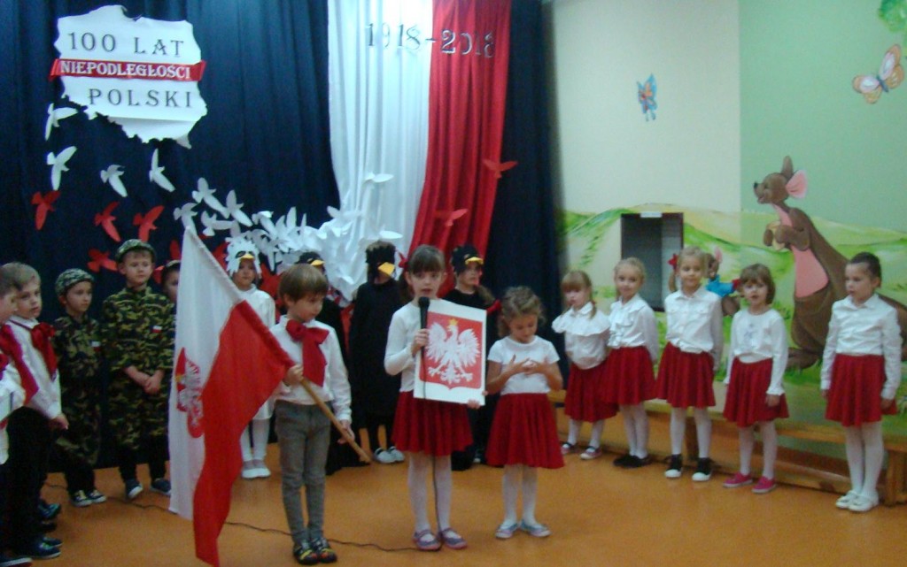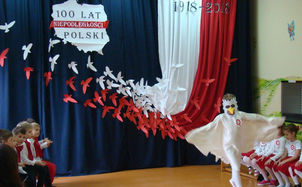 Dzień 11 listopada to niezwykle ważna data dla każdego Polaka - to dzień, kiedy nasza ojczyzna odzyskała wolność po wielu latach niewoli. W tym roku jest to szczególna rocznica ponieważ obchodzimy ją po raz setny. Z tej okazji 9 listopada w murach naszego przedszkola odbyła się uroczysta akademia z okazji Święta Niepodległości, przygotowana przez grupę 6 latków. Podczas występu dzieci recytowały wiersze patriotyczne i śpiewały pieśni opowiadające o historii Polski, ale także te tłumaczące sens współczesnej polskości oraz ukazujące piękno naszej ojczyzny. Wielkie wrażenie wywarła na dzieciach improwizacja taneczna w wykonaniu dzieci przebranych za ptaki, symbolizujące Polskę oraz trzech zaborców. Atmosfera podczas uroczystości była bardzo podniosła i niezwykle wzruszająca. Warto docenić wysiłek naszych kochanych przedszkolaków. Przedstawiły one trudne treści historyczne w sposób bardzo przystępny dla swoich młodszych kolegów i koleżanek. Ale przede wszystkim przypomniały, jak wielkim darem jest życie w wolnej Ojczyźnie. Niektórym dorosłym zakręciła się łza w oku na widok małych patriotów. Z tego młodego pokolenia Polaków naprawdę możemy być dumni. I jesteśmy. Dziękujemy!