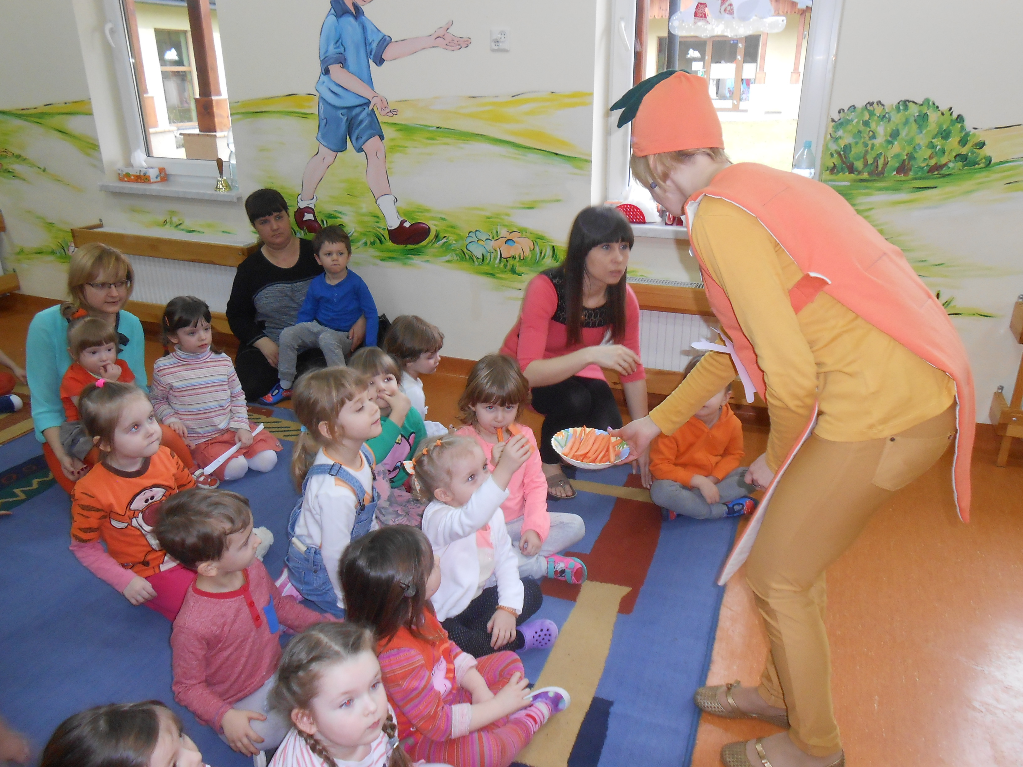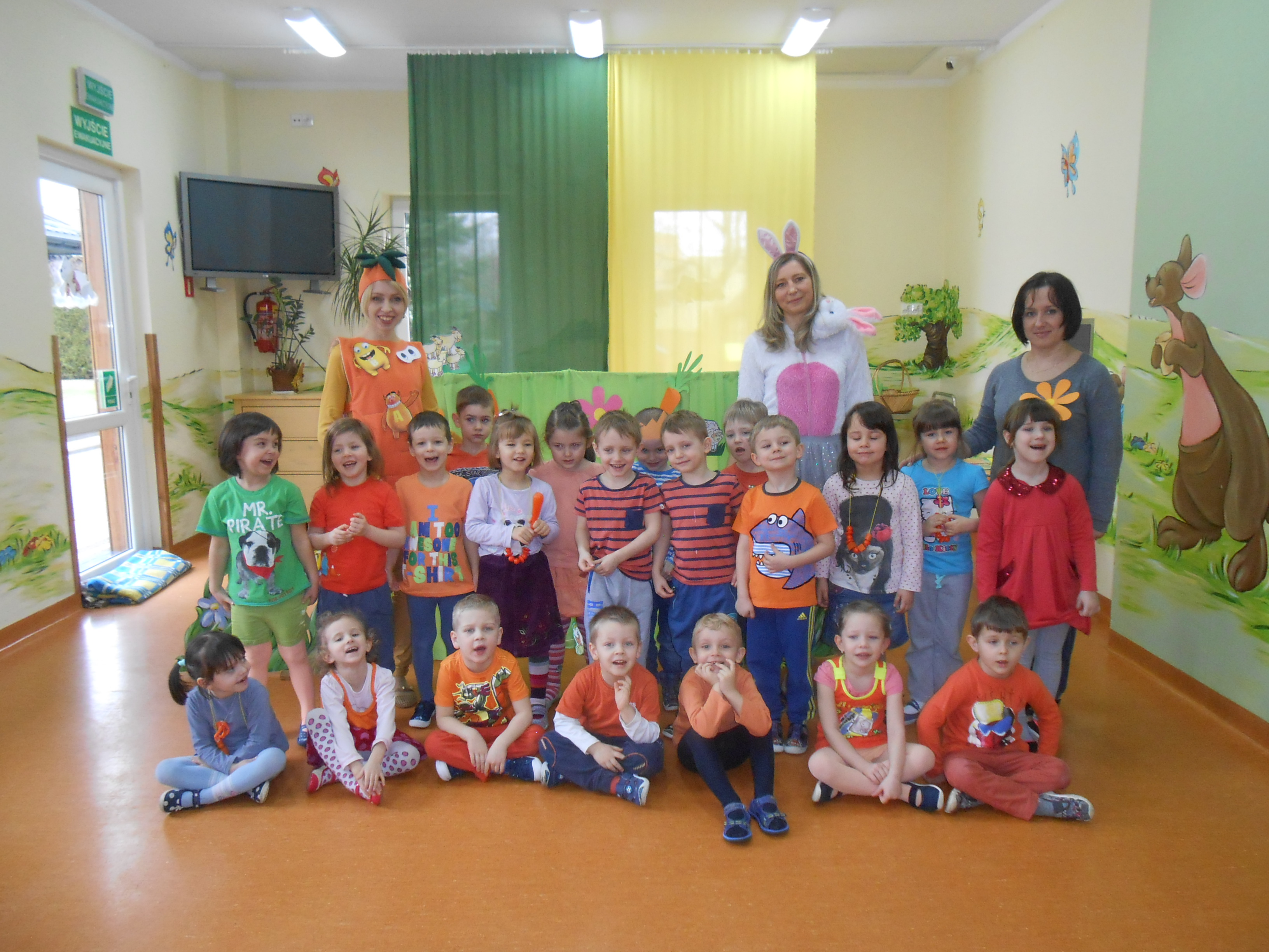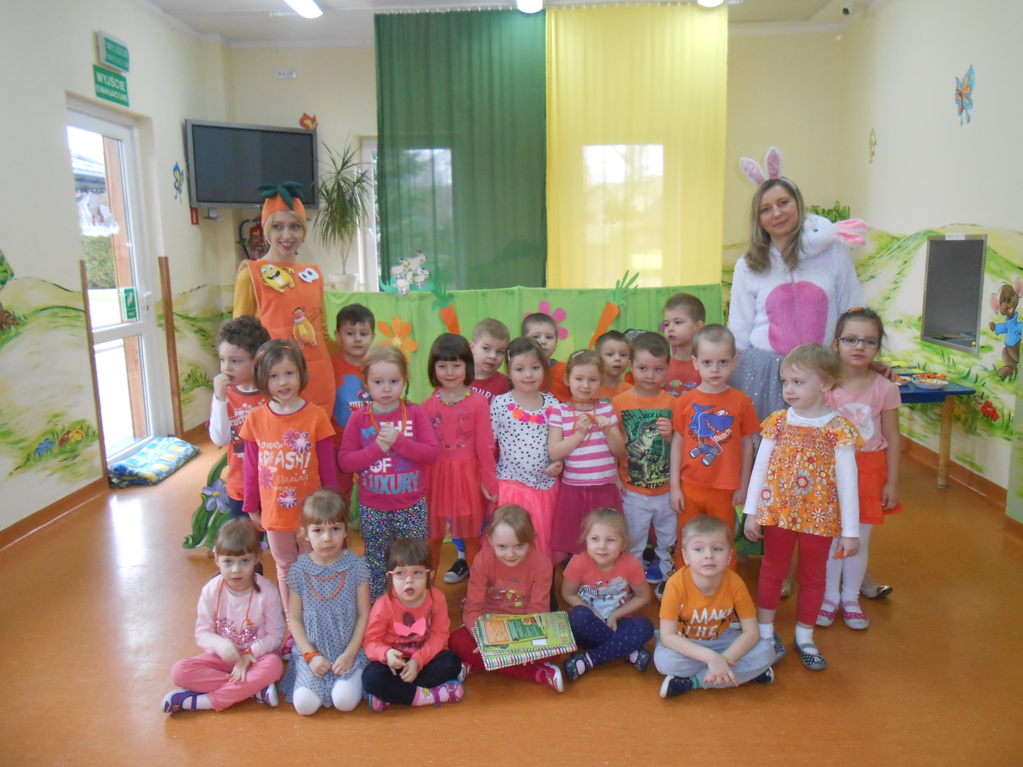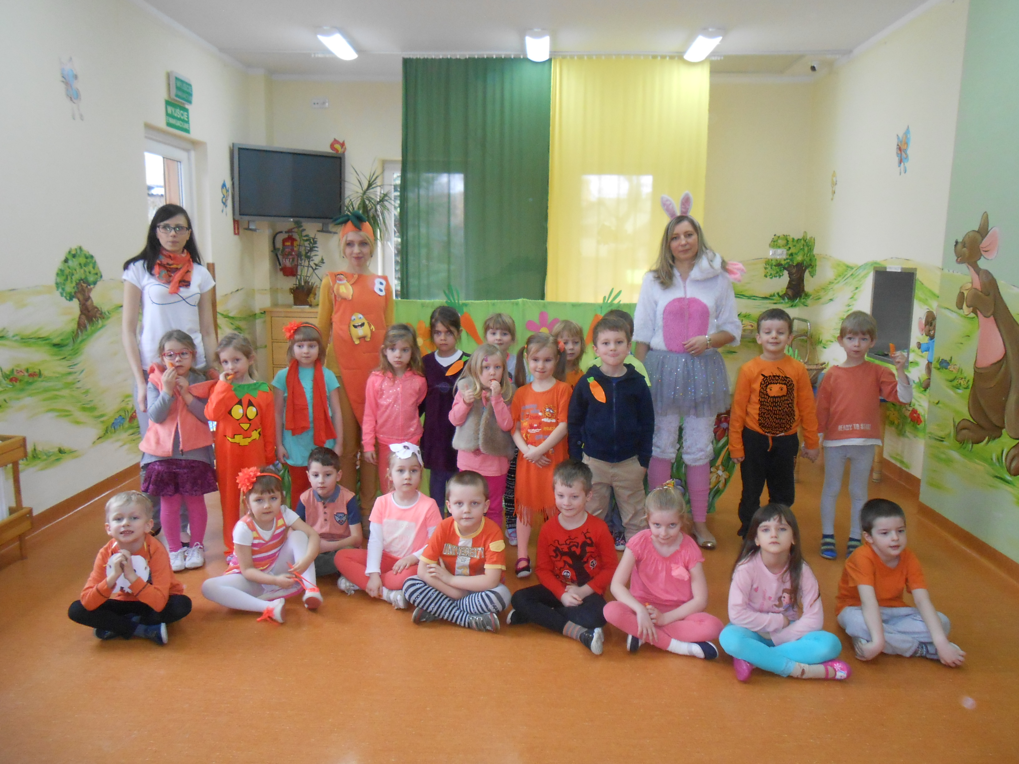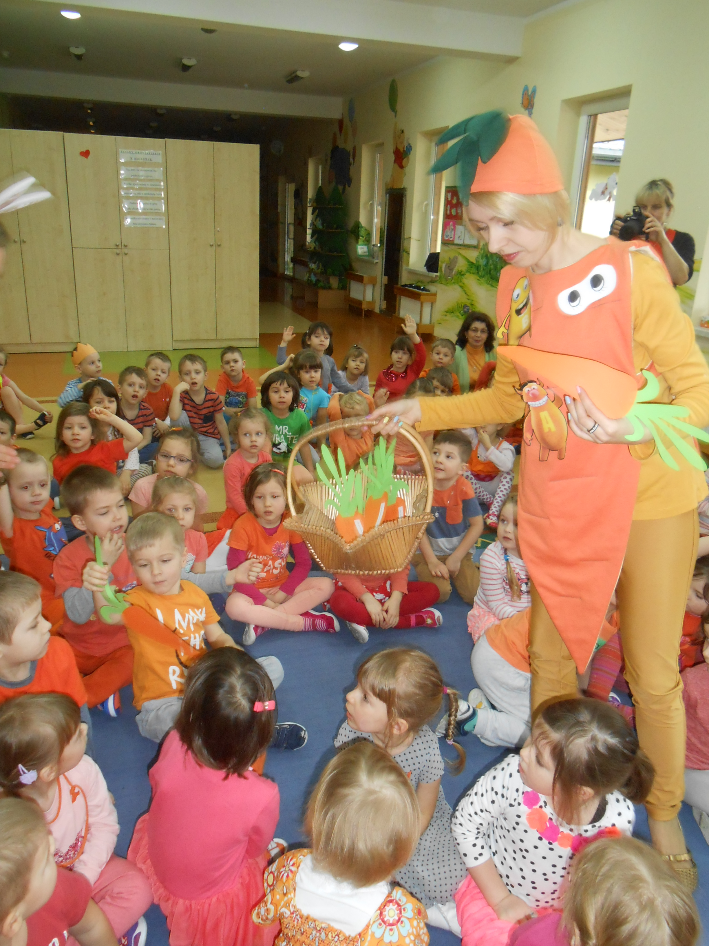 Drugi tydzień marca poświęcony był realizacji programu "Kubusiowi Przyjaciele Natury". W ciągu tego tygodnia, poznawaliśmy zasady zdrowego odżywiania. Szczególnie uroczyście obchodziliśmy "Dzień Marchewki" podczas którego, każdy przedszkolak ubrany był na pomarańczowo. Marchewkowa impreza przypomniała dzieciom o korzyściach płynących ze spożywania tego warzywa. Dzieci poszerzyły swoją wiedzę na temat budowy i wyglądu marchewki, a także dowiedziały się, iż jest ona przysmakiem wielu zwierząt. Okazało się także, że przedszkolaki znają mnóstwo marchewkowych potraw. Zdobytą wiedzę, miały okazję zaprezentować podczas quizu. Zwieńczeniem imprezy była degustacja słodkiej i chrupiącej marchewki. Na pamiątkę wspólnego świętowania, każde dziecko otrzymało książeczkę "Kubusiowi Przyjaciele Natury", dzięki której utrwalą zdobytą wiedzę i będą pamiętać o spożywaniu tego smaczenego i zdrowego warzywa.