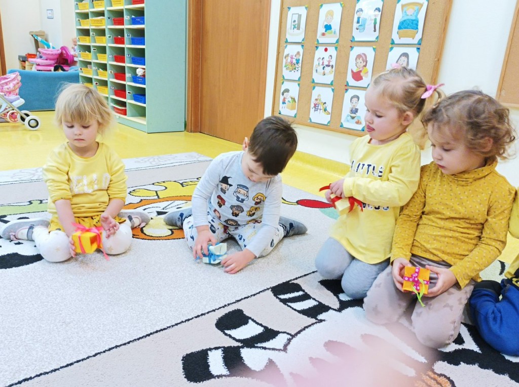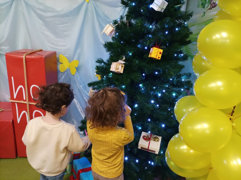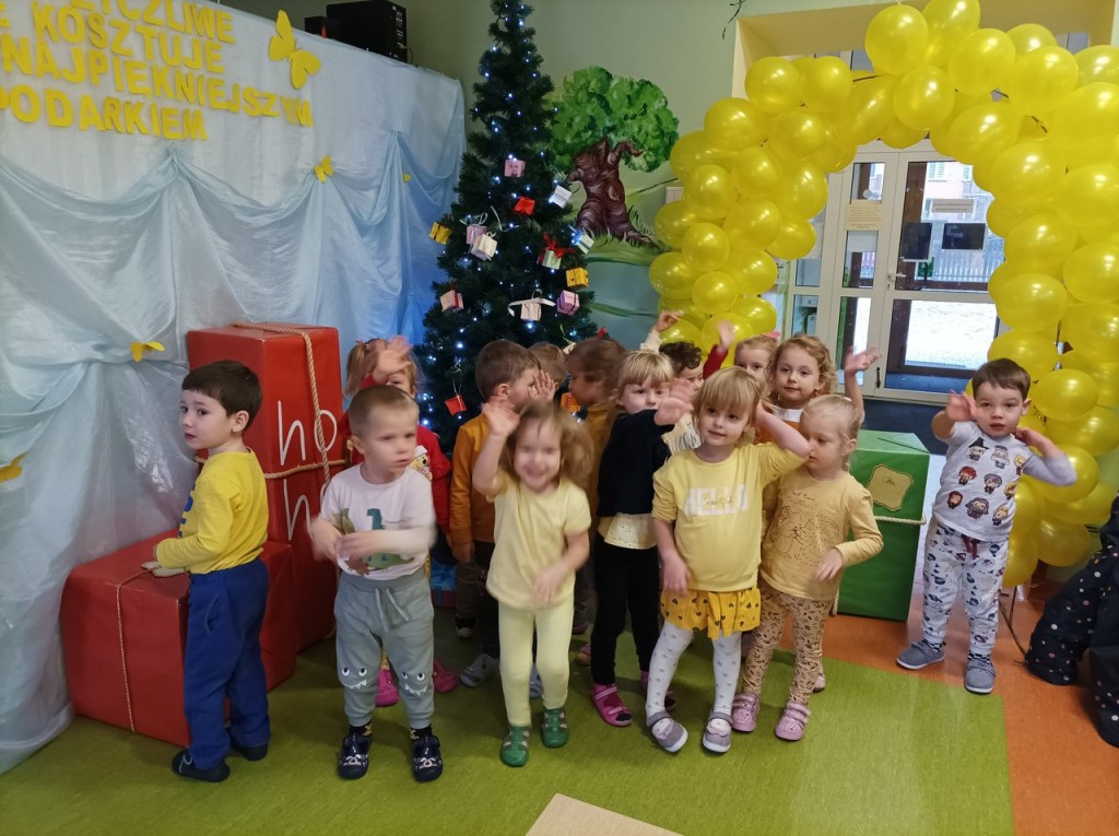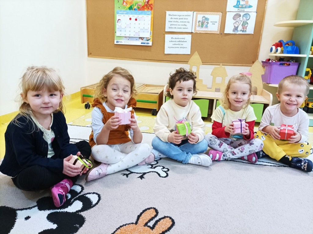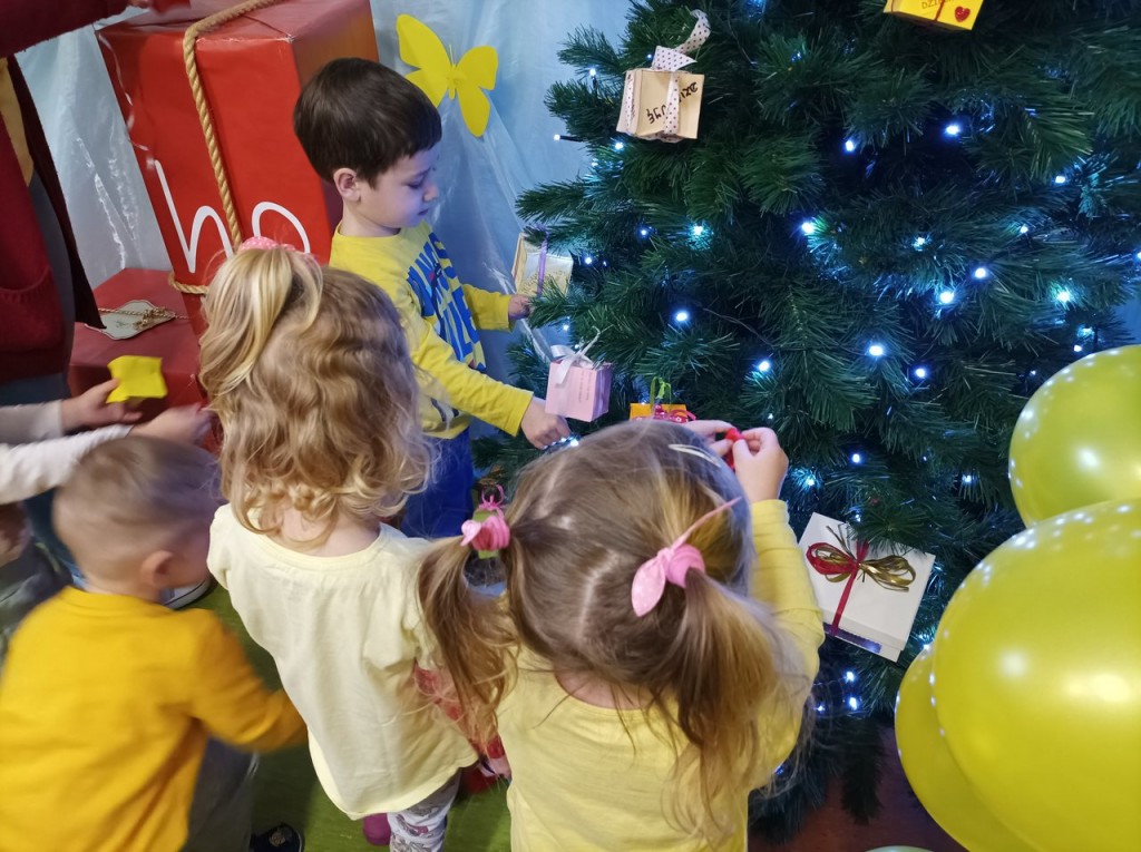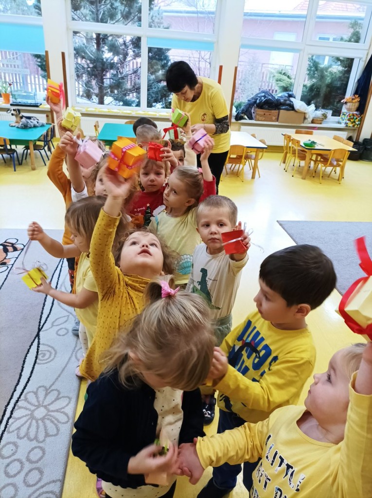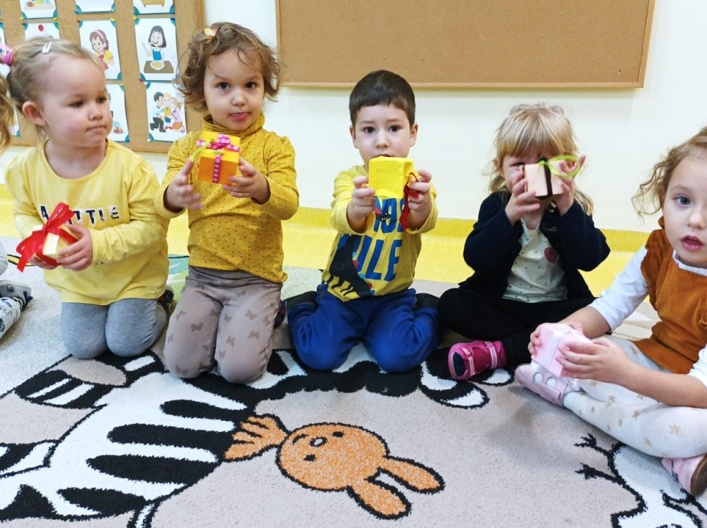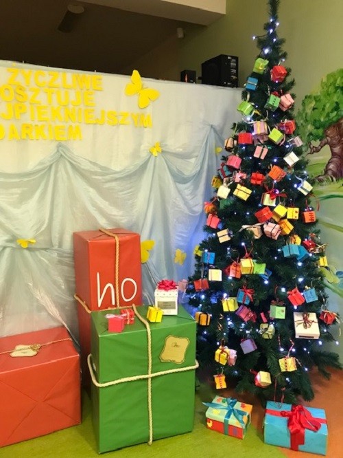 Efektem zaangażowania rodziców i dzieci były pudełeczka - prezenty wykonane w domu. Były to niezwykłe pudełeczka - na każdej ściance widniało dobre słowa. Pudełeczka te ozdobiły choinkę w holu przedszkola. Za każdym razem kiedy popatrzyliśmy na nią przypominaliśmy sobie, że nie trzeba mieć wiele aby kogoś obdarować wartościowym "prezentem".