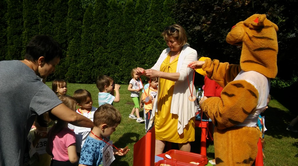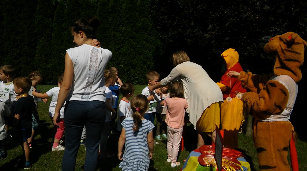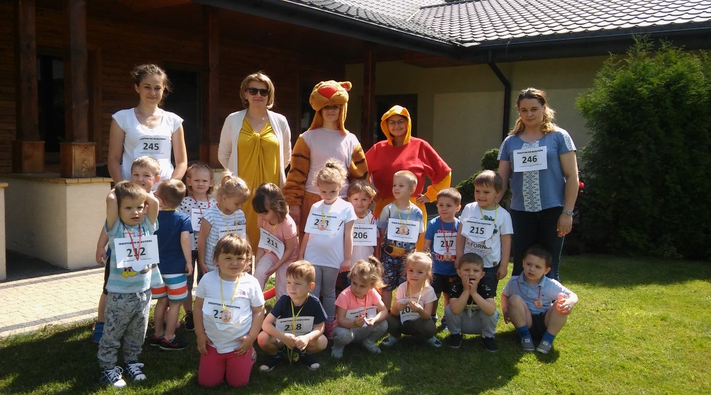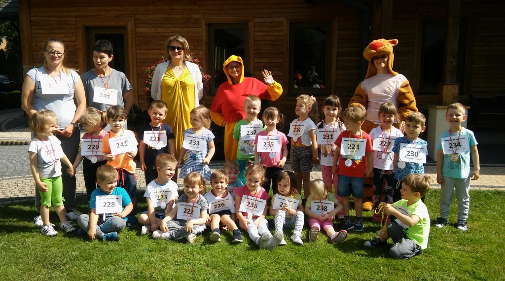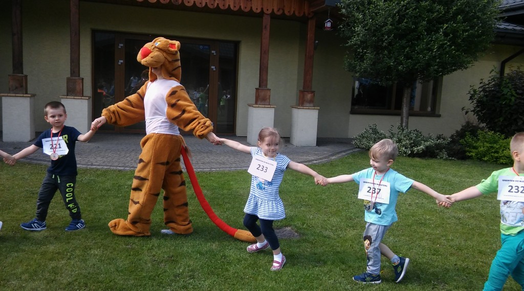 Impreza rozpoczęła się serdecznym powitaniem dzieci przez Panią dyrektor. Następnie każda z grup zaprezentowała rymowankę promującą aktywność ruchową, przygotowaną specjalnie na tę okazję. Wszyscy uczestnicy, na czele z przyjacielem ze Stumilowego Lasu – Tygryskiem, rozgrzali się przed biegiem. Kiedy nadszedł czas biegu grupy ustawiły się na linii startu. Każdy uczestnik maratonu pokonał trasę 50 m, co łącznie dało wynik 2250 m. Uwieńczeniem naszego biegu było wręczenie przez Panią dyrektor i patrona naszego przedszkola - Kubusia Puchatka pamiątkowych medali.