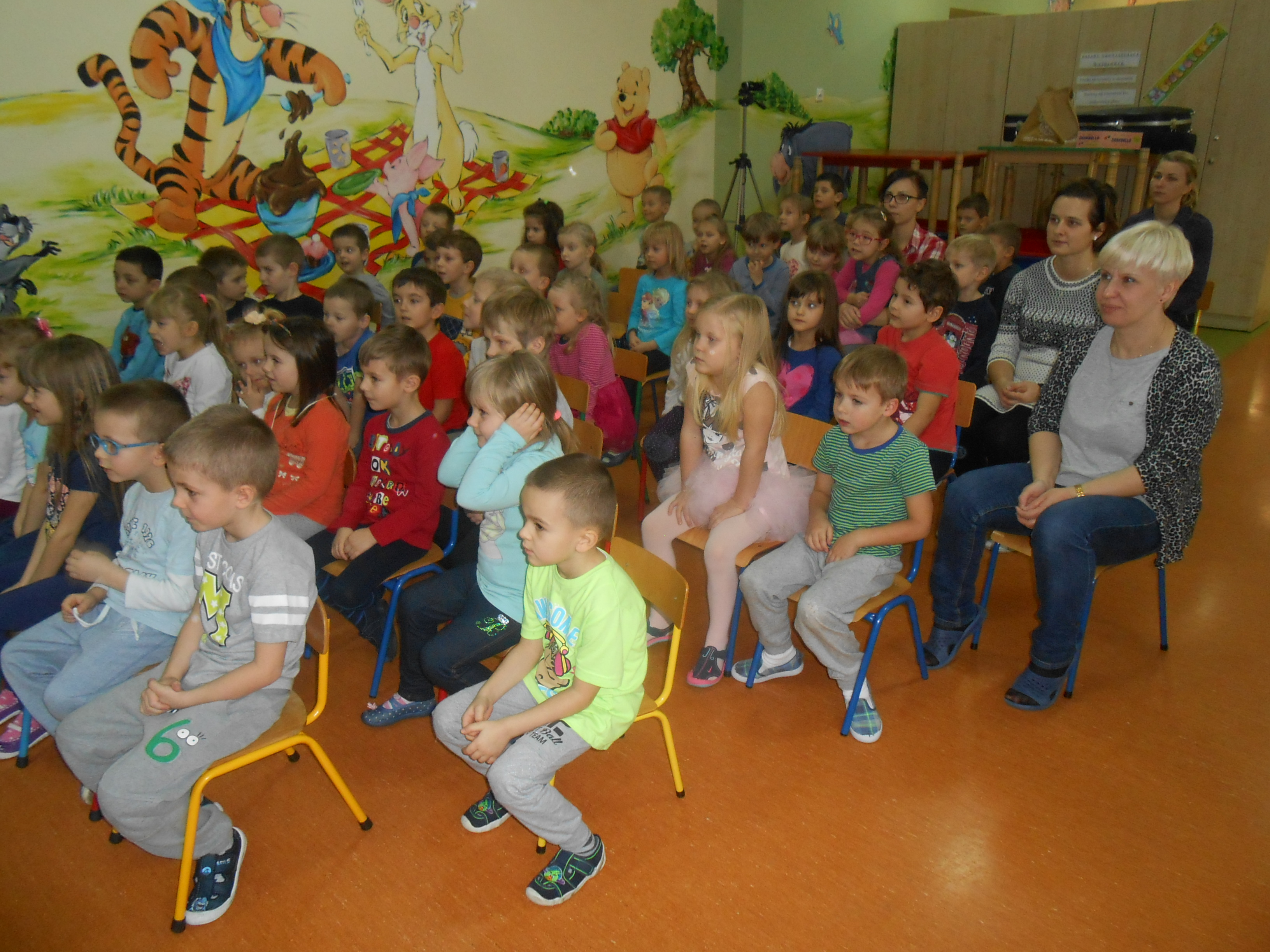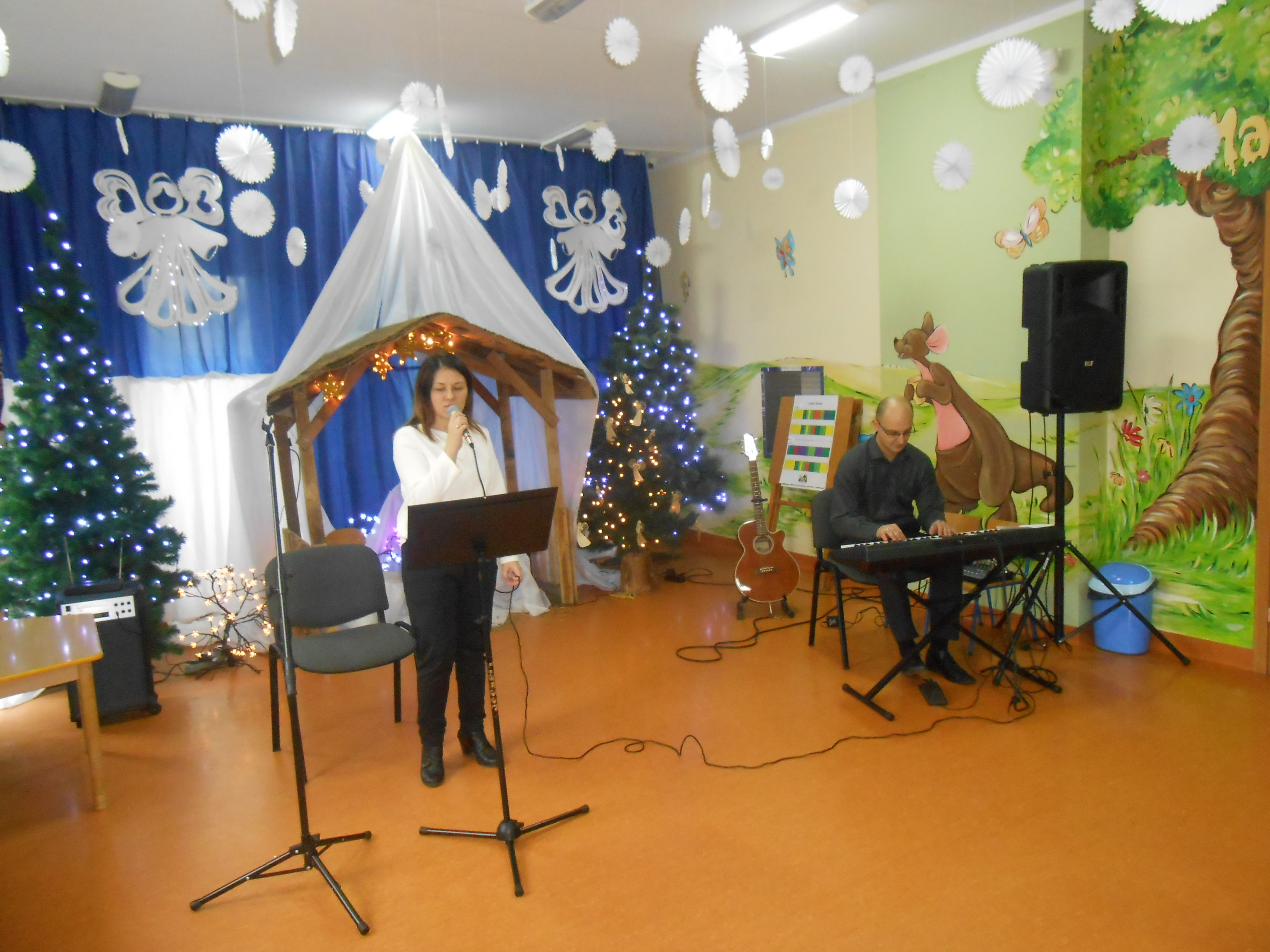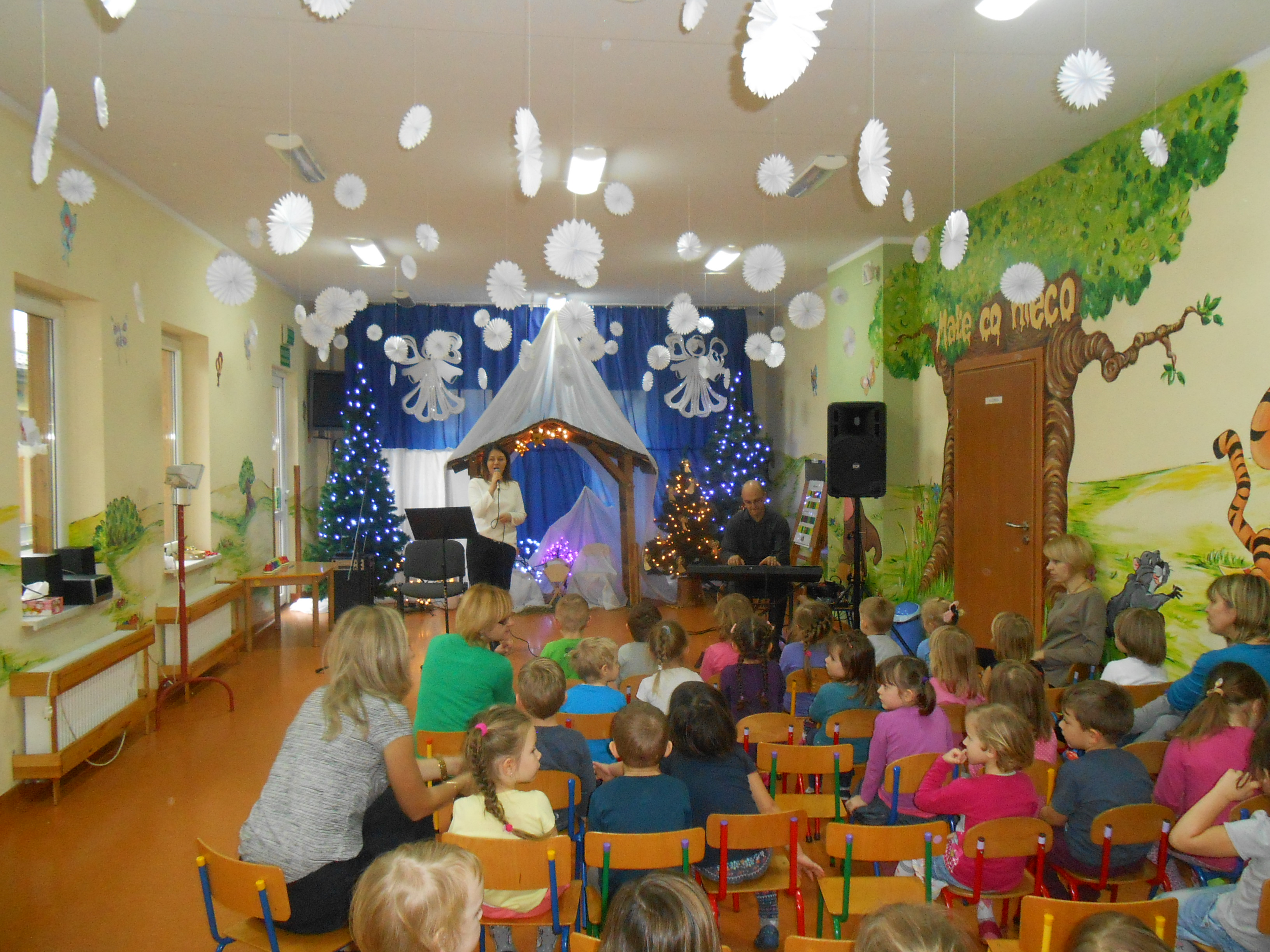 Wspólne śpiewanie kolęd to jeden z najpiękniejszych zwyczajów Bożego Narodzenia. Już od kilku lat odbywa się w naszym przedszkolu Koncert Kolęd i Pastorałek prowadzony przez instruktora rytmiki pana Mateusza wraz z żoną. Podczas koncertu można było usłyszeć najbardziej lubiane interpretacje kolęd i pastorałek. Przedszkolaki odgadywały tytuły oraz śpiewały znane im kolędy. Mali artyści wykonali również kolędę na dzwonkach a ich wysiłek został doceniony wielkimi brawami. Serdecznie dziękujemy Panu Mateuszowi i Pani Kindze za wspólne kolędowanie.