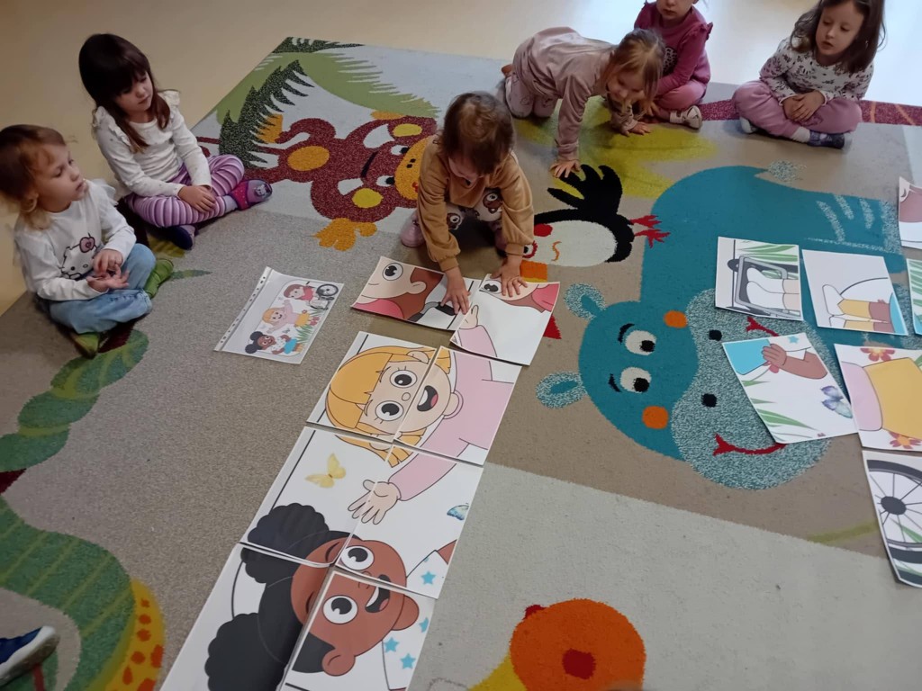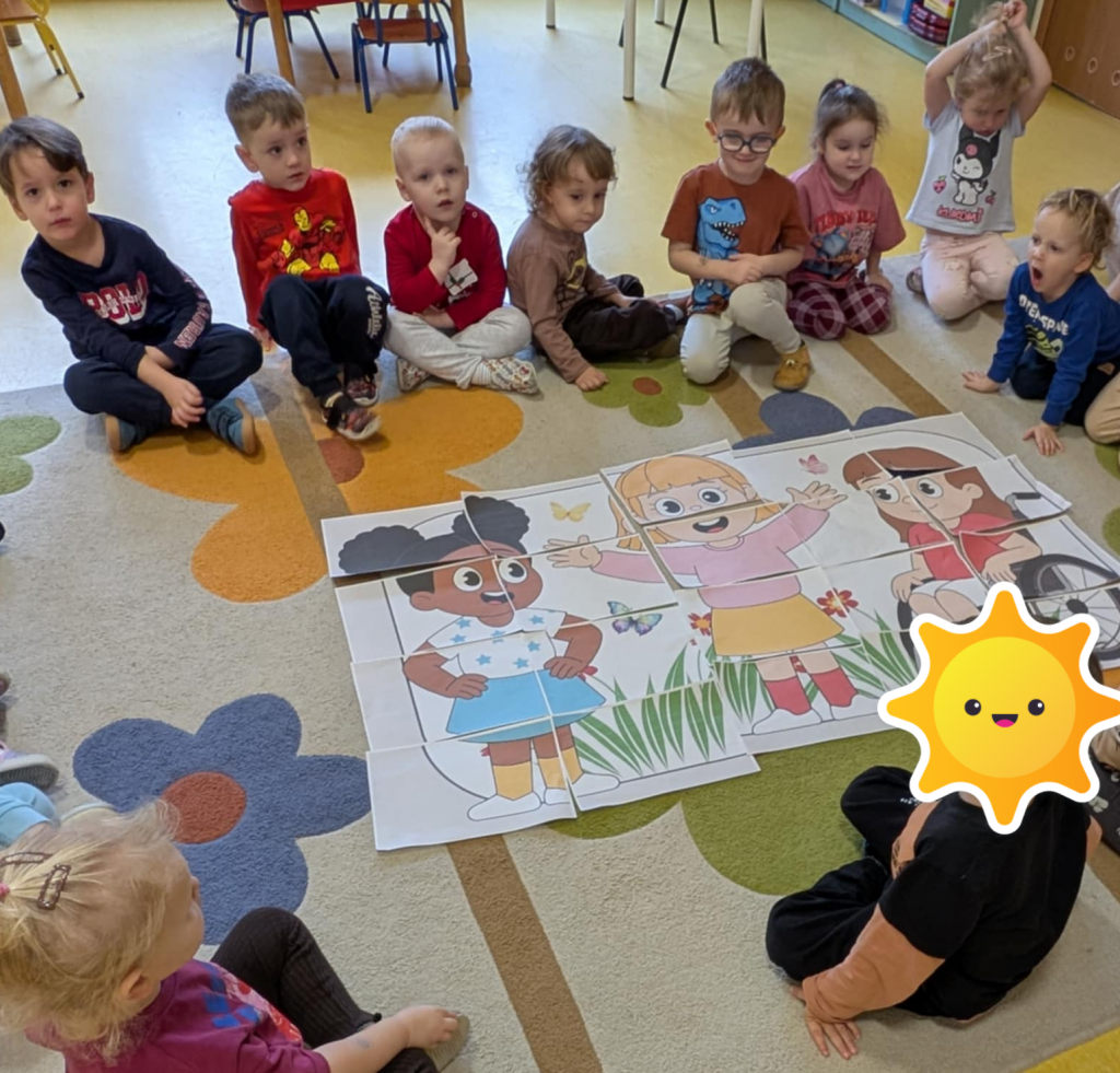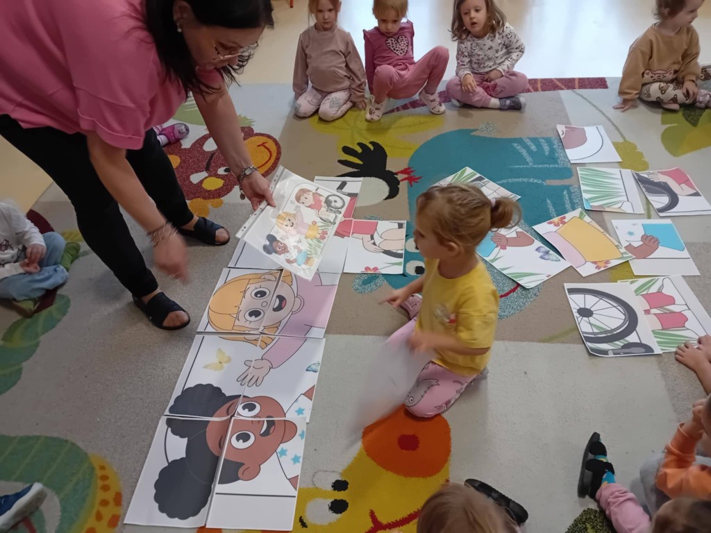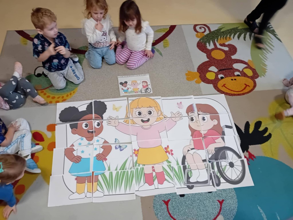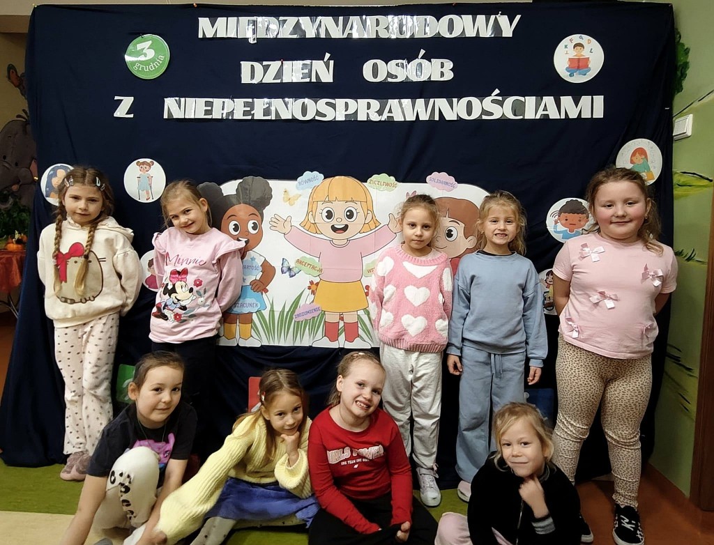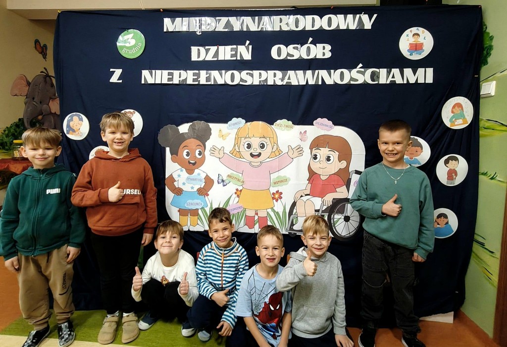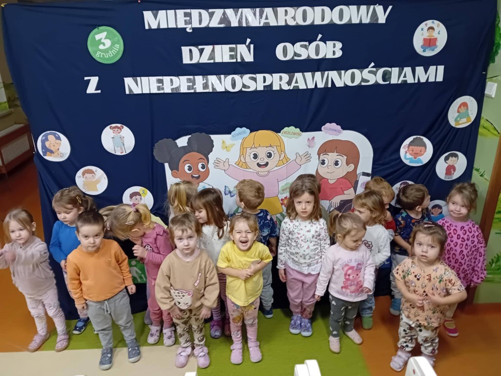 3 grudnia obchodziliśmy Międzynarodowy Dzień Osób Niepełnosprawnych. Nasi nauczyciele wspierający wraz z pedagogiem specjalnym i psychologiem, w dostosowany do możliwości dzieci sposób poruszyli zagadnienia różnych niepełnosprawności. Podczas tych działań dzieci wykazały się bogatą wiedzą w tym zakresie oraz wysokim poziomem empatii. Empatia ta jest bardzo mocno widoczna podczas codziennych kontaktów z dziećmi niepełnosprawnymi, które uczęszczają do przedszkola.