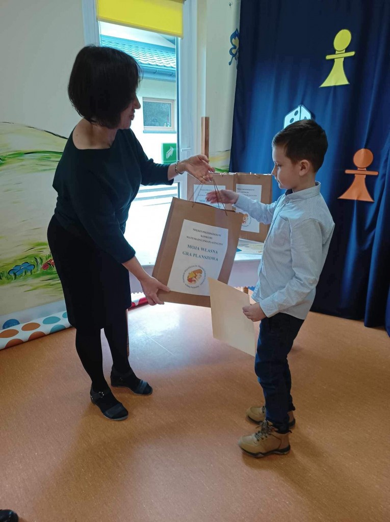 Międzyprzedszkolny konkurs matematyczno - plastyczny pt. "Moja własna gra planszowa" został rozstrzygnięty. Laureaci konkursu otrzymali pamiątkowe dyplomy oraz nagrody. Zwieńczeniem naszej uroczystości były wspólne zabawy matematyczne do których zaprosiły laureatów dzieci z naszego przedszkola z II grupy 5 latków.
