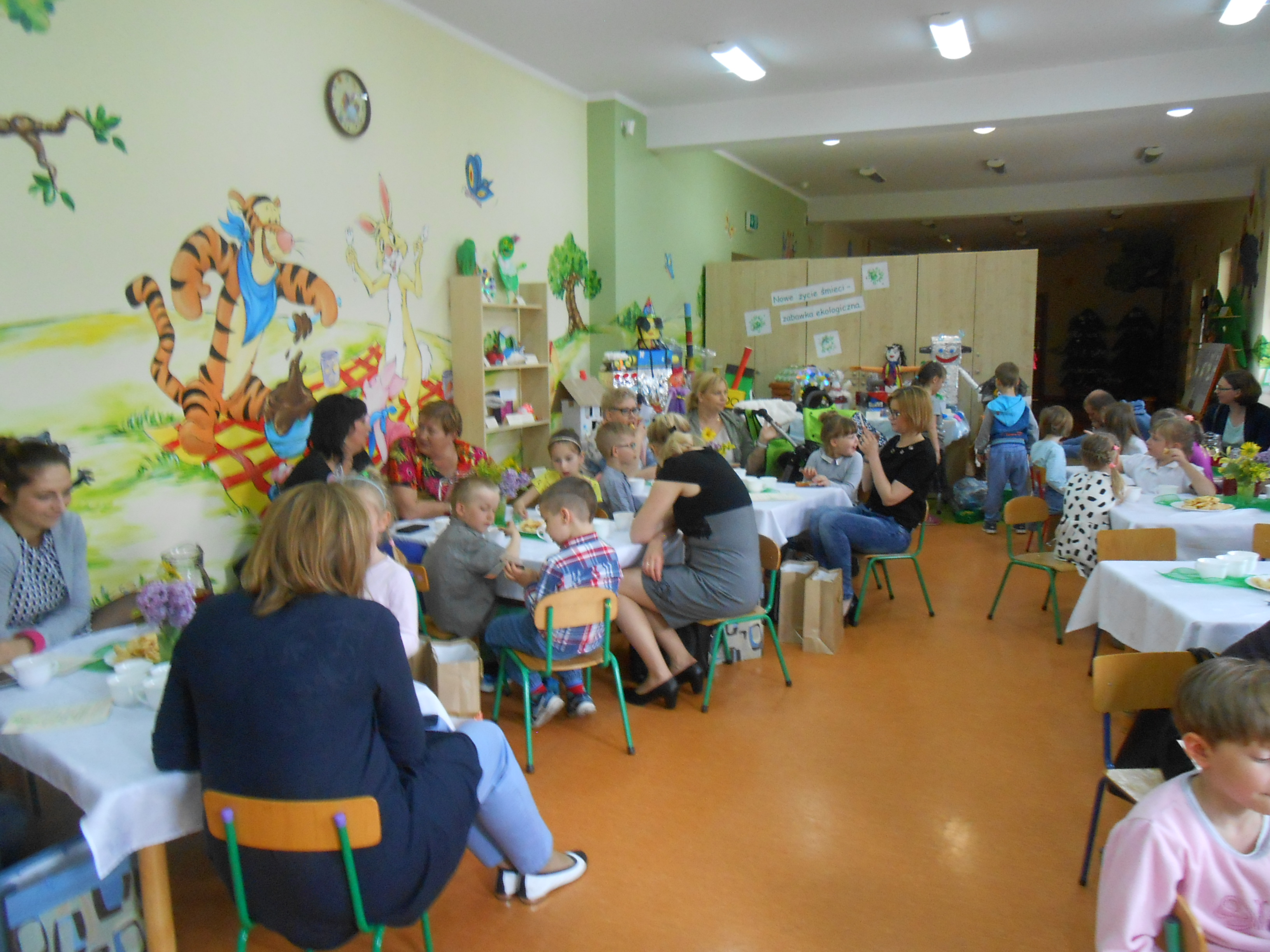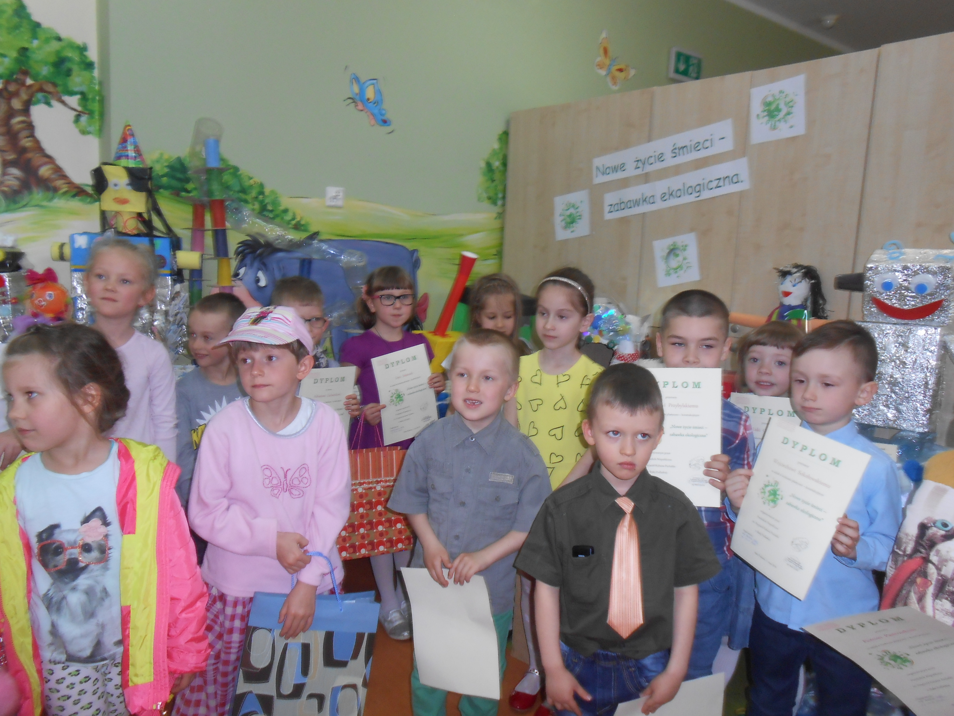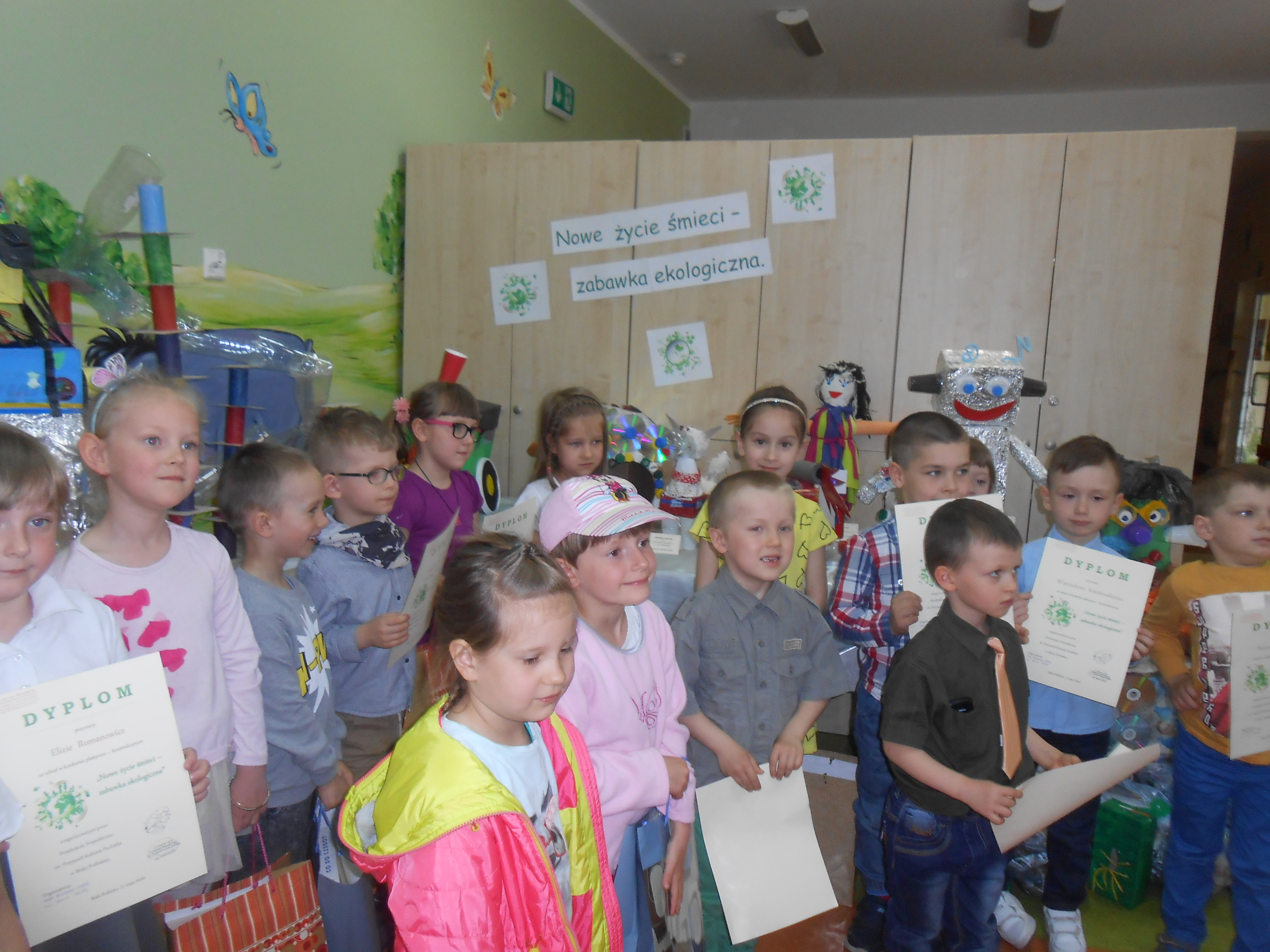 11 maja odbyło się w naszym przedszkolu rozstrzygnięcie między przedszkolnego konkursu plastyczno - konstrukcyjnego, którego byliśmy organizatorami. Celem jego było kształtowanie właściwych postaw związanych z ochroną środowiska wśród najmłodszych oraz rozwijanie umiejętności wykorzystywania materiałów wtórnych do działań konstrukcyjnych. W konkursie wzięły udział dzieci z dziesięciu przedszkoli z terenu naszego miasta. Dzieci wraz ze swoimi opiekunami wykazały się olbrzymią kreatywnością i wykonały przepiękne prace, wykonane różnymi technikami. Można było podziwiać min. roboty, lalki, karuzelę, budę, psa i wiele innych. Wszystkie dzieci biorące udział w konkursie zostały nagrodzone, a impreza została uświetniona występem nauczycieli naszego przedszkola, którzy przygotowali przedstawienie pod hasłem "Szanuj lasy". Zwieńczeniem imprezy był słodki poczęstunek i wspólne zdjęcia.