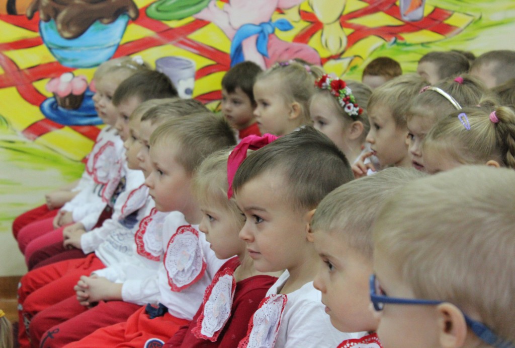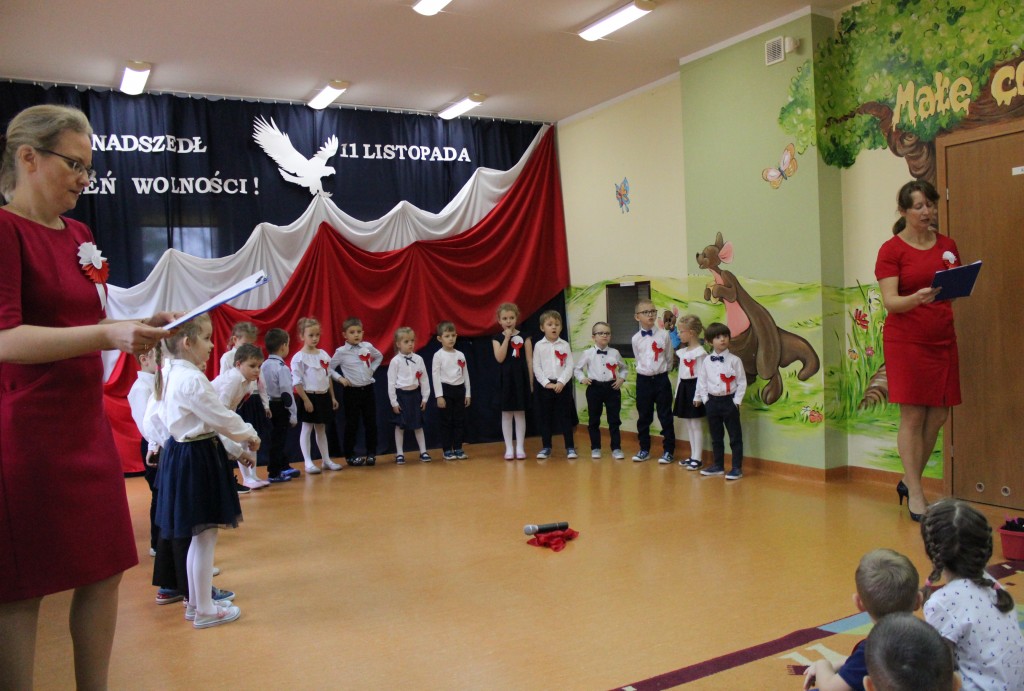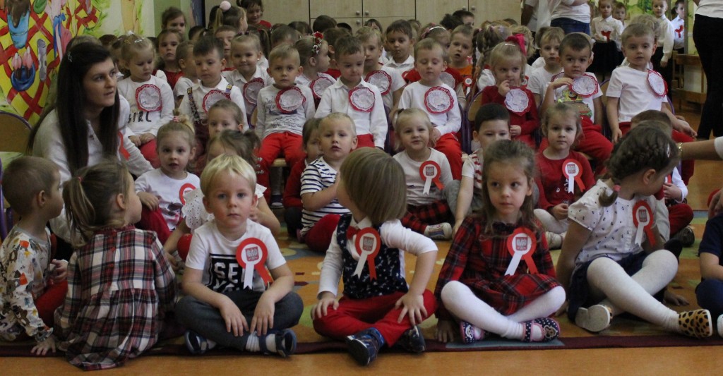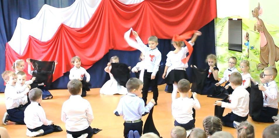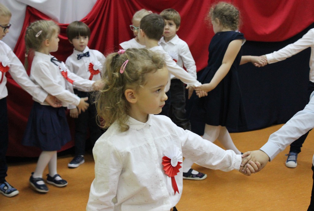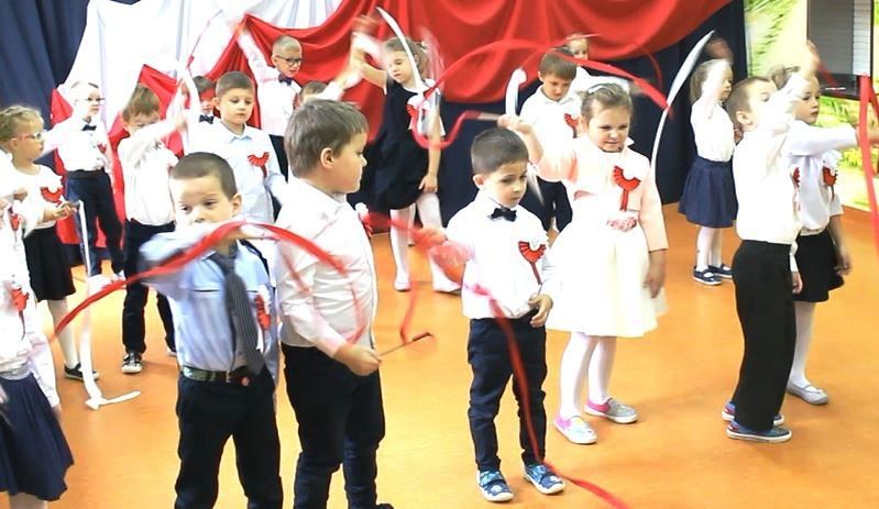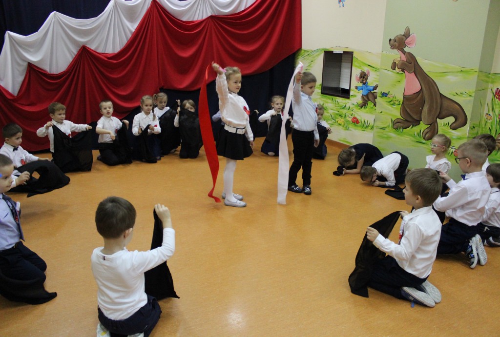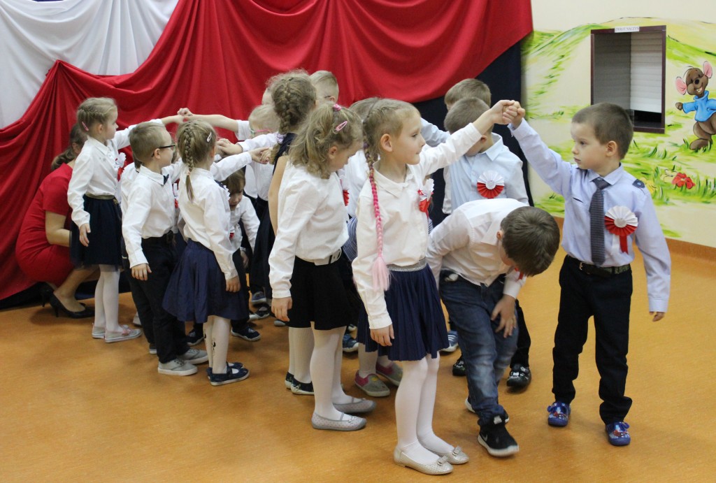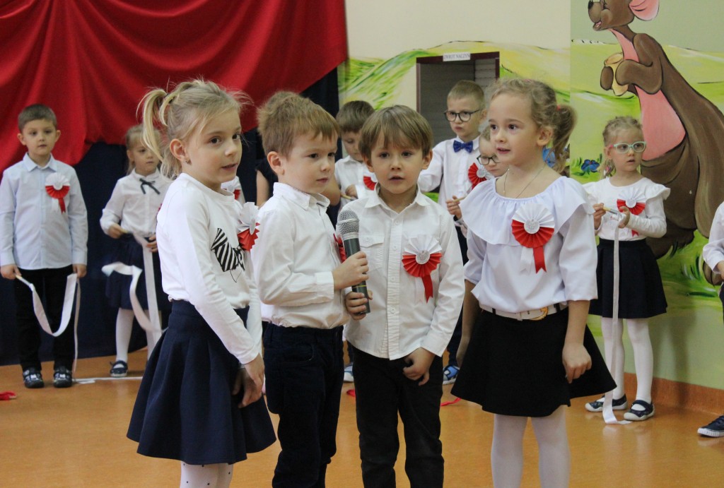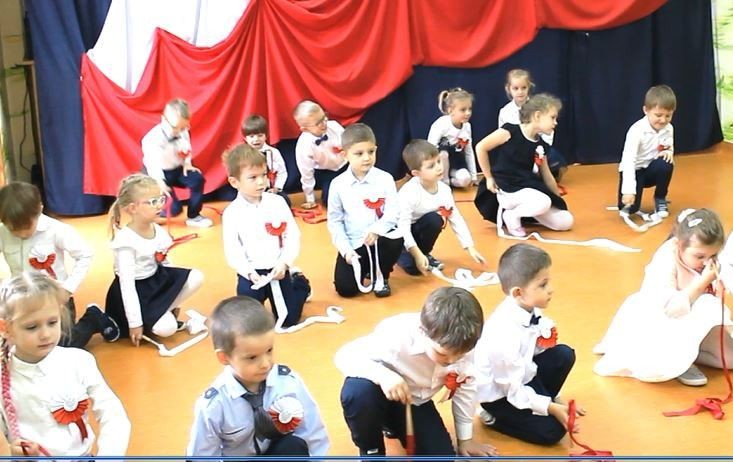 Dzień 11 listopada to jedna z najważniejszych dat w historii naszej Ojczyzny. Z tej okazji I grupa 5-latków przygotowała montaż słowno-muzyczny, na który 8 listopada zaprosiła całą społeczność placówki. Wszystkie dzieci, tego ważnego dnia, wyglądały odświętnie i uroczyście, a na ich piersi widniały kotyliony w barwach narodowych wykonane we wszystkich grupach wiekowych. Dzień Niepodległości był bardzo radosnym dniem w naszym przedszkolu. Młodzi artyści w swoim występie przypomnieli nam dzieje naszego kraju. Pięciolatki recytowały wiersze patriotyczne, śpiewały piosenki i zaprezentowały taniec narodowy – polonez, inaczej chodzony oraz układy choreograficzne z szarfami i chustami do muzyki F. Chopina.