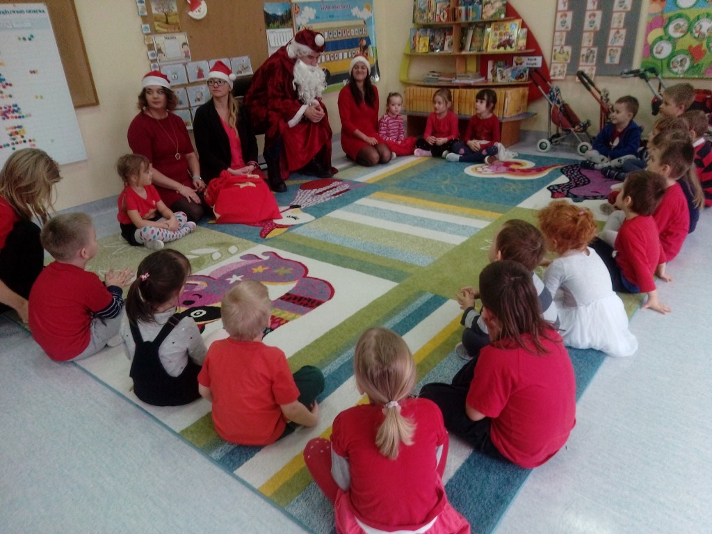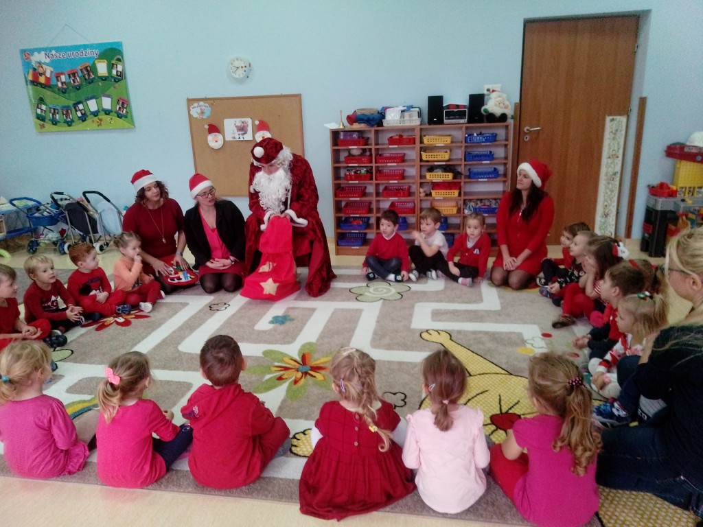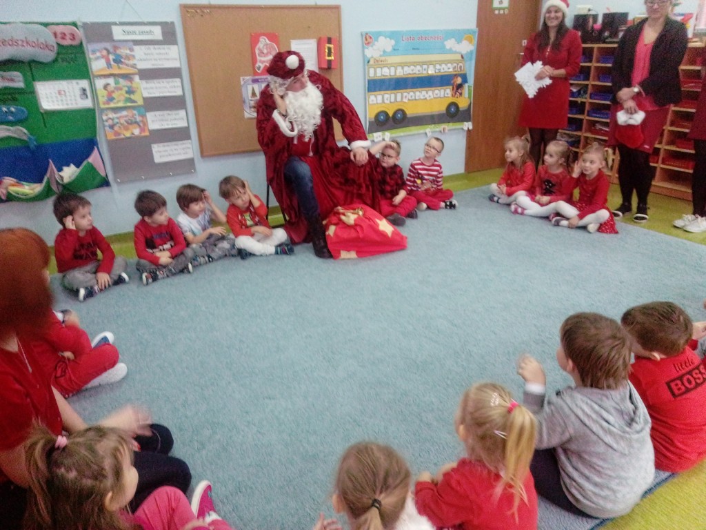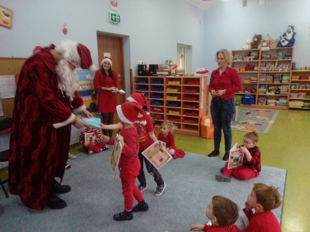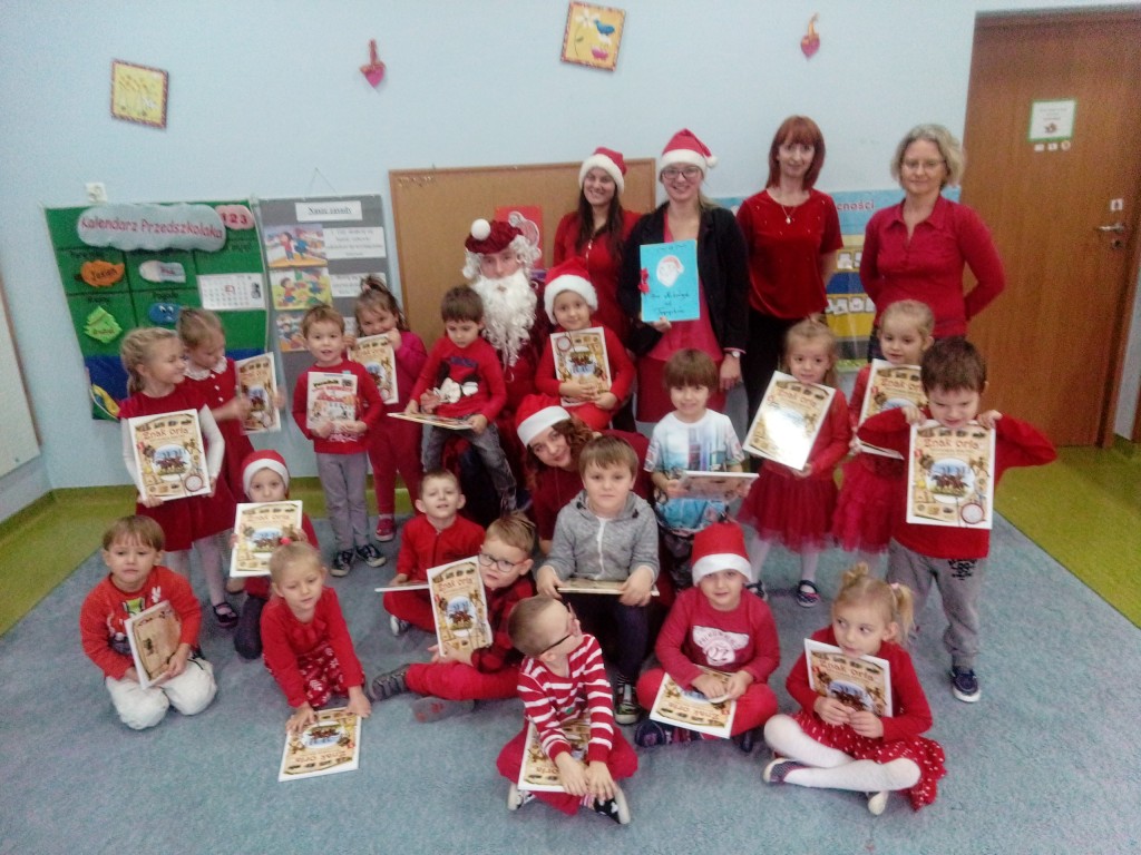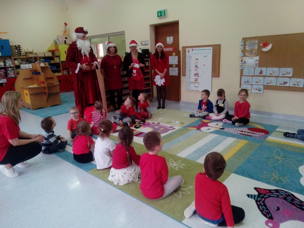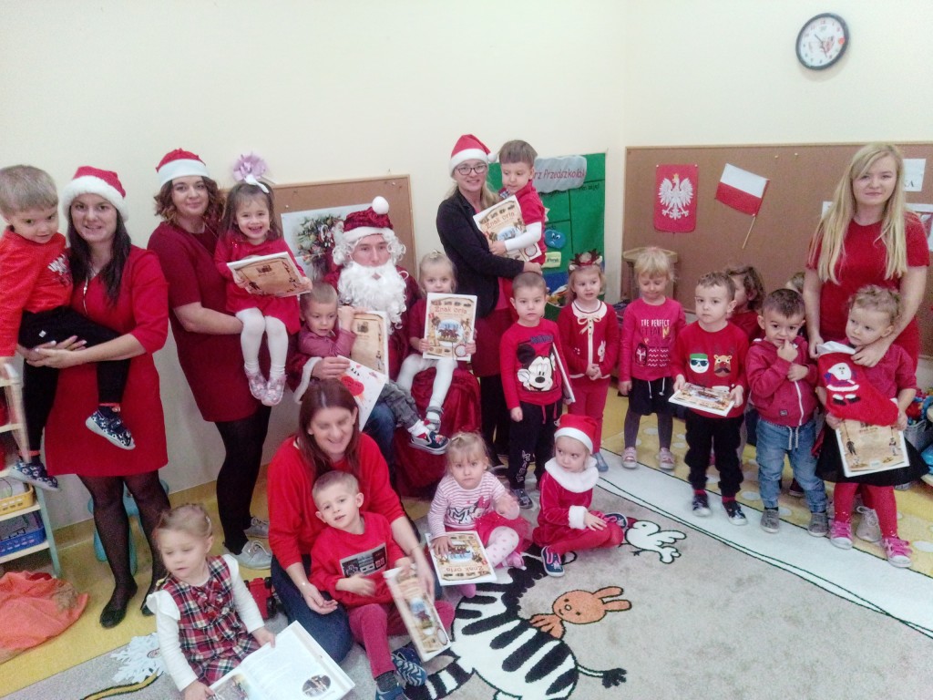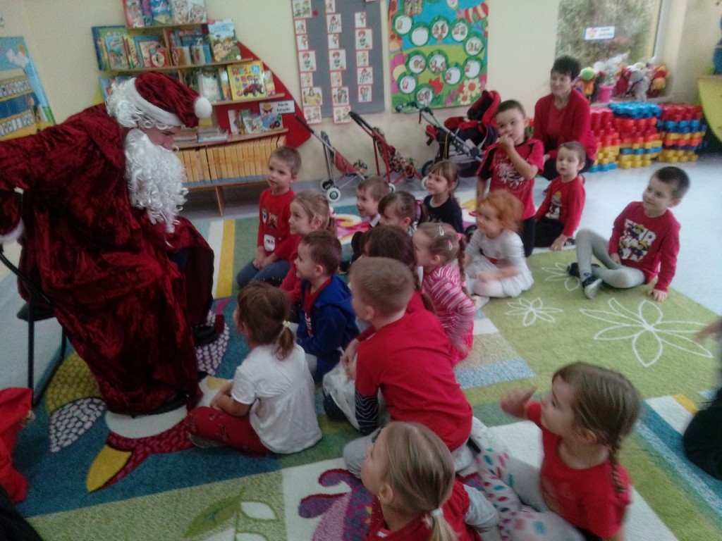 6 grudnia jak co roku w naszym przedszkolu panowała wyjątkowa atmosfera. Wszystkie przedszkolaki czekały na przybycie długo oczekiwanego gościa. Kiedy za drzwiami rozległ się głos dzwonka, dzieci już wiedziały, że to św. Mikołaj przybył do nich z workiem prezentów. Na jego wizytę cierpliwie czekały cały rok. Wcześniej nauczyły się piosenek i wierszy, które specjalnie dla Niego przygotowały. Każda grupa zaprezentowała swoje umiejętności wokalne i recytatorskie. Spotkanie z Mikołajem minęło radosnej atmosferze. W tym roku otrzymał on od dzieci szczególny prezent, a mianowicie były to serduszka z dobrymi uczynkami, o które Mikołaj prosił dzieci w liście skierowanym do nich. Wpisując się w obchody Dni Dobrego Słowa oraz tradycję ubierania choinki, Mikołaj poprosił dzieci, aby zawiesiły te serduszka na choince w holu przedszkola, tak by mógł zobaczyć , jakimi dobrymi dziećmi są nasze przedszkolaki. Na zakończenie Mikołaj obdarował wszystkich prezentami. Miłym akcentem spotkania były wspólne zdjęcia z naszym gościem.