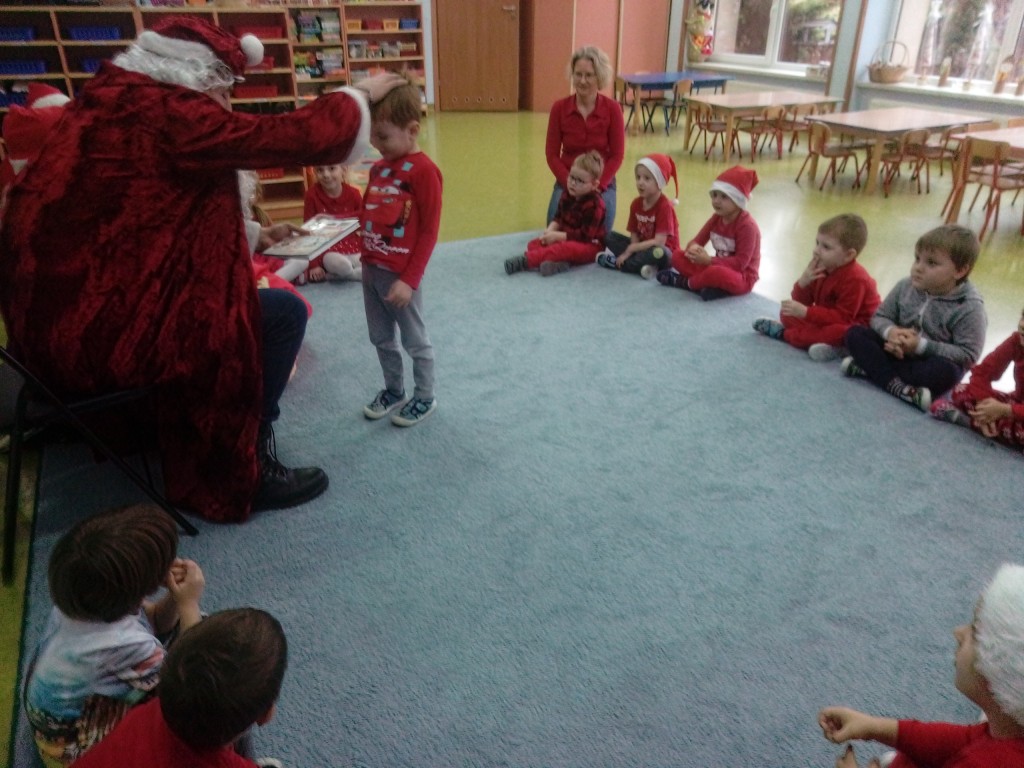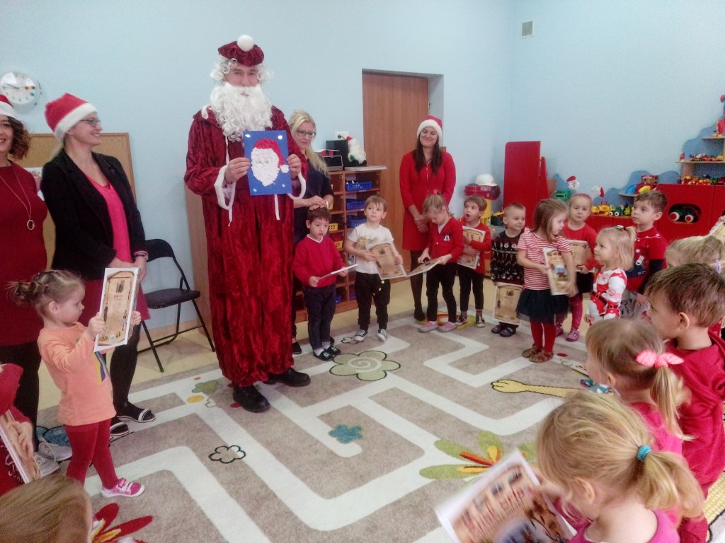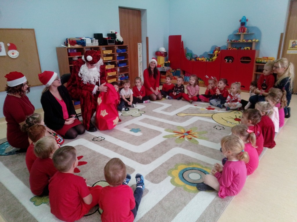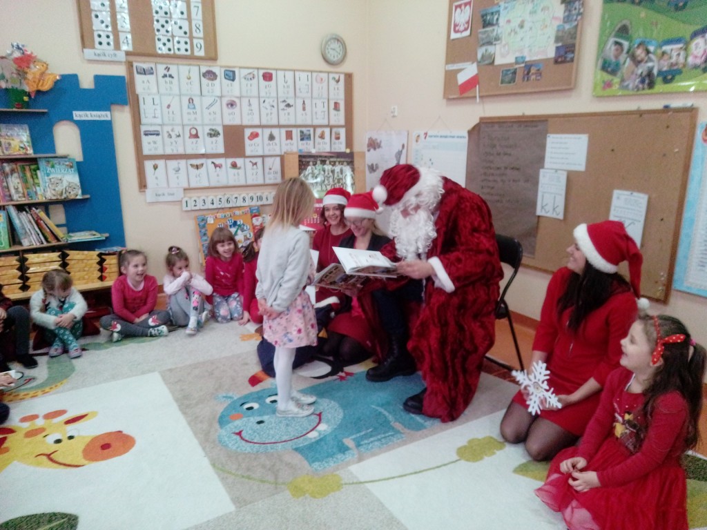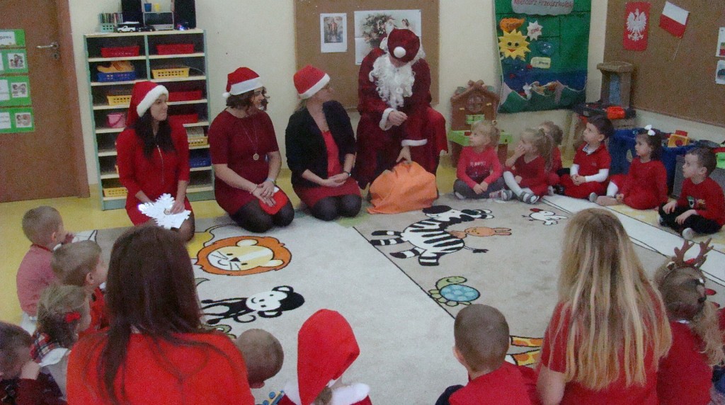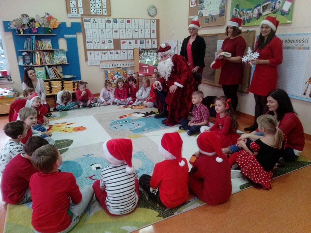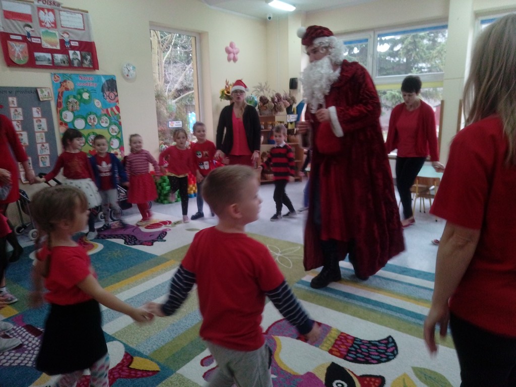 6 grudnia jak co roku w naszym przedszkolu panowała wyjątkowa atmosfera. Wszystkie przedszkolaki czekały na przybycie długo oczekiwanego gościa. Kiedy za drzwiami rozległ się głos dzwonka, dzieci już wiedziały, że to św. Mikołaj przybył do nich z workiem prezentów. Na jego wizytę cierpliwie czekały cały rok. Wcześniej nauczyły się piosenek i wierszy, które specjalnie dla Niego przygotowały. Każda grupa zaprezentowała swoje umiejętności wokalne i recytatorskie. Spotkanie z Mikołajem minęło radosnej atmosferze. W tym roku otrzymał on od dzieci szczególny prezent, a mianowicie były to serduszka z dobrymi uczynkami, o które Mikołaj prosił dzieci w liście skierowanym do nich. Wpisując się w obchody Dni Dobrego Słowa oraz tradycję ubierania choinki, Mikołaj poprosił dzieci, aby zawiesiły te serduszka na choince w holu przedszkola, tak by mógł zobaczyć , jakimi dobrymi dziećmi są nasze przedszkolaki. Na zakończenie Mikołaj obdarował wszystkich prezentami. Miłym akcentem spotkania były wspólne zdjęcia z naszym gościem.