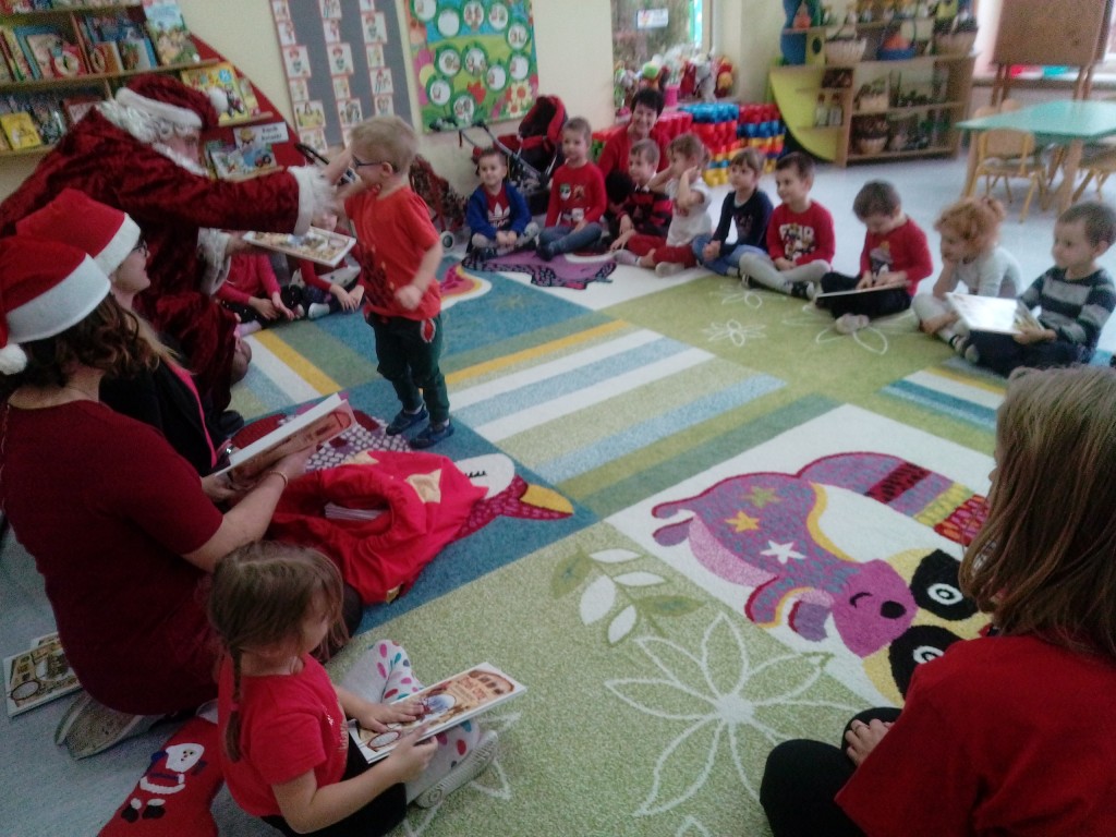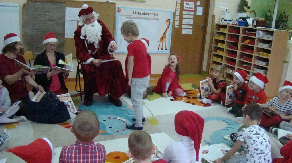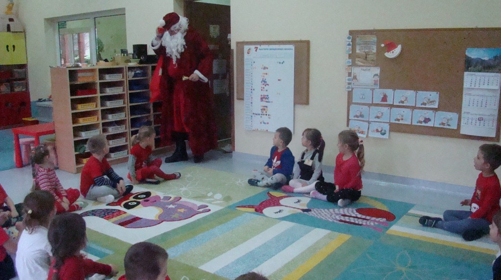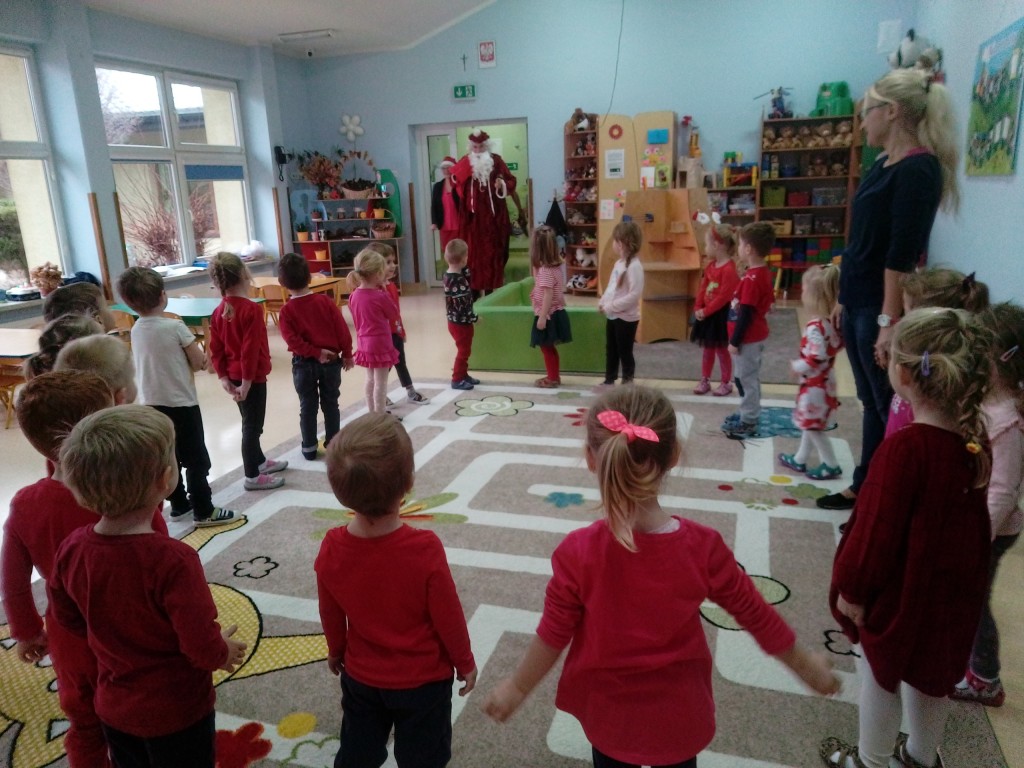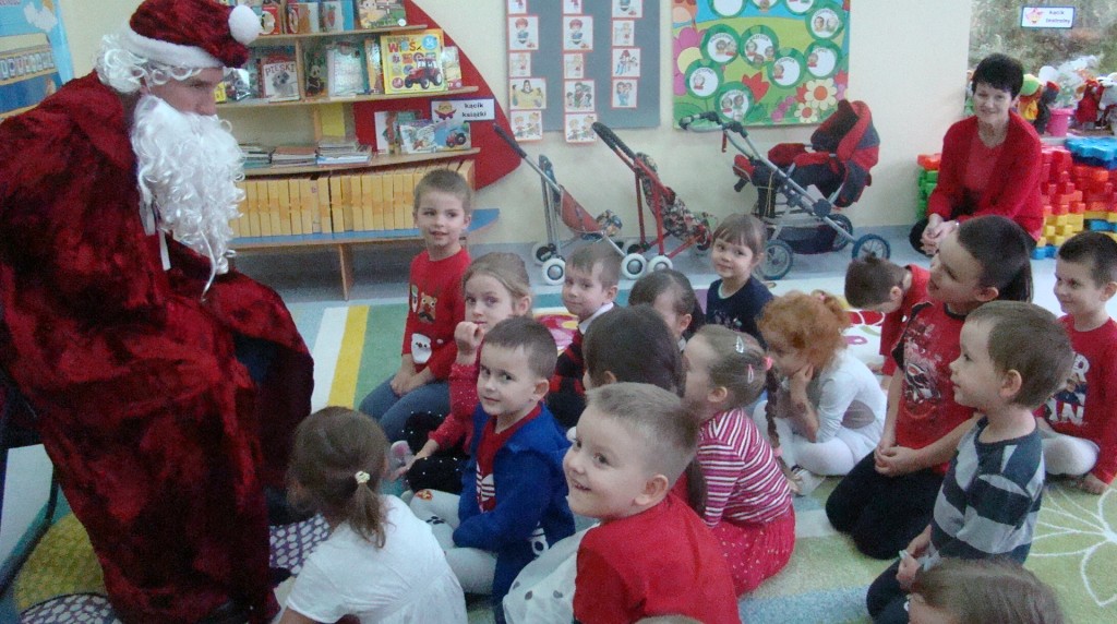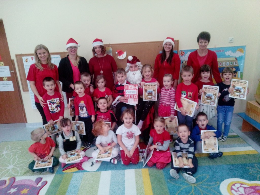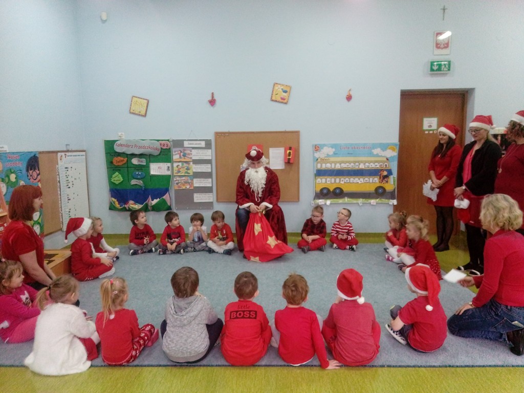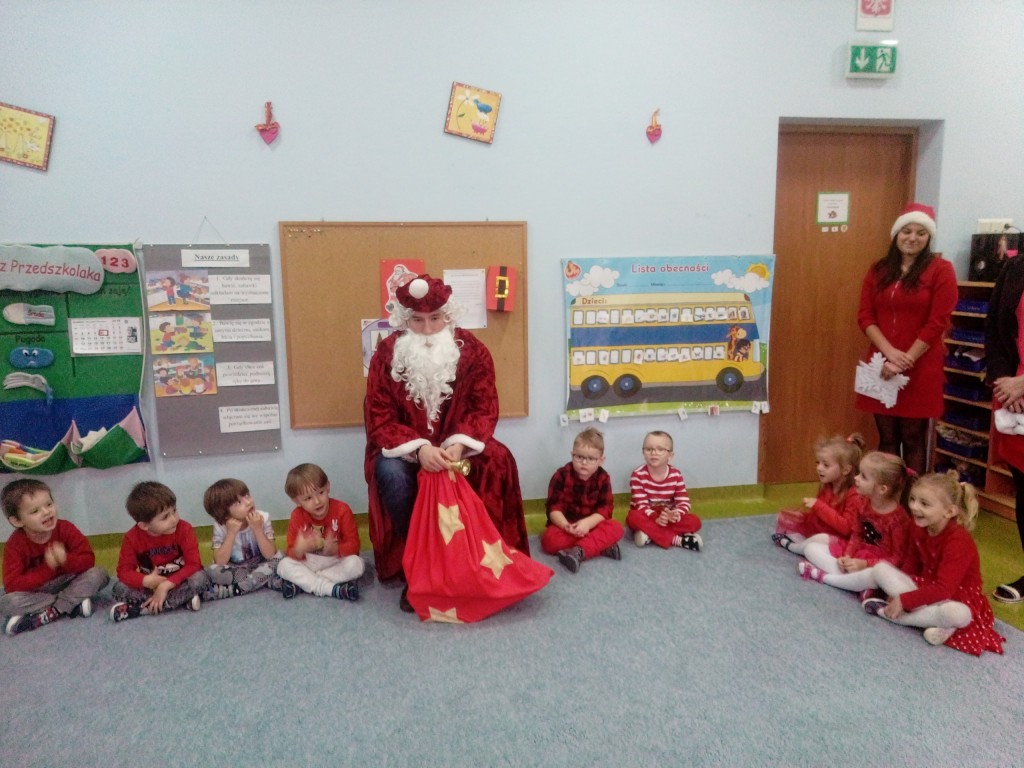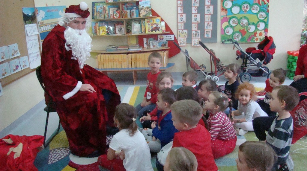 6 grudnia jak co roku w naszym przedszkolu panowała wyjątkowa atmosfera. Wszystkie przedszkolaki czekały na przybycie długo oczekiwanego gościa. Kiedy za drzwiami rozległ się głos dzwonka, dzieci już wiedziały, że to św. Mikołaj przybył do nich z workiem prezentów. Na jego wizytę cierpliwie czekały cały rok. Wcześniej nauczyły się piosenek i wierszy, które specjalnie dla Niego przygotowały. Każda grupa zaprezentowała swoje umiejętności wokalne i recytatorskie. Spotkanie z Mikołajem minęło radosnej atmosferze. W tym roku otrzymał on od dzieci szczególny prezent, a mianowicie były to serduszka z dobrymi uczynkami, o które Mikołaj prosił dzieci w liście skierowanym do nich. Wpisując się w obchody Dni Dobrego Słowa oraz tradycję ubierania choinki, Mikołaj poprosił dzieci, aby zawiesiły te serduszka na choince w holu przedszkola, tak by mógł zobaczyć , jakimi dobrymi dziećmi są nasze przedszkolaki. Na zakończenie Mikołaj obdarował wszystkich prezentami. Miłym akcentem spotkania były wspólne zdjęcia z naszym gościem.