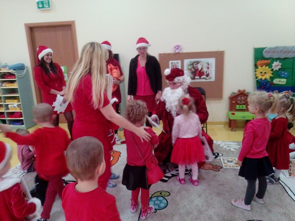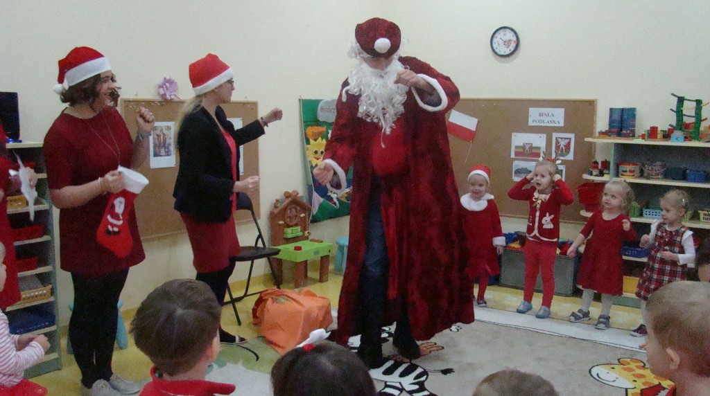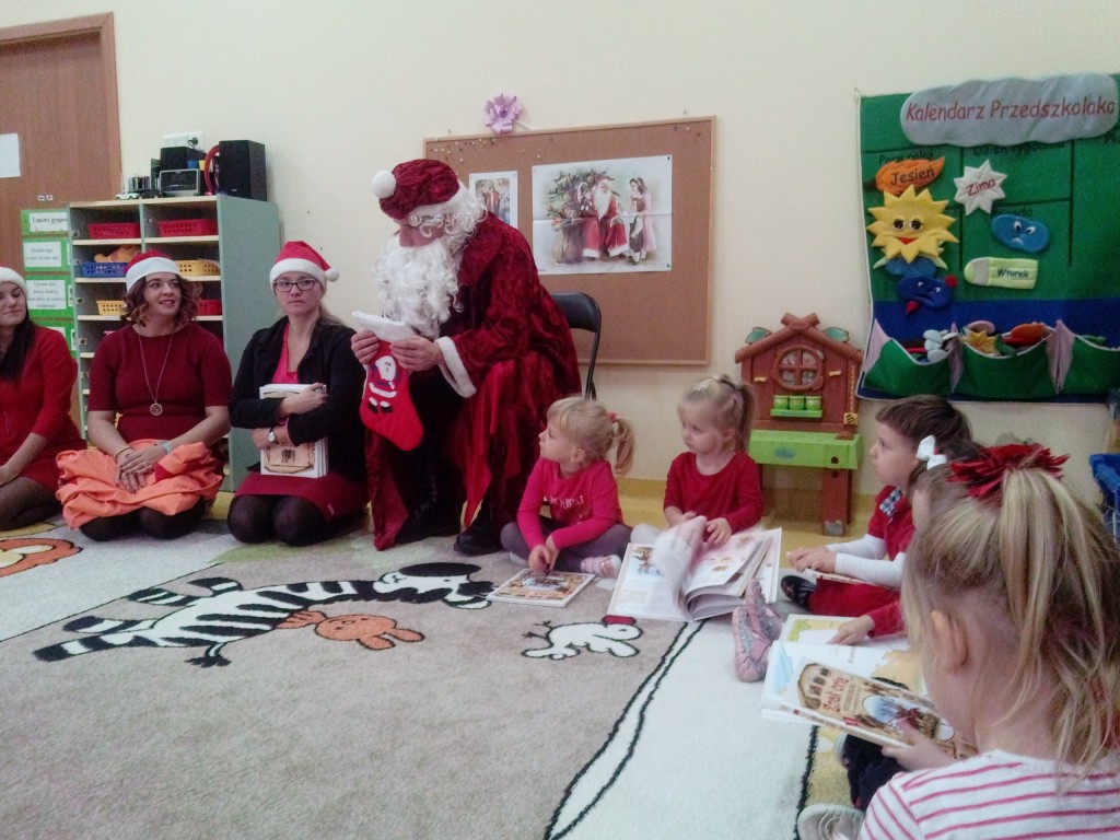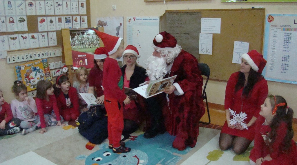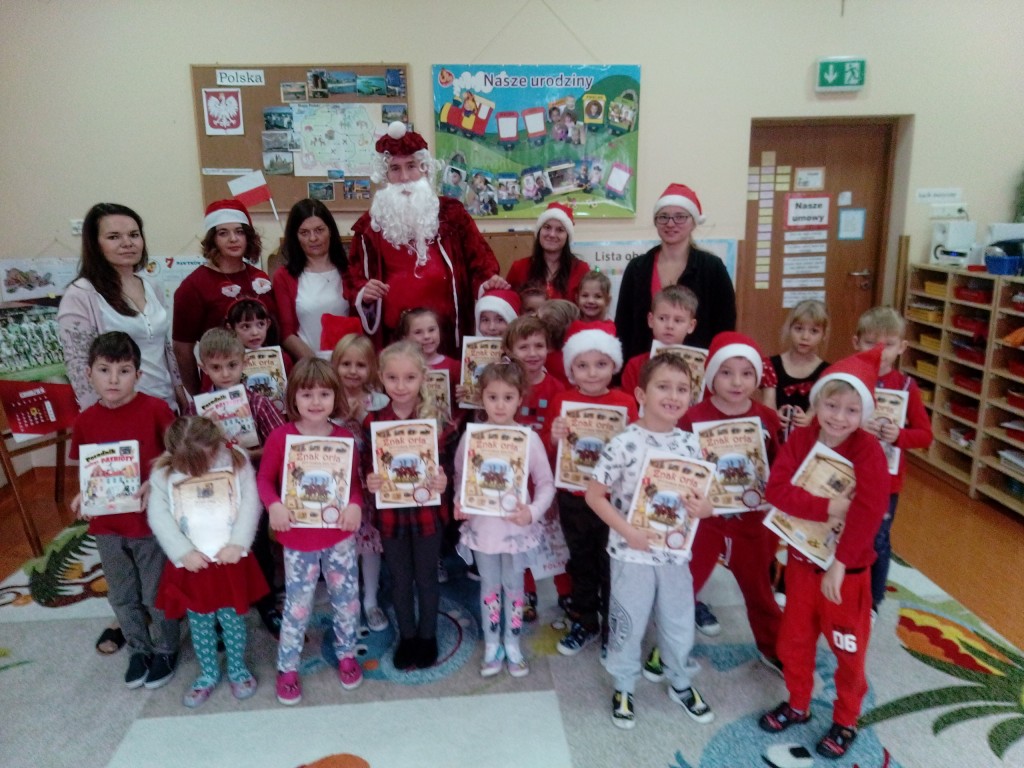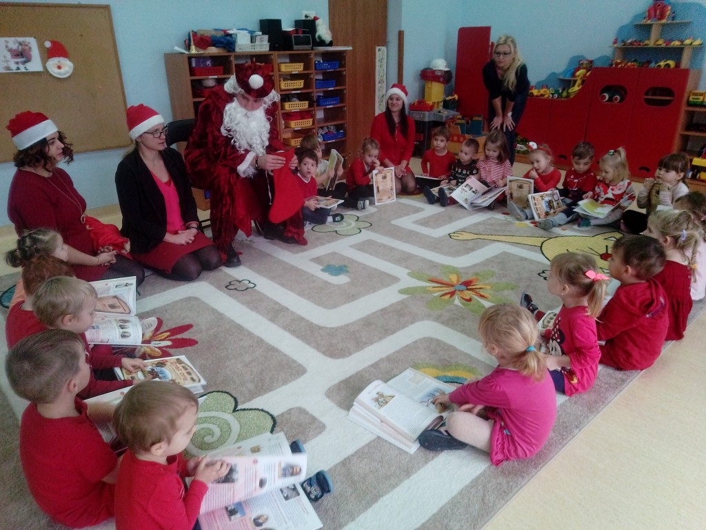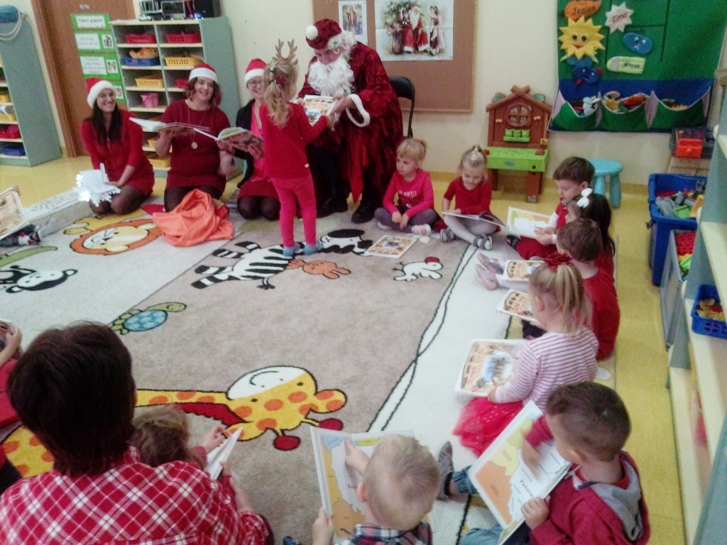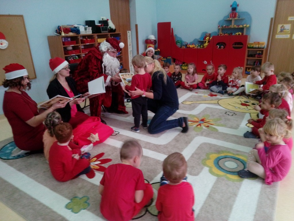 6 grudnia jak co roku w naszym przedszkolu panowała wyjątkowa atmosfera. Wszystkie przedszkolaki czekały na przybycie długo oczekiwanego gościa. Kiedy za drzwiami rozległ się głos dzwonka, dzieci już wiedziały, że to św. Mikołaj przybył do nich z workiem prezentów. Na jego wizytę cierpliwie czekały cały rok. Wcześniej nauczyły się piosenek i wierszy, które specjalnie dla Niego przygotowały. Każda grupa zaprezentowała swoje umiejętności wokalne i recytatorskie. Spotkanie z Mikołajem minęło radosnej atmosferze. W tym roku otrzymał on od dzieci szczególny prezent, a mianowicie były to serduszka z dobrymi uczynkami, o które Mikołaj prosił dzieci w liście skierowanym do nich. Wpisując się w obchody Dni Dobrego Słowa oraz tradycję ubierania choinki, Mikołaj poprosił dzieci, aby zawiesiły te serduszka na choince w holu przedszkola, tak by mógł zobaczyć , jakimi dobrymi dziećmi są nasze przedszkolaki. Na zakończenie Mikołaj obdarował wszystkich prezentami. Miłym akcentem spotkania były wspólne zdjęcia z naszym gościem.