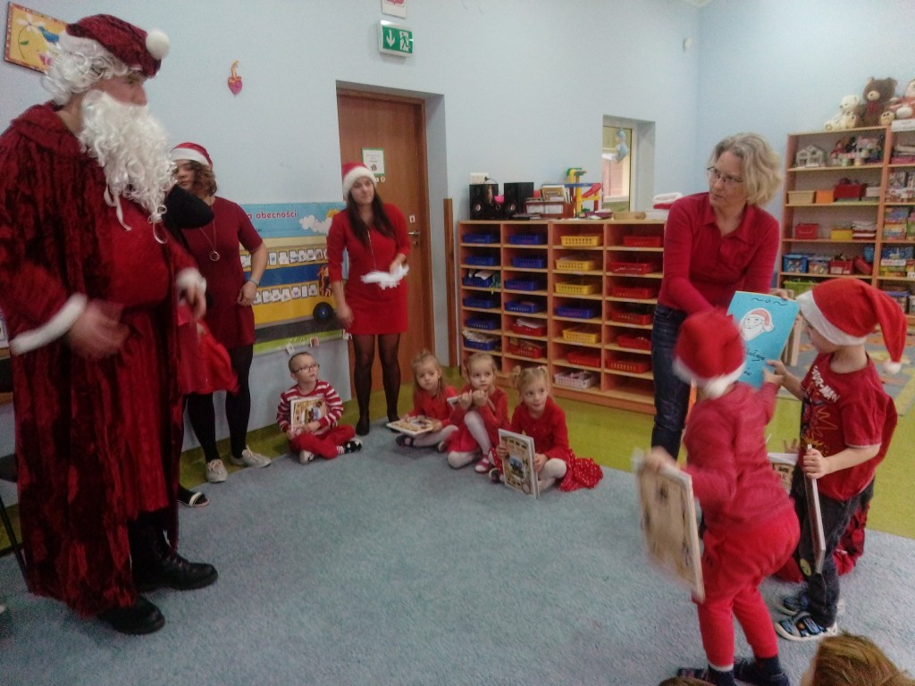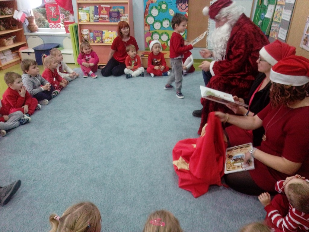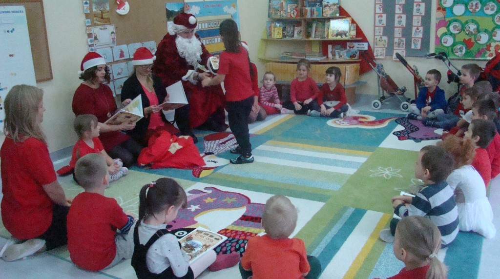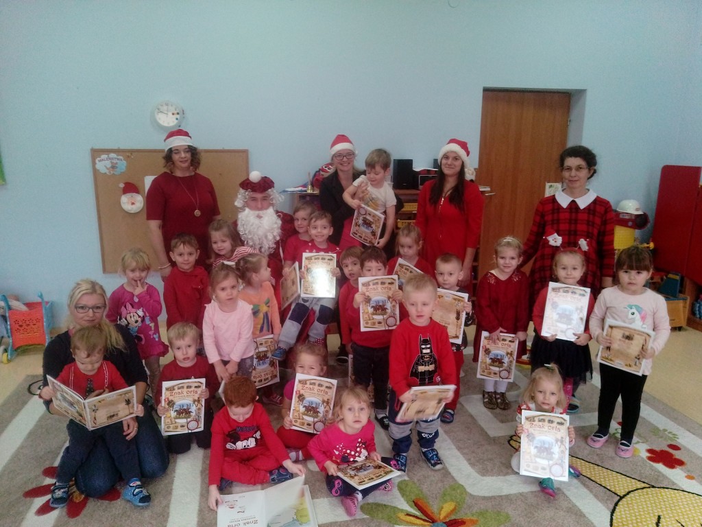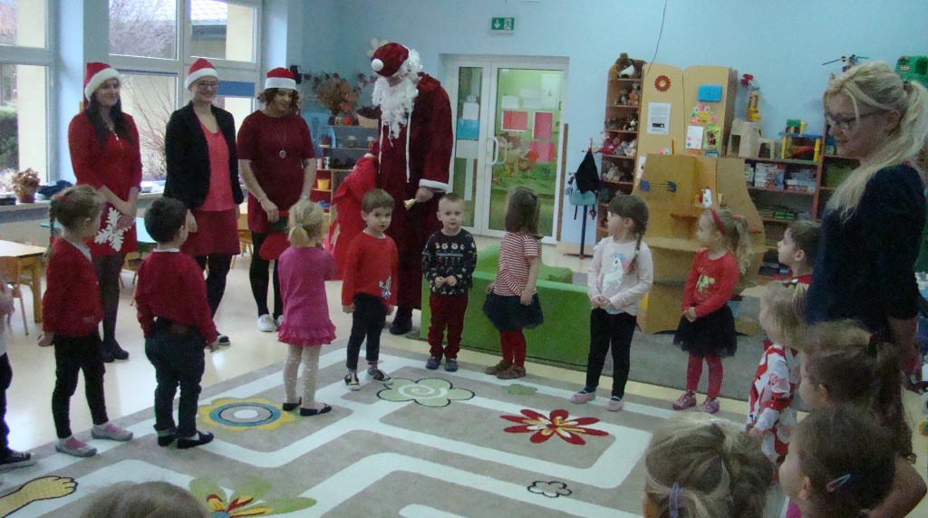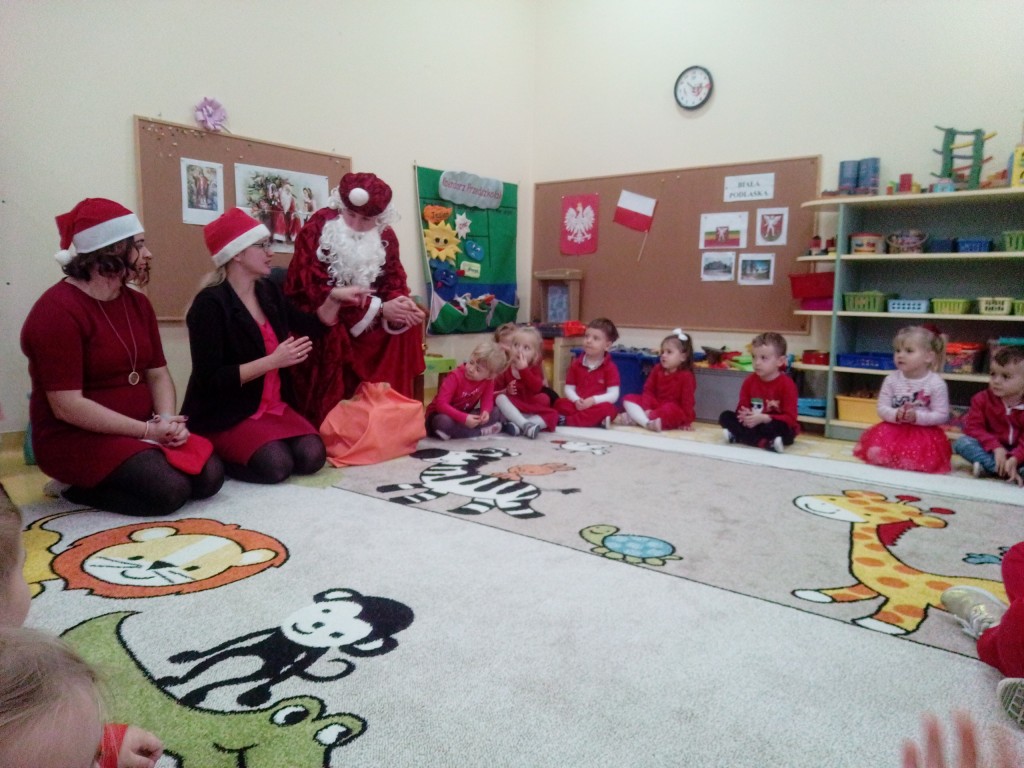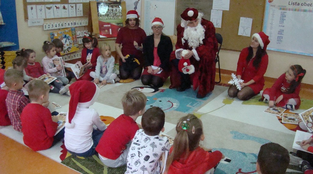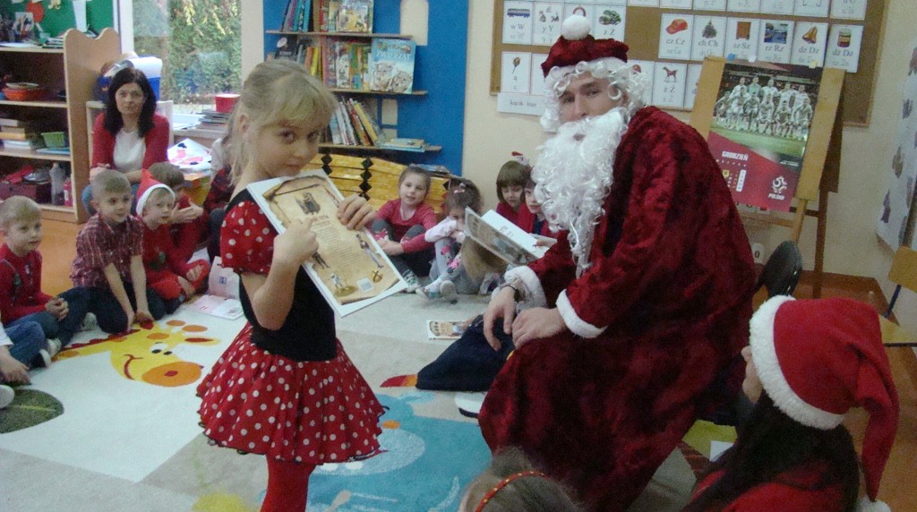 6 grudnia jak co roku w naszym przedszkolu panowała wyjątkowa atmosfera. Wszystkie przedszkolaki czekały na przybycie długo oczekiwanego gościa. Kiedy za drzwiami rozległ się głos dzwonka, dzieci już wiedziały, że to św. Mikołaj przybył do nich z workiem prezentów. Na jego wizytę cierpliwie czekały cały rok. Wcześniej nauczyły się piosenek i wierszy, które specjalnie dla Niego przygotowały. Każda grupa zaprezentowała swoje umiejętności wokalne i recytatorskie. Spotkanie z Mikołajem minęło radosnej atmosferze. W tym roku otrzymał on od dzieci szczególny prezent, a mianowicie były to serduszka z dobrymi uczynkami, o które Mikołaj prosił dzieci w liście skierowanym do nich. Wpisując się w obchody Dni Dobrego Słowa oraz tradycję ubierania choinki, Mikołaj poprosił dzieci, aby zawiesiły te serduszka na choince w holu przedszkola, tak by mógł zobaczyć , jakimi dobrymi dziećmi są nasze przedszkolaki. Na zakończenie Mikołaj obdarował wszystkich prezentami. Miłym akcentem spotkania były wspólne zdjęcia z naszym gościem.