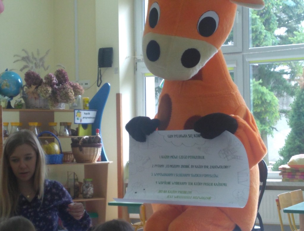 Dziękujemy Wydawnictwu KLETT za inicjatywę, spotkanie wielką żyrafą i plakat, który będzie nam przypominał o krokach do porozumienia w sytuacji konfliktu.