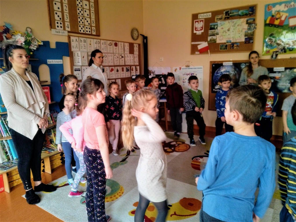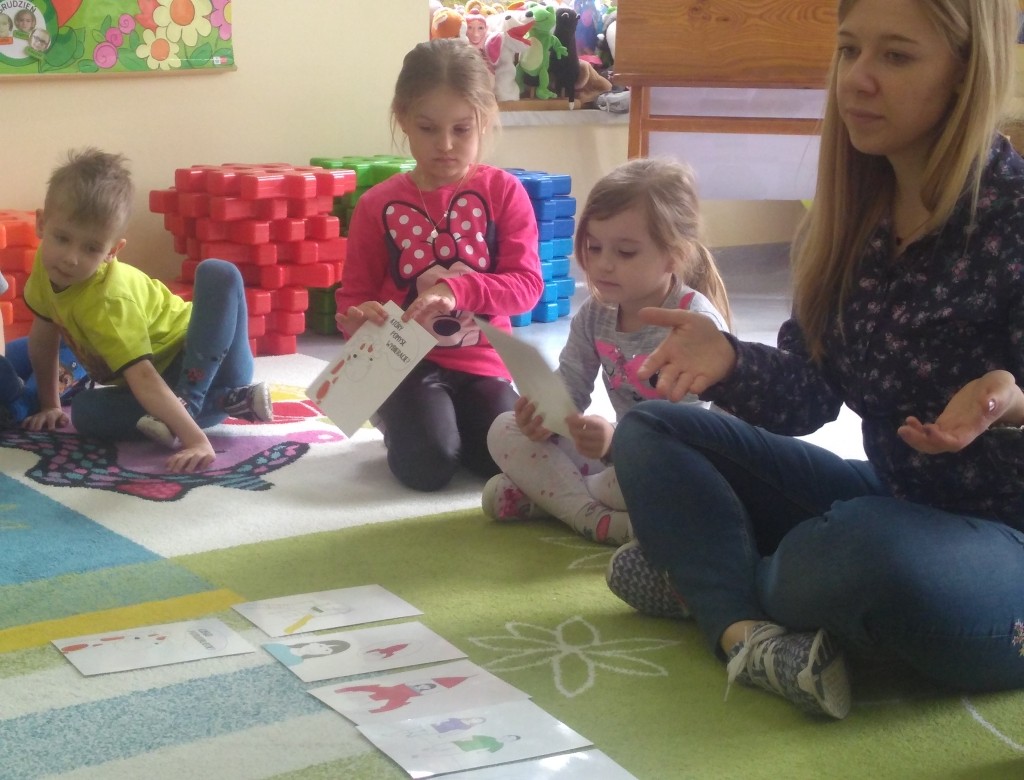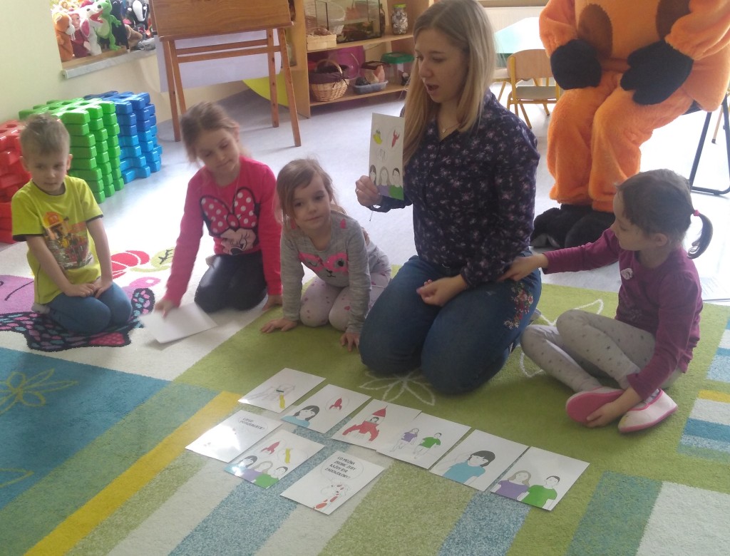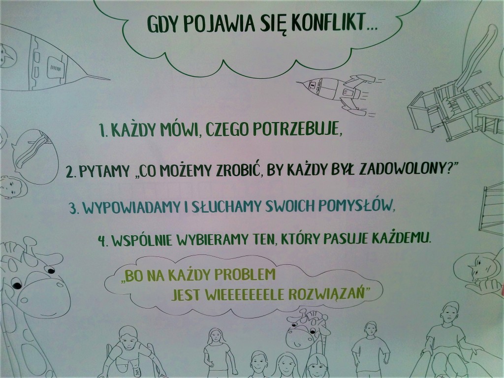 Tańczyliśmy, śpiewaliśmy i ćwiczyliśmy wzajemne słuchanie. Poznaliśmy historyjkę dzieci na placu zabaw i szukaliśmy wspólnie rozwiązań trudnych sytuacji, gdy nasze pragnienia i potrzeby są różne. Wspólnie doszliśmy do wniosku, że na KAŻDY PROBLEM JEST WIELE ROZWIĄZAŃ, zatem będziemy ich wspólnie szukać, by KAŻDY MÓGŁ BYĆ ZADOWOLONY.