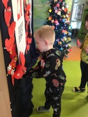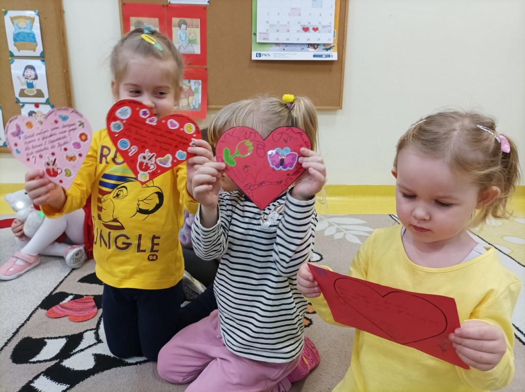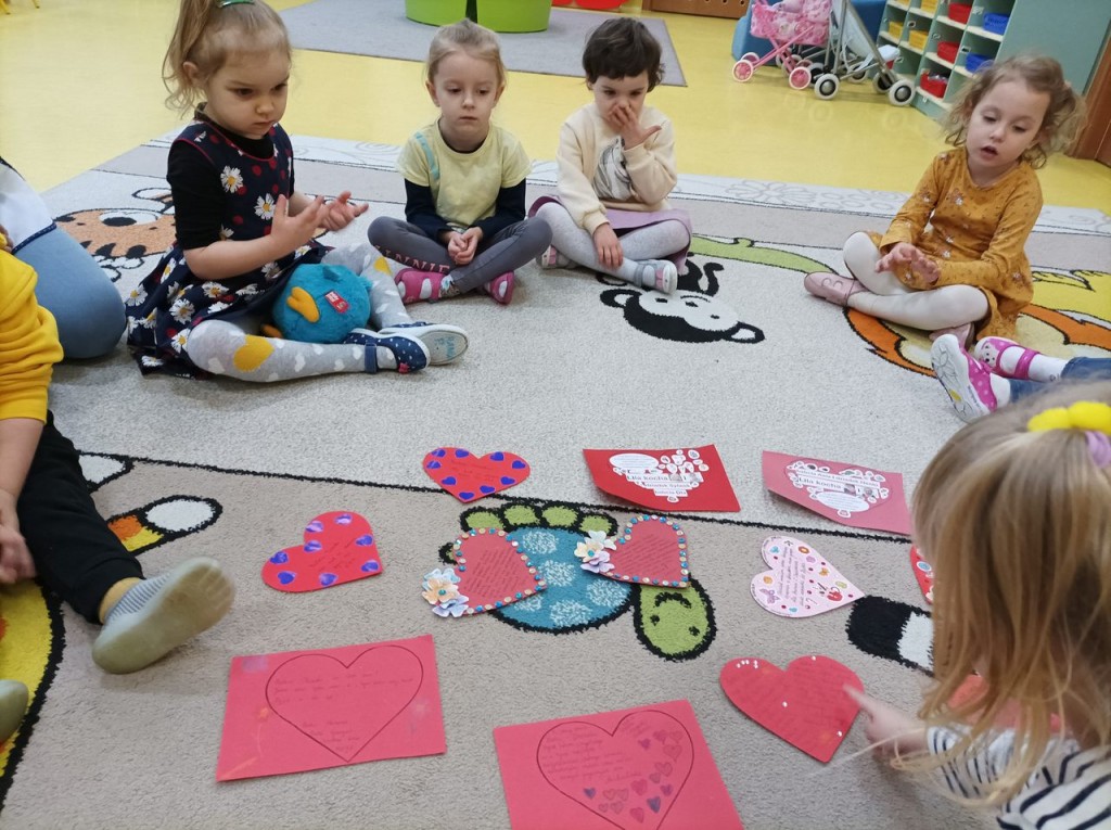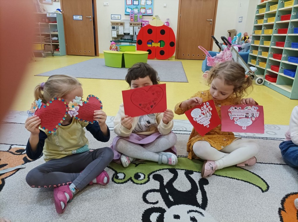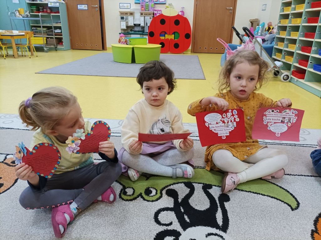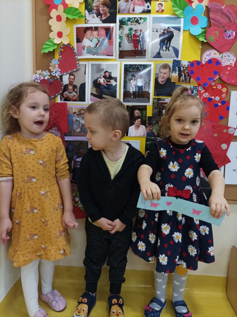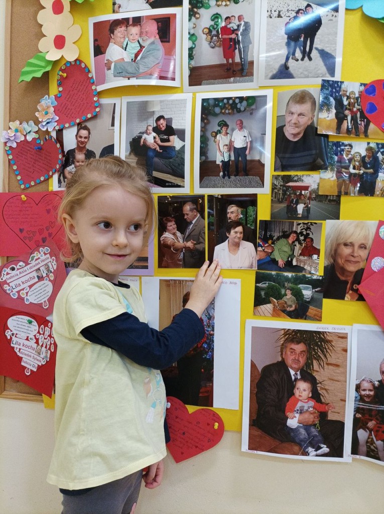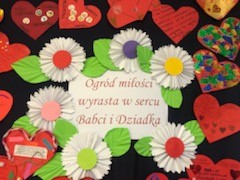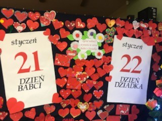 Dzieci wraz ze swoim rodzicami swoją miłosć wyrazili w formie życzeń dla kochanych Babć i Dziadków zapisanych na sercach ozdobionych ręką wnucząt. Serca narazie zdobią nasz hol ale już niedługo trafią do Babć i Dziadków