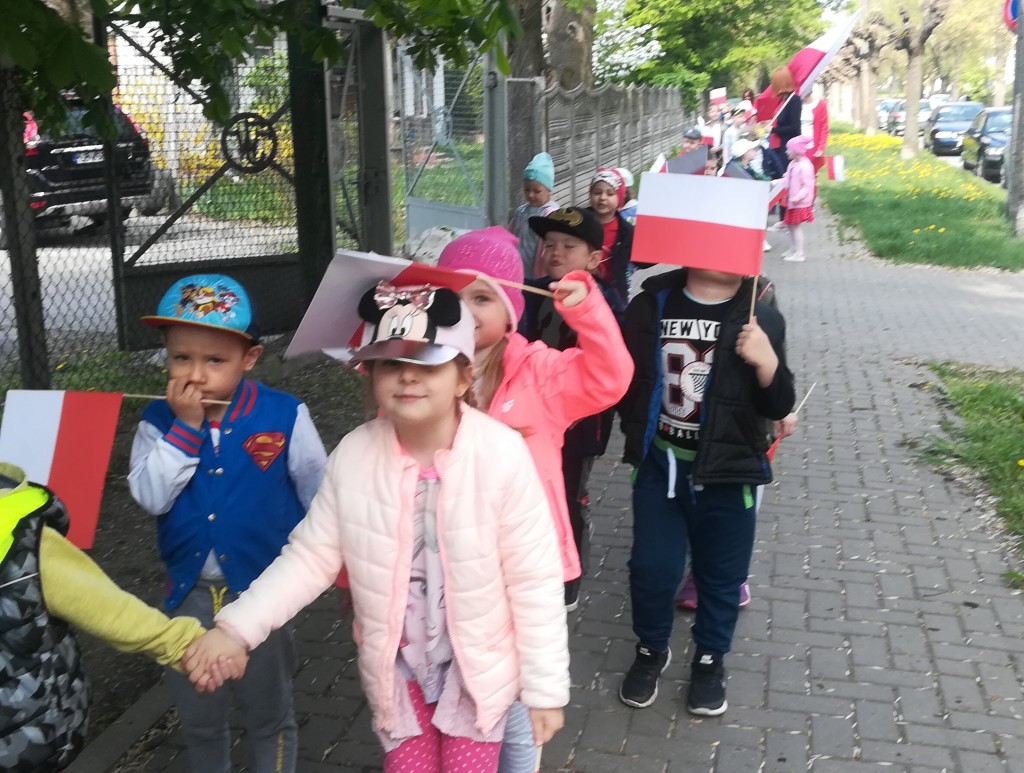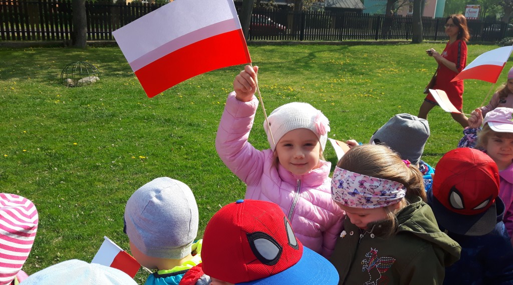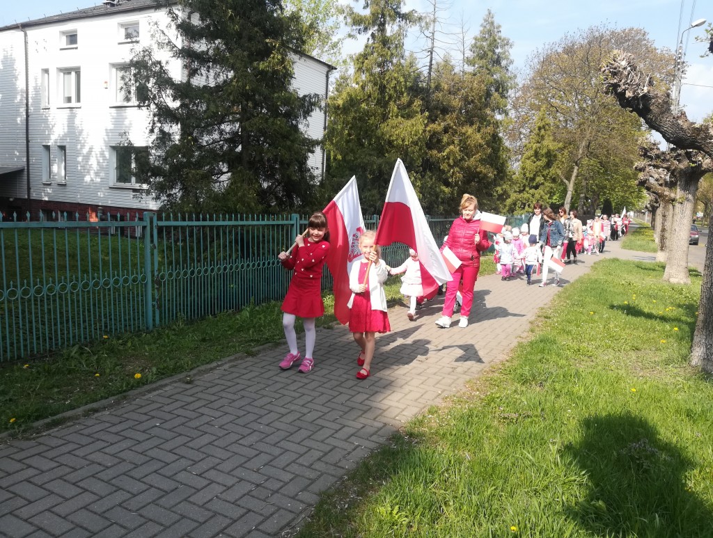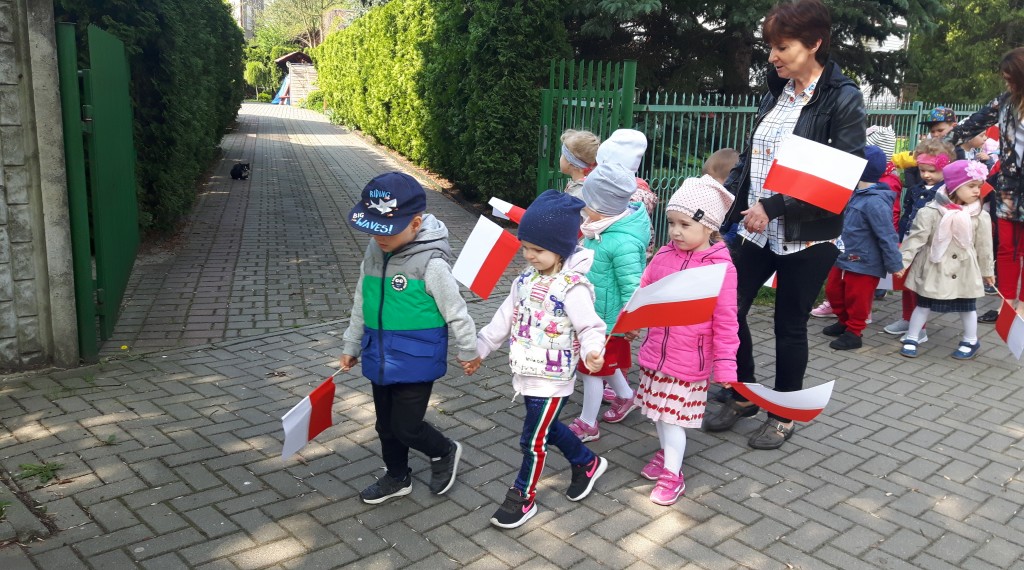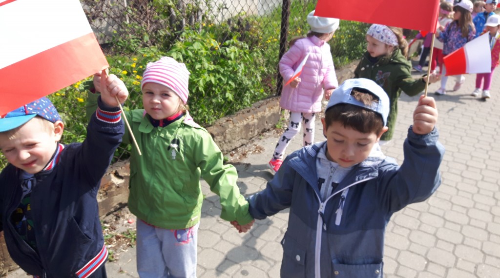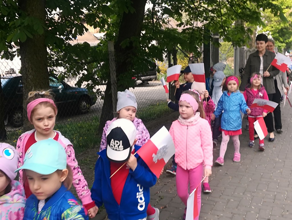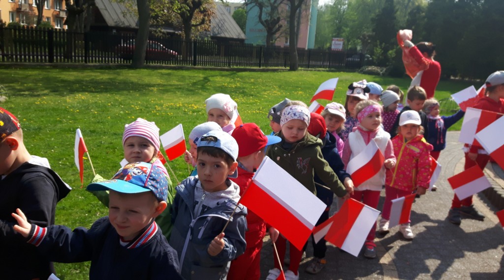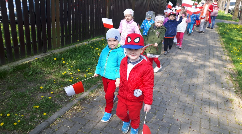 Dnia 2 maja w całej Polsce jest obchodzony Dzień Flagi a 3 maja rocznica uchwalenia Konstytucji 3 maja. Włączając się w obchody zbliżających się świąt majowych mali patrioci z naszego przedszkola dnia 29 kwietnia udali się na przemarsz ulicami naszego miasta z biało-czerwonymi flagami. Dzieci dumnie demonstrowały swój patriotyzm i poszanowanie dla symboli narodowych.