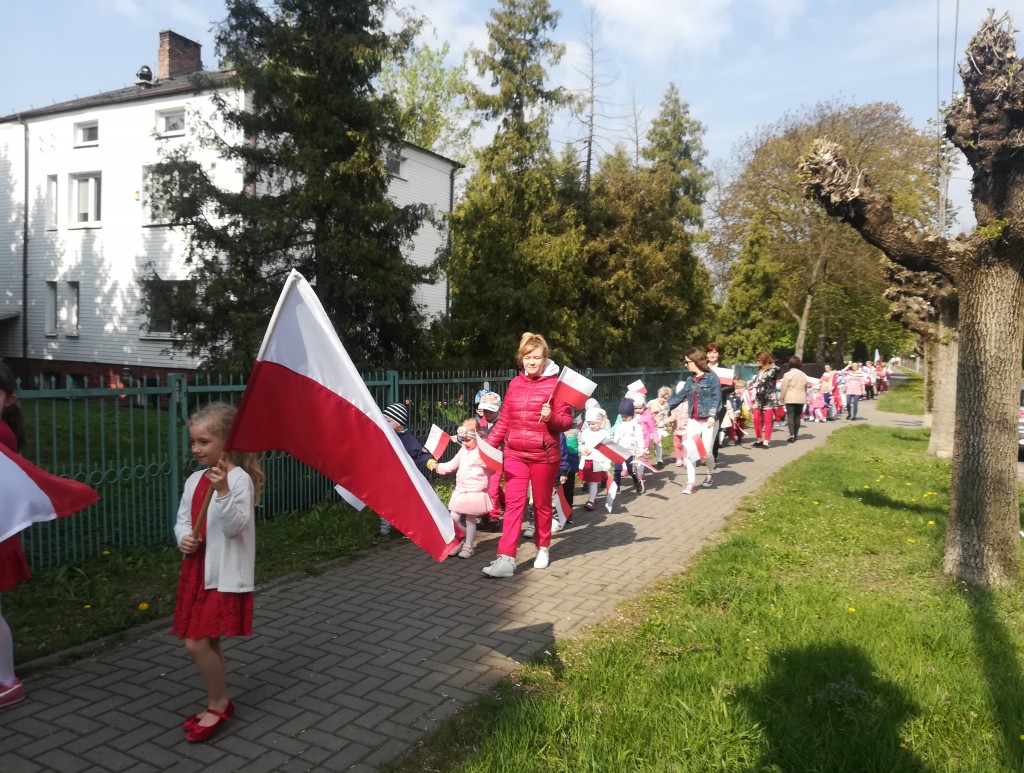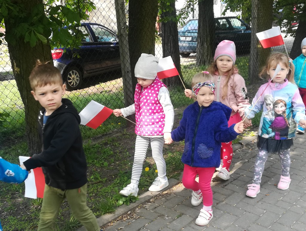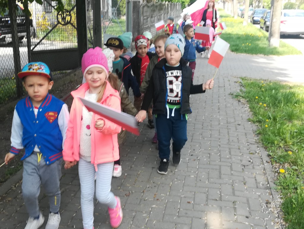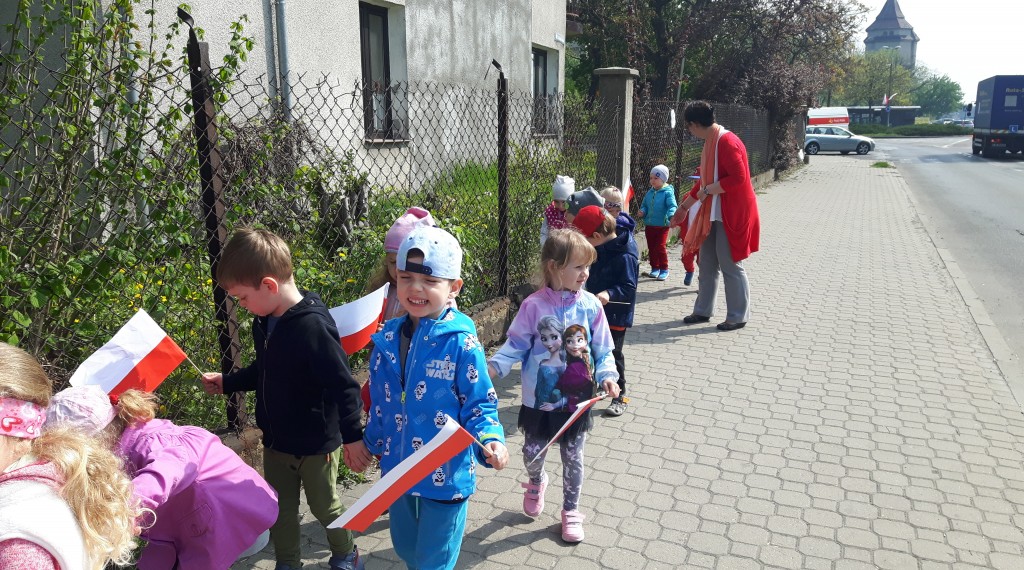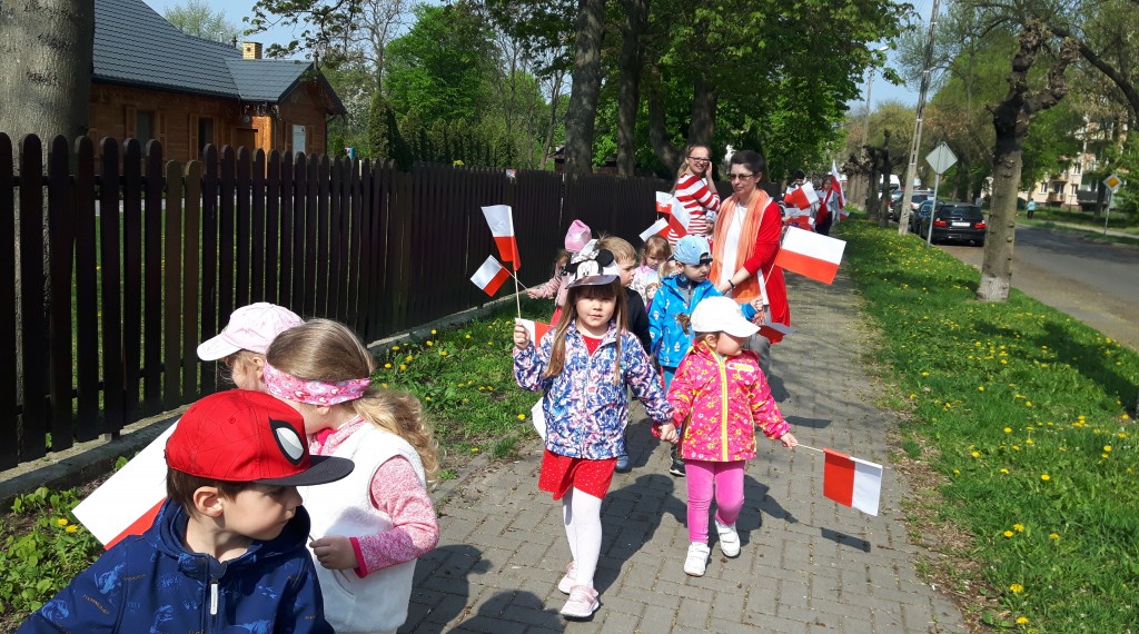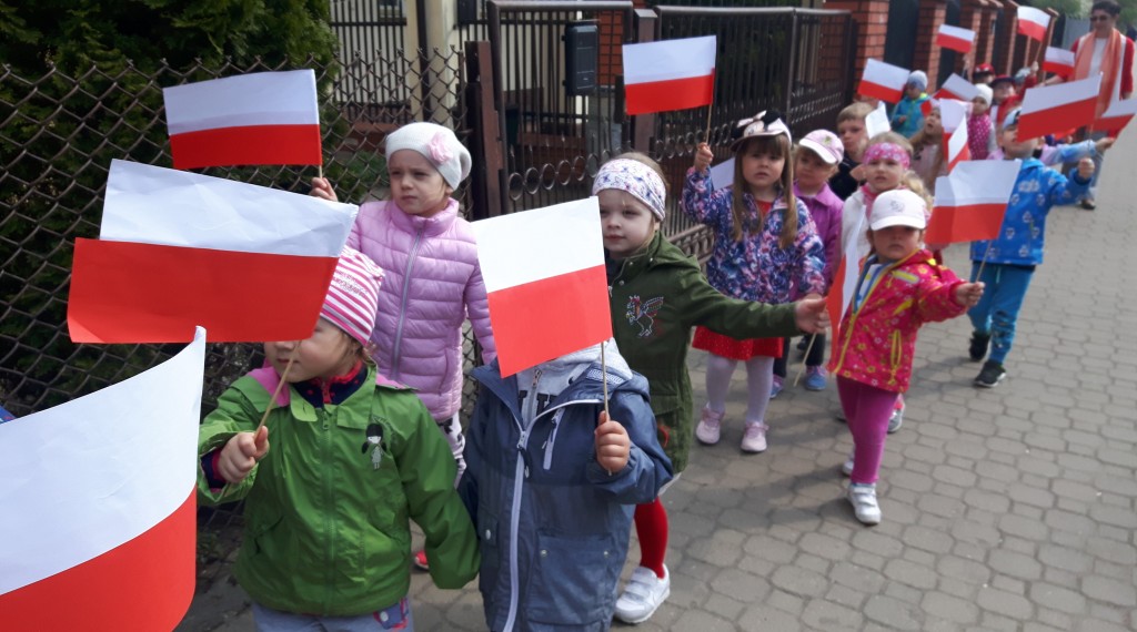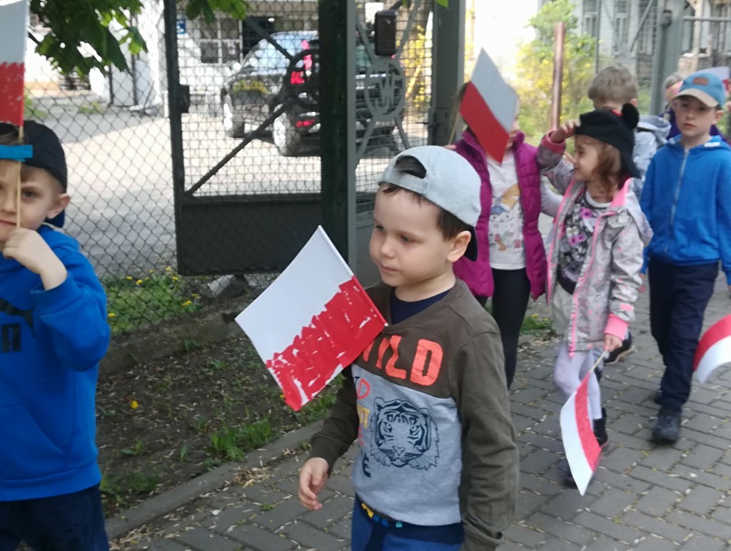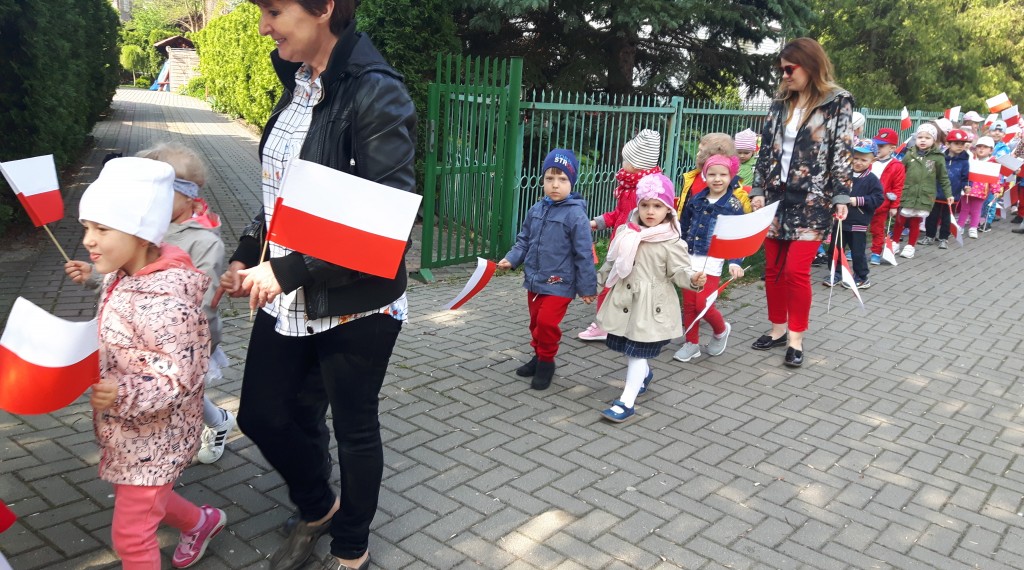 Dnia 2 maja w całej Polsce jest obchodzony Dzień Flagi a 3 maja rocznica uchwalenia Konstytucji 3 maja. Włączając się w obchody zbliżających się świąt majowych mali patrioci z naszego przedszkola dnia 29 kwietnia udali się na przemarsz ulicami naszego miasta z biało-czerwonymi flagami. Dzieci dumnie demonstrowały swój patriotyzm i poszanowanie dla symboli narodowych.