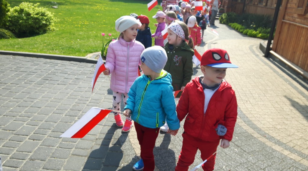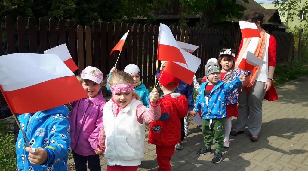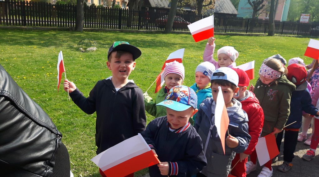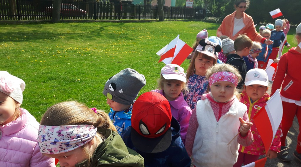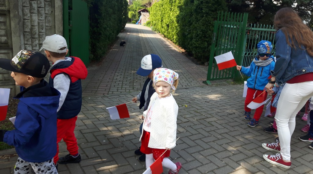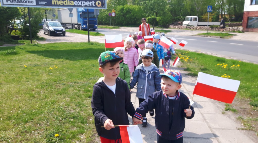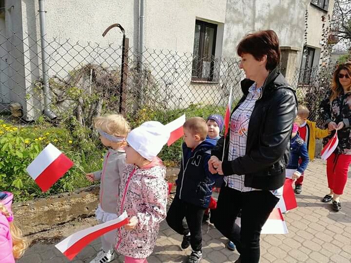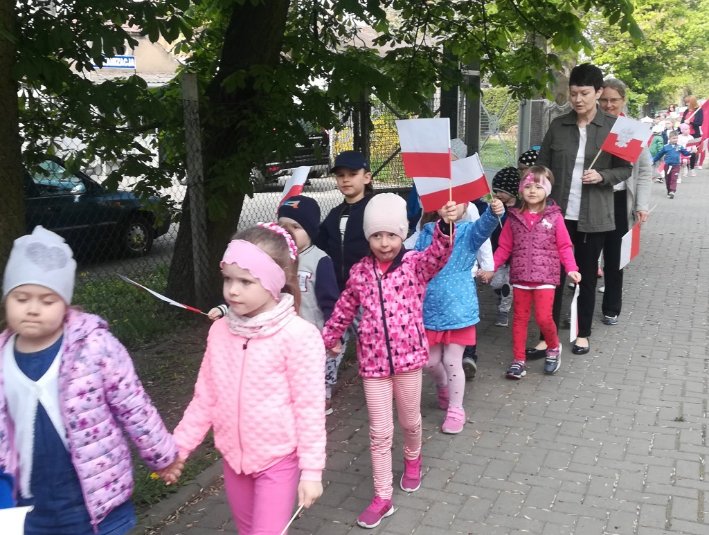 Dnia 2 maja w całej Polsce jest obchodzony Dzień Flagi a 3 maja rocznica uchwalenia Konstytucji 3 maja. Włączając się w obchody zbliżających się świąt majowych mali patrioci z naszego przedszkola dnia 29 kwietnia udali się na przemarsz ulicami naszego miasta z biało-czerwonymi flagami. Dzieci dumnie demonstrowały swój patriotyzm i poszanowanie dla symboli narodowych.