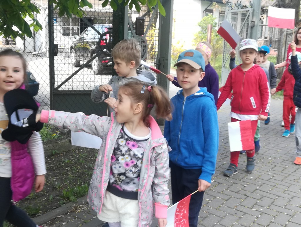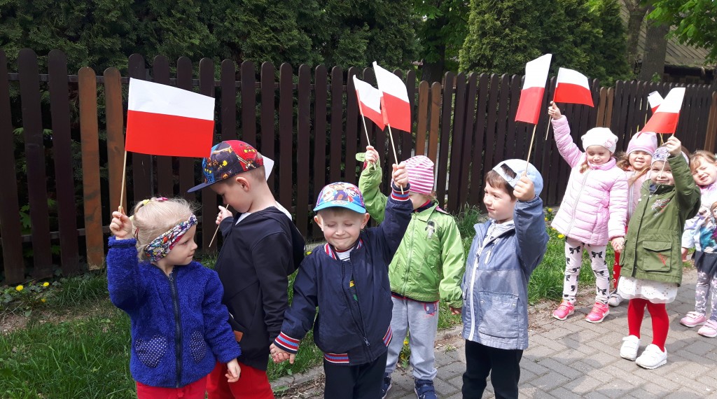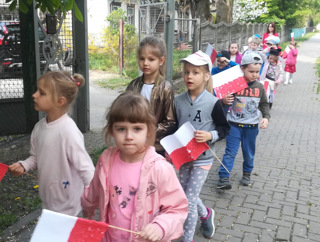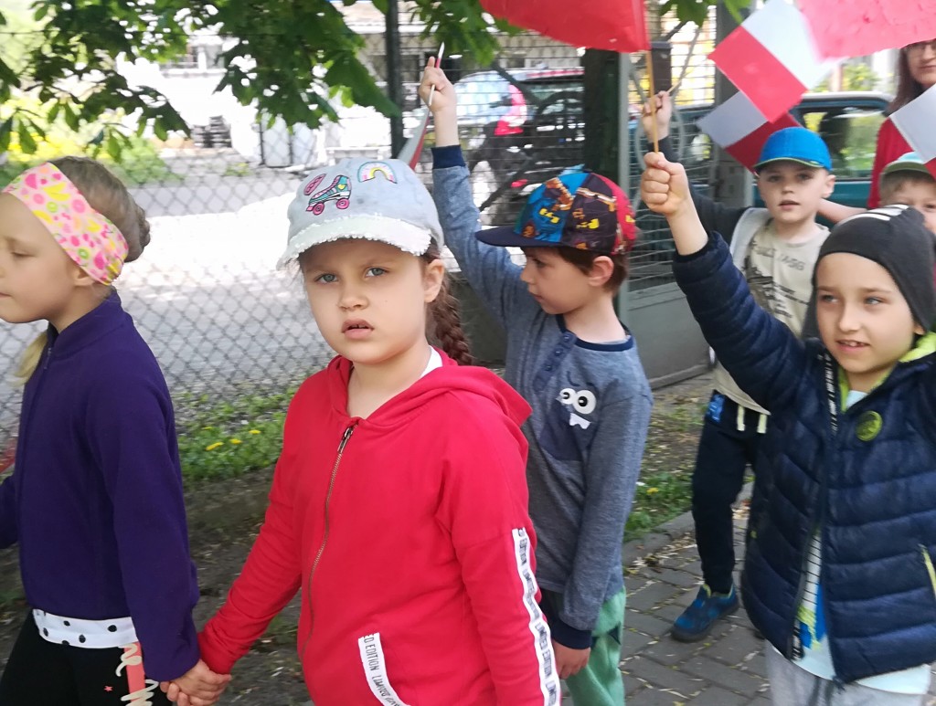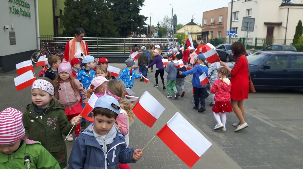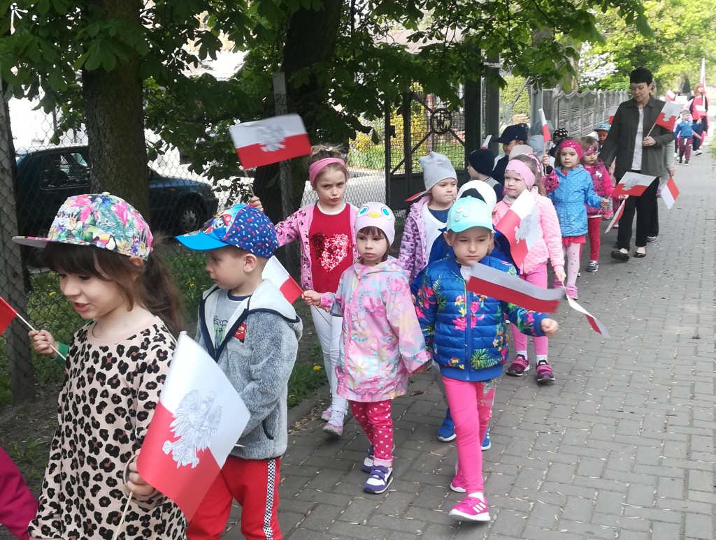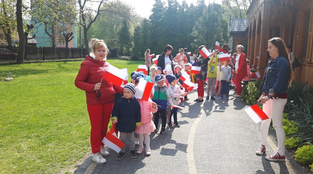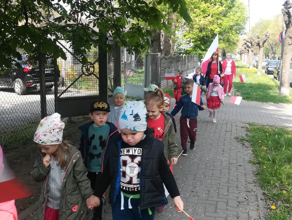Dnia 2 maja w całej Polsce jest obchodzony Dzień Flagi a 3 maja rocznica uchwalenia Konstytucji 3 maja. Włączając się w obchody zbliżających się świąt majowych mali patrioci z naszego przedszkola dnia 29 kwietnia udali się na przemarsz ulicami naszego miasta z biało-czerwonymi flagami. Dzieci dumnie demonstrowały swój patriotyzm i poszanowanie dla symboli narodowych.