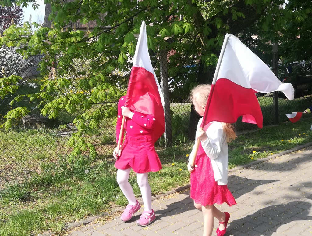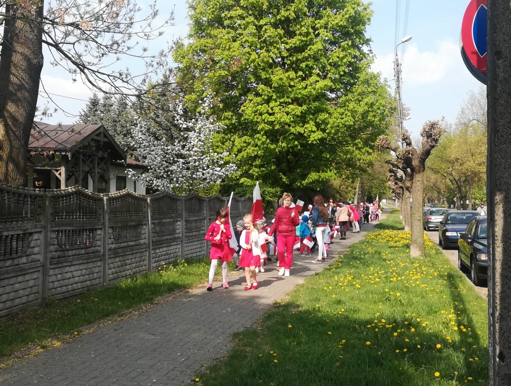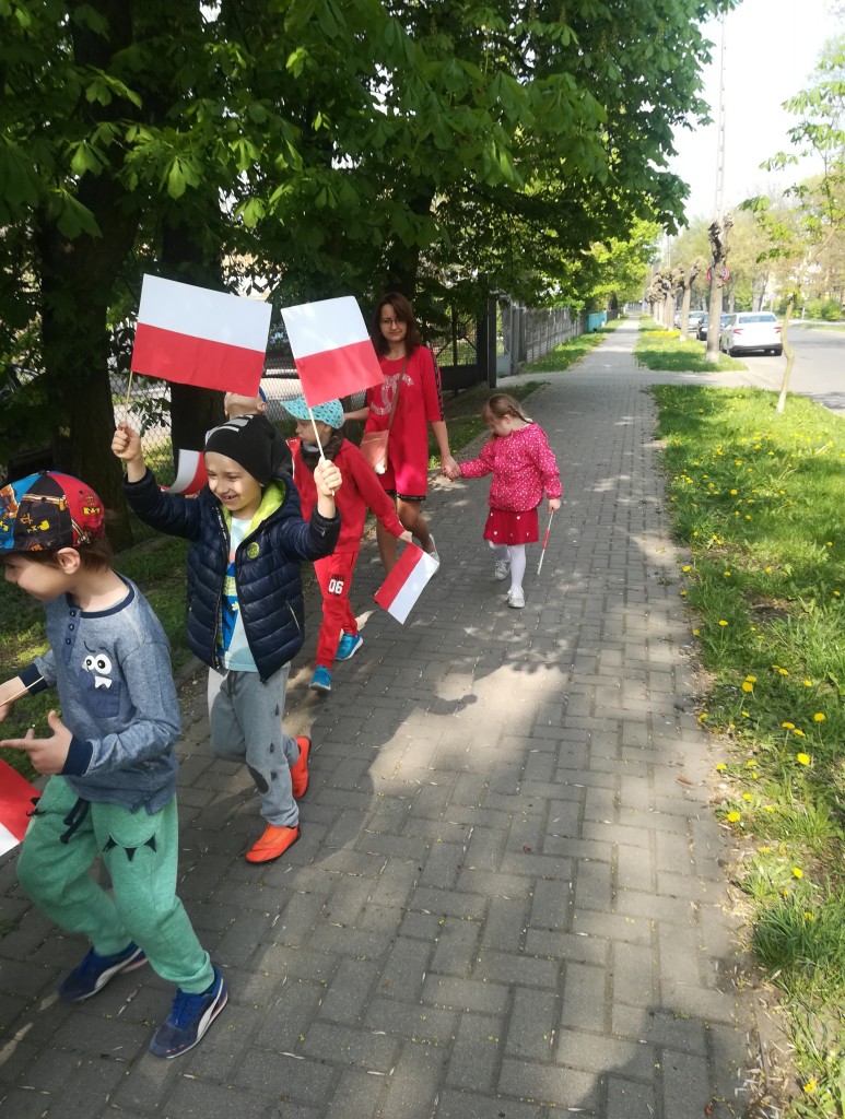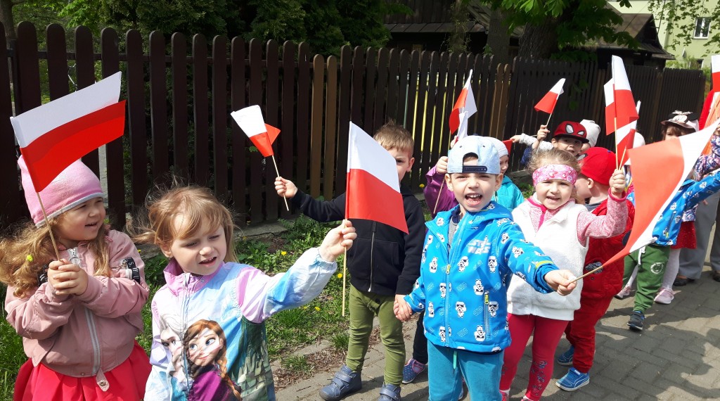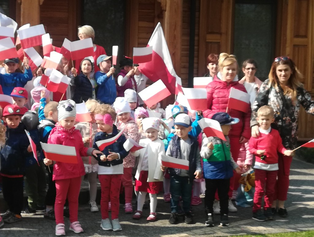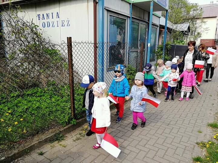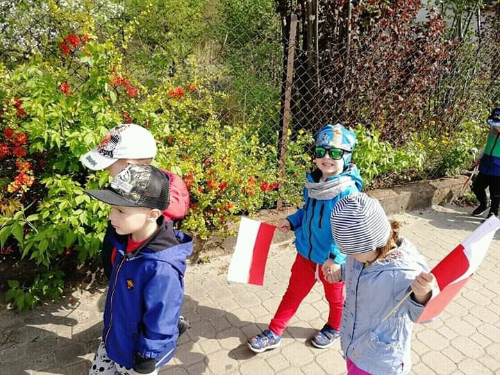 Dnia 2 maja w całej Polsce jest obchodzony Dzień Flagi a 3 maja rocznica uchwalenia Konstytucji 3 maja. Włączając się w obchody zbliżających się świąt majowych mali patrioci z naszego przedszkola dnia 29 kwietnia udali się na przemarsz ulicami naszego miasta z biało-czerwonymi flagami. Dzieci dumnie demonstrowały swój patriotyzm i poszanowanie dla symboli narodowych.