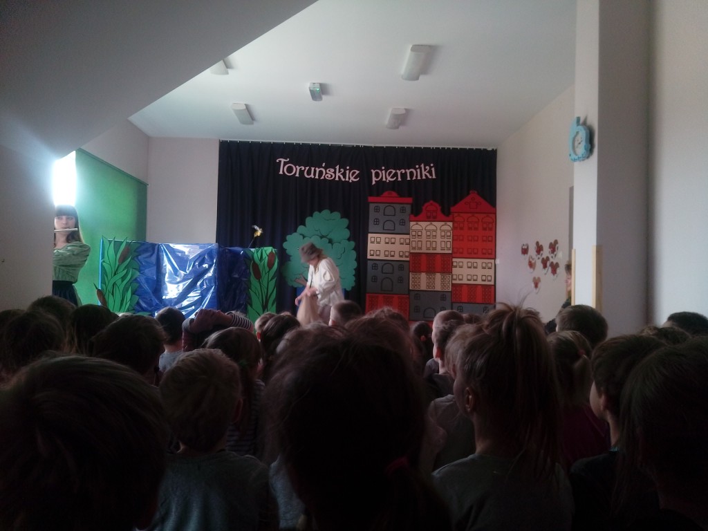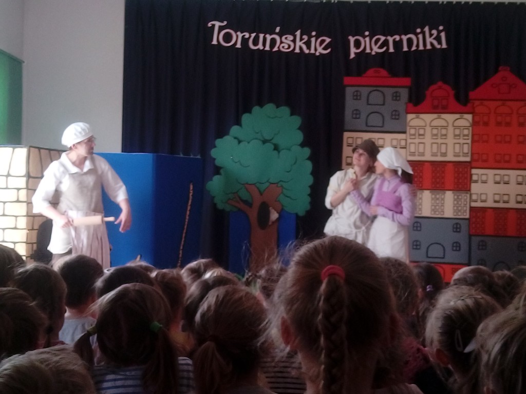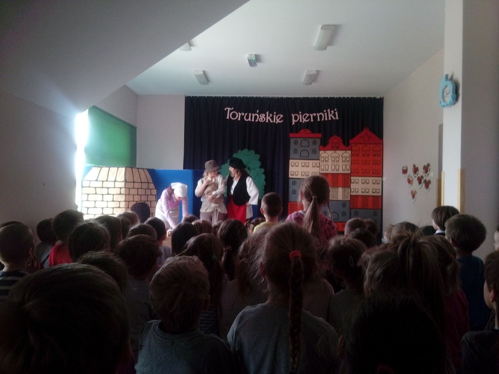 4 i 6-latki poznały legendę „Toruńskich pierników” podczas inscenizacji przygotowanej przez nauczycieli naszego przedszkola mieszczącego się na ul. Łomaskiej. To tam, do sali teatralnej, na zaproszenie nauczycieli-aktorów udaliśmy się 24 kwietnia 2019r. Z podziwem, koncentracją i ogromnym zainteresowaniem oglądaliśmy spektakl wzbogacając wiedzę o naszym kraju, o jednym z naszych miast. Na długo zapamiętamy tą legendę, ponieważ nie tylko słuchaliśmy i oglądaliśmy, także smakowaliśmy „katarzynek”.