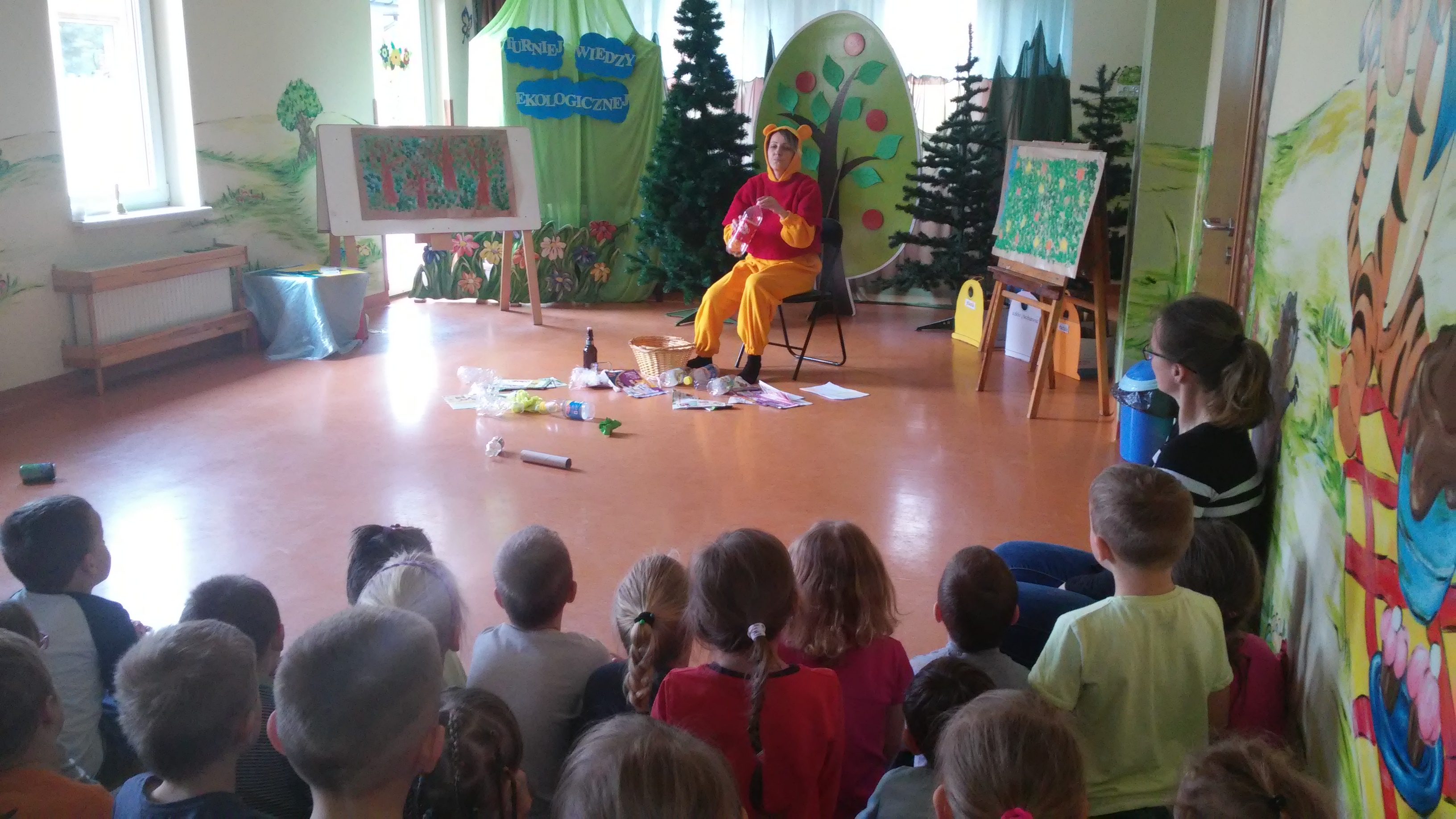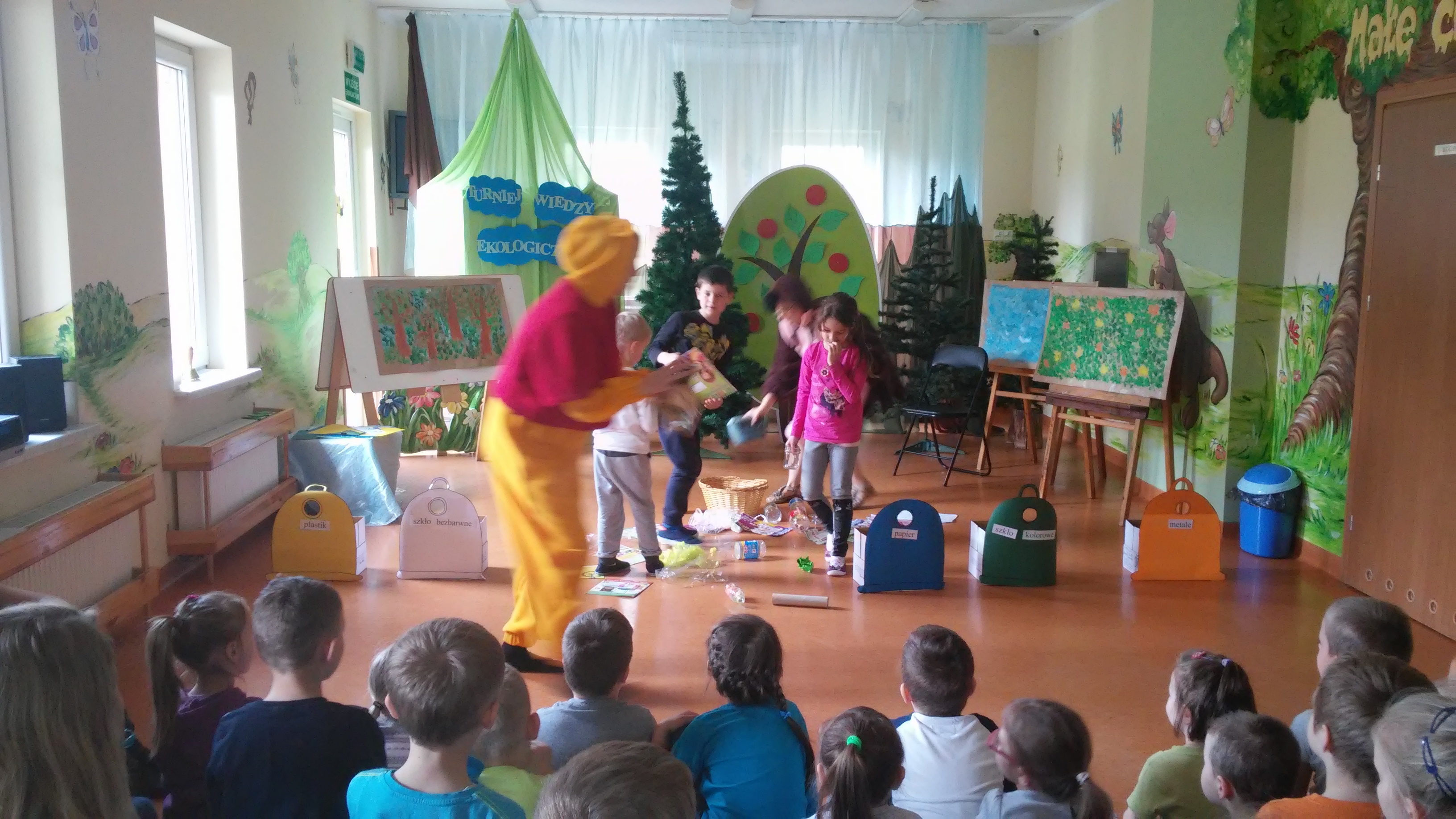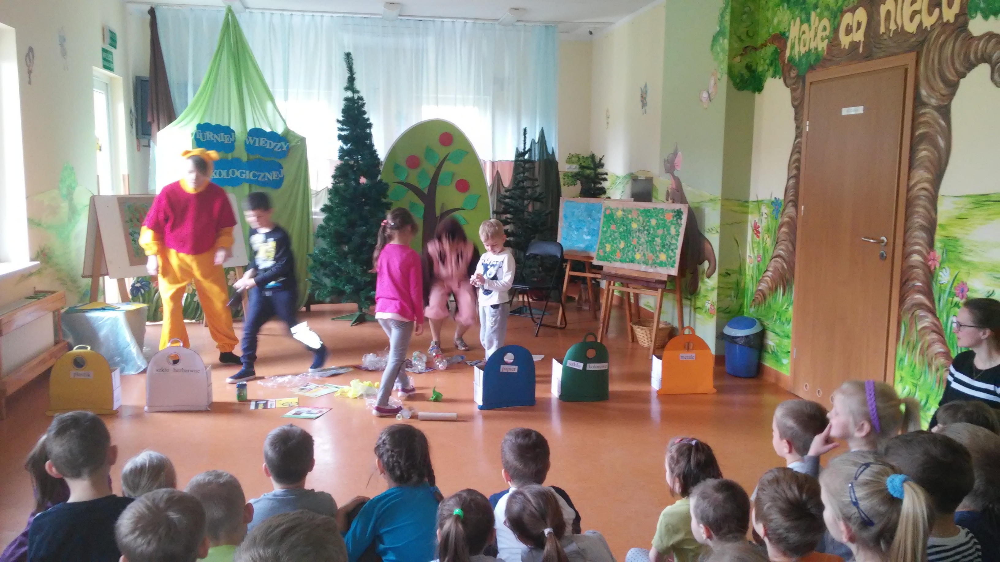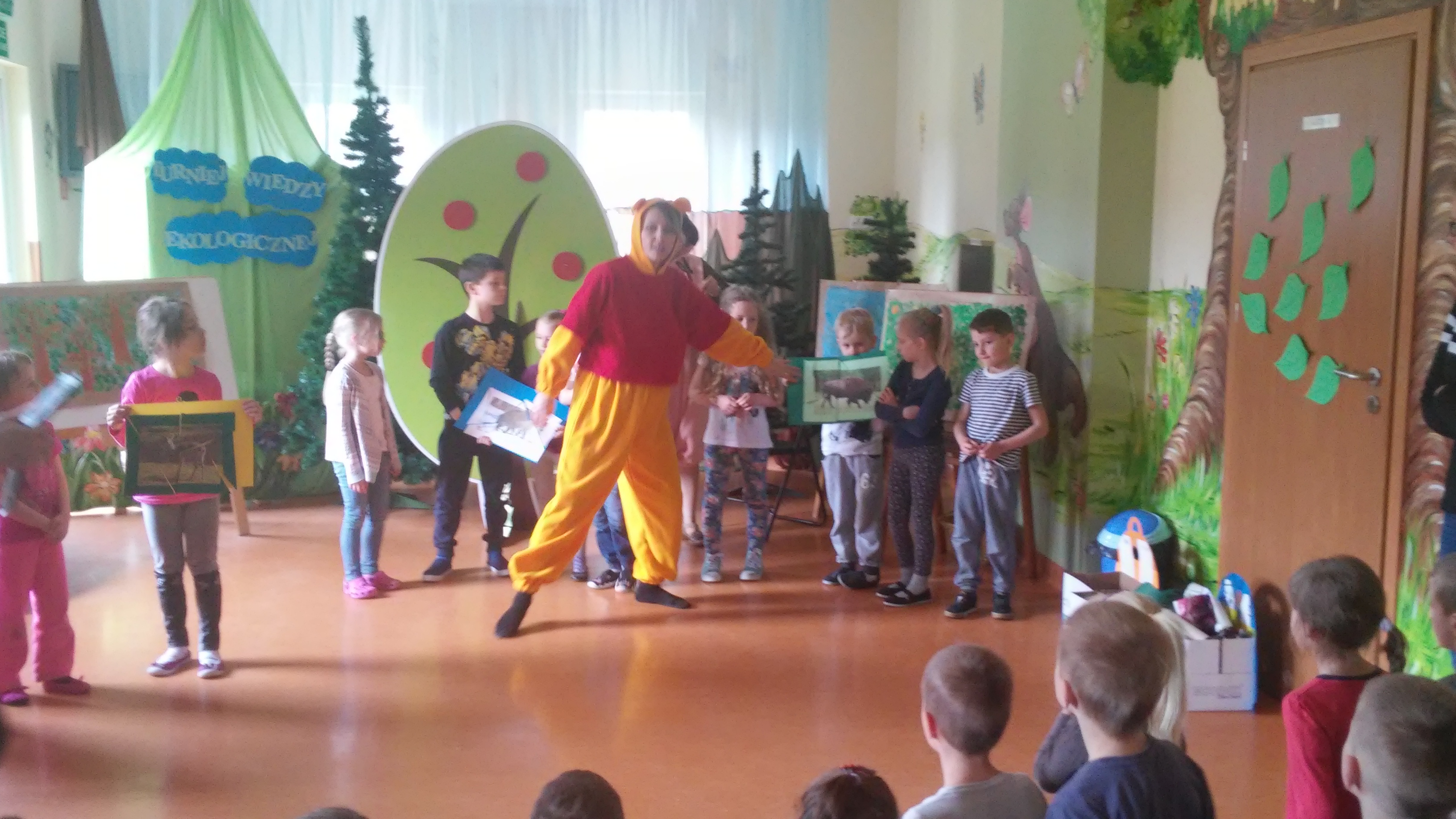 Ekologia to bardzo ważna nauka o tym, jak funkcjonuje środowisko, zwierzęta, ludzie, rośliny. Na świecie podejmuje się wiele działań mających na celu budzenie świadomości ekologicznej, wdrażanie do odpowiedzialności za jej stan, kształtowanie właściwego, opiekuńczego stosunku do świata roślin i zwierząt. W naszym przedszkolu takim działaniem był Turniej Wiedzy Ekologicznejm przeznaczony dla 5 i 6 latków, który odbył się 26 kwietnia. Podczas quizu wykorzystywaliśmy zdobyte wcześniej wiadomości dotyczące przyrody i jej ochrony poprzez: pomoc Kubusiowi Puchatkowi w segregowaniu śmieci, odgadywaniu zagadek o tematyce ekologicznej, układaniu puzzli, przyporządkowaniu etykiet z nazwami zwierząt do odpowiedniego środowiska przedstawionego na plakacie. Ostatnim zadaniem było naklejenie listków na sylwetę drzewa. Przy tym działaniu wykazaliśmy się postawą zgodnej współpracy w grupach. Z łatwością rozpoznaliśmy też gatunki drzew – klonu, dębu i brzozy. Wszyscy doskonale poradziliśmy sobie z powierzonymi zadaniami. Na zakończenie każda grupa otrzymała zwycięski dyplom i książkę o zwierzętach, która w każdej sali zajmuje honorowe miejsce w Kąciku Książki.