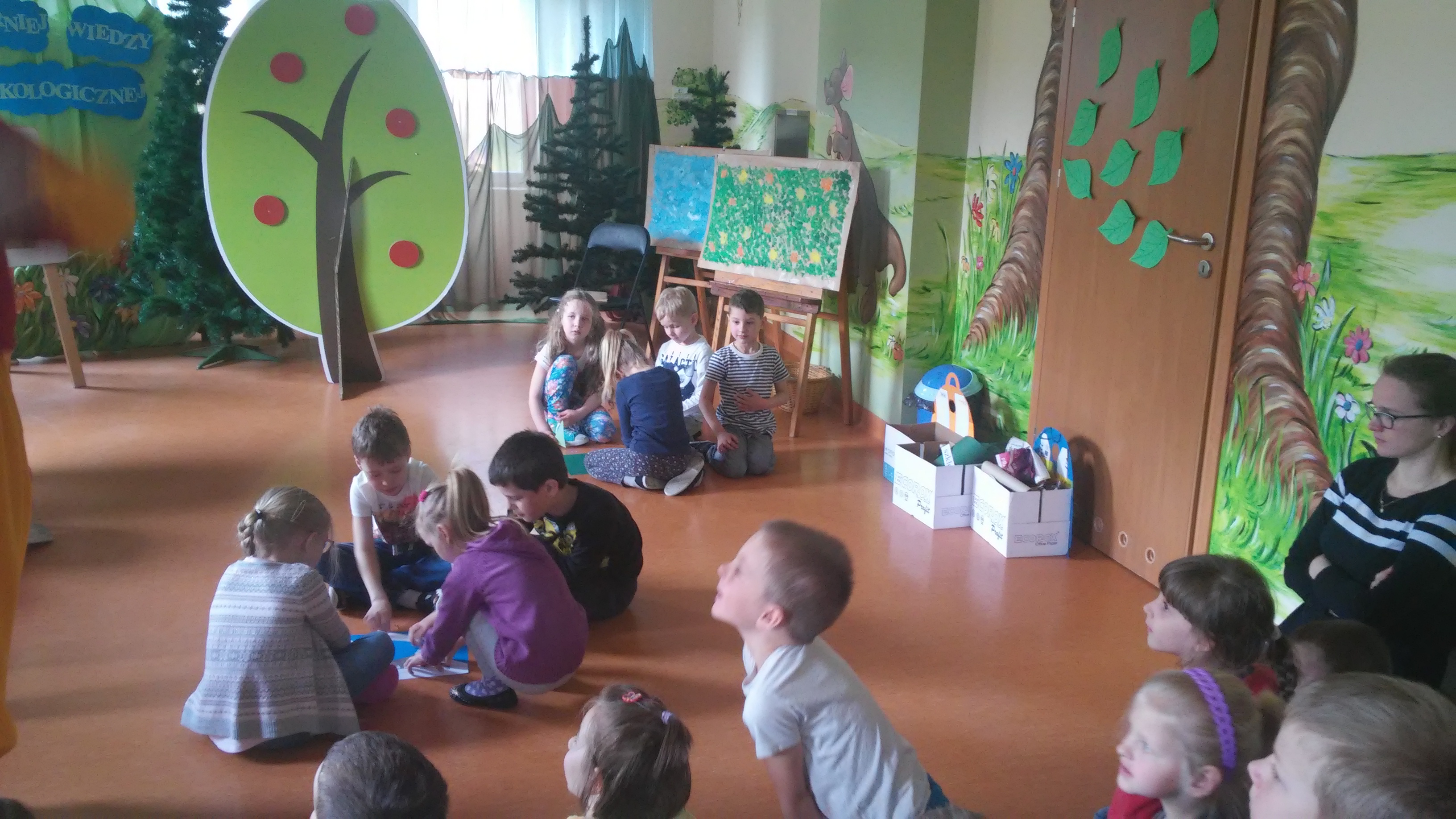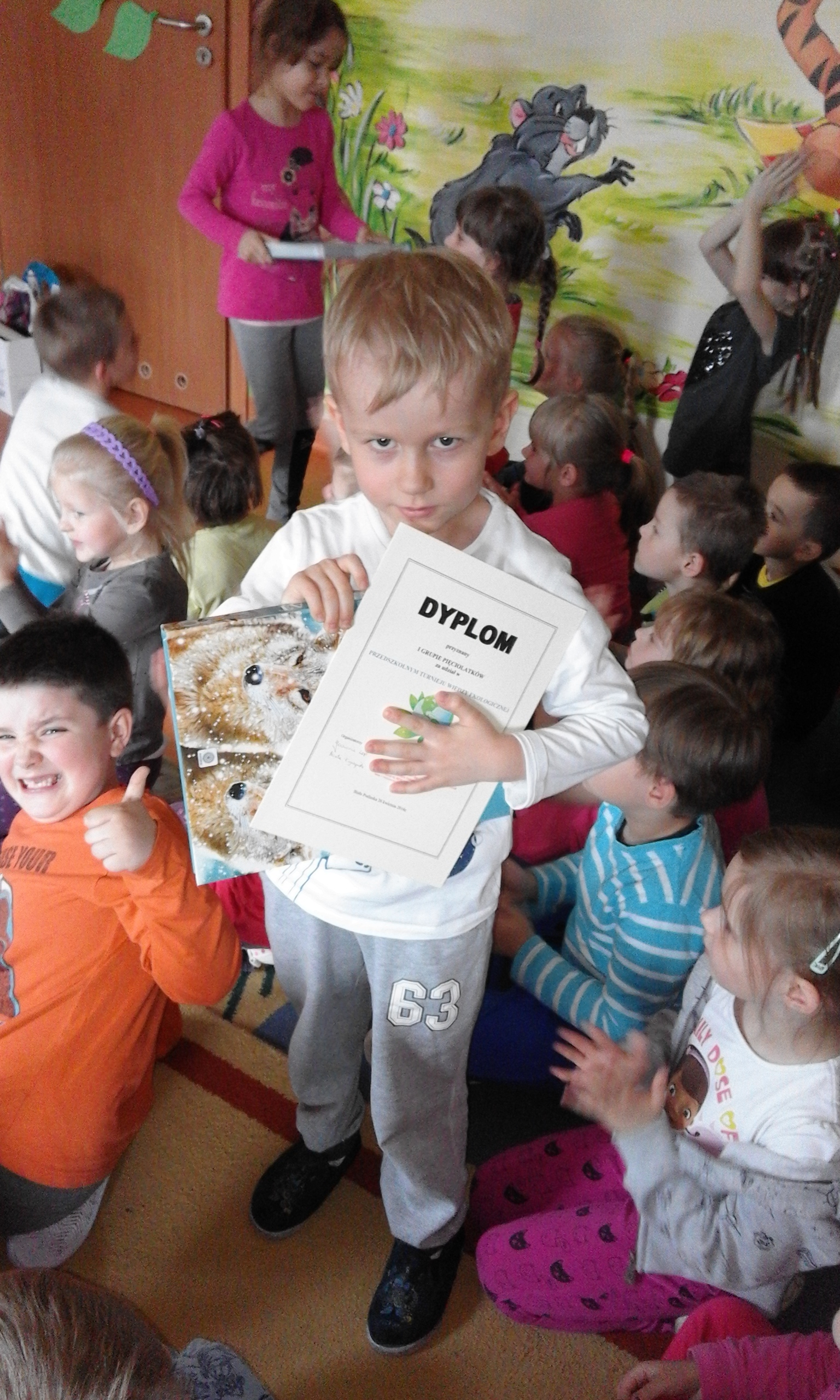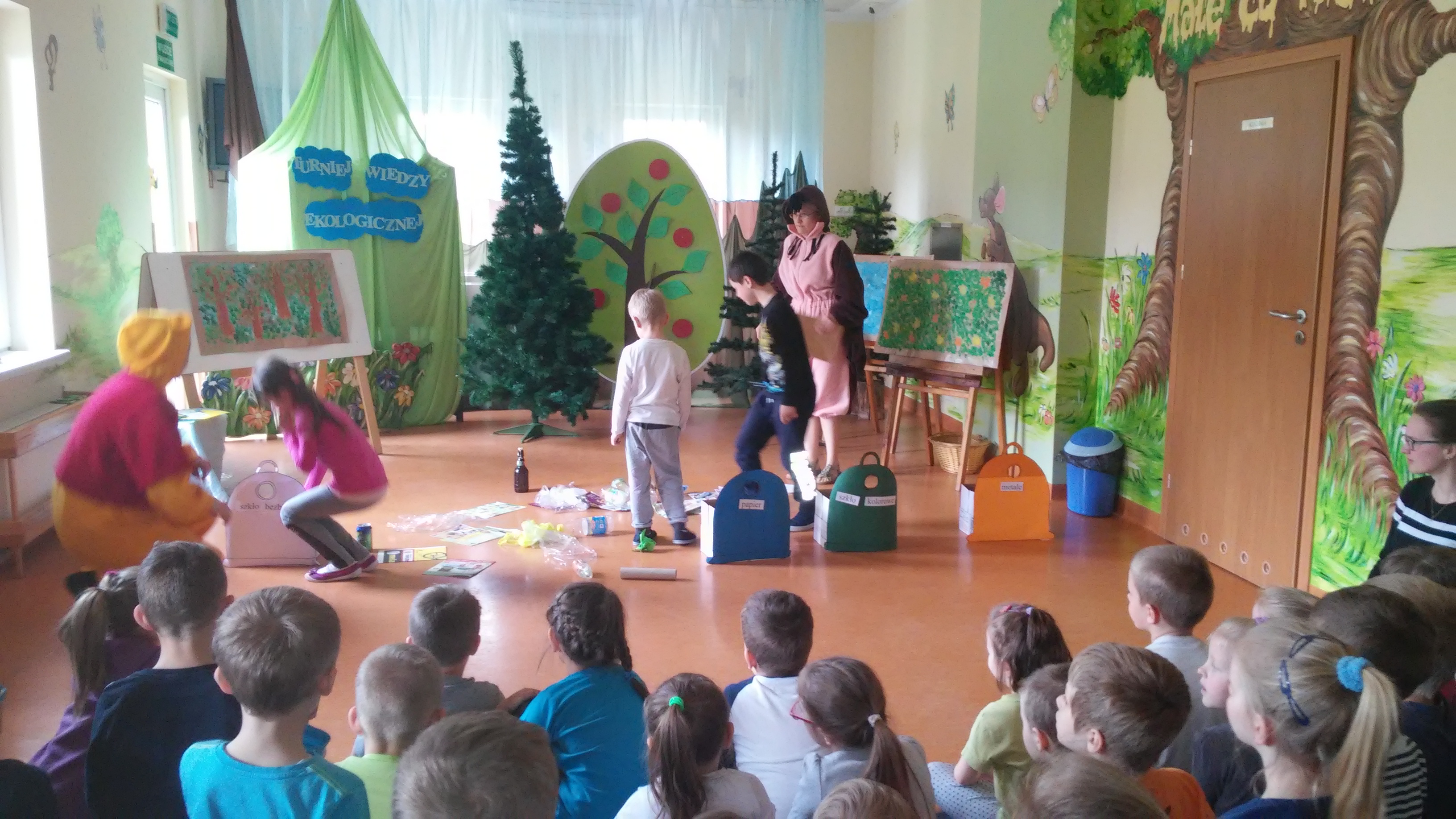 Ekologia to bardzo ważna nauka o tym, jak funkcjonuje środowisko, zwierzęta, ludzie, rośliny. Na świecie podejmuje się wiele działań mających na celu budzenie świadomości ekologicznej, wdrażanie do odpowiedzialności za jej stan, kształtowanie właściwego, opiekuńczego stosunku do świata roślin i zwierząt. W naszym przedszkolu takim działaniem był Turniej Wiedzy Ekologicznejm przeznaczony dla 5 i 6 latków, który odbył się 26 kwietnia. Podczas quizu wykorzystywaliśmy zdobyte wcześniej wiadomości dotyczące przyrody i jej ochrony poprzez: pomoc Kubusiowi Puchatkowi w segregowaniu śmieci, odgadywaniu zagadek o tematyce ekologicznej, układaniu puzzli, przyporządkowaniu etykiet z nazwami zwierząt do odpowiedniego środowiska przedstawionego na plakacie. Ostatnim zadaniem było naklejenie listków na sylwetę drzewa. Przy tym działaniu wykazaliśmy się postawą zgodnej współpracy w grupach. Z łatwością rozpoznaliśmy też gatunki drzew – klonu, dębu i brzozy. Wszyscy doskonale poradziliśmy sobie z powierzonymi zadaniami. Na zakończenie każda grupa otrzymała zwycięski dyplom i książkę o zwierzętach, która w każdej sali zajmuje honorowe miejsce w Kąciku Książki.