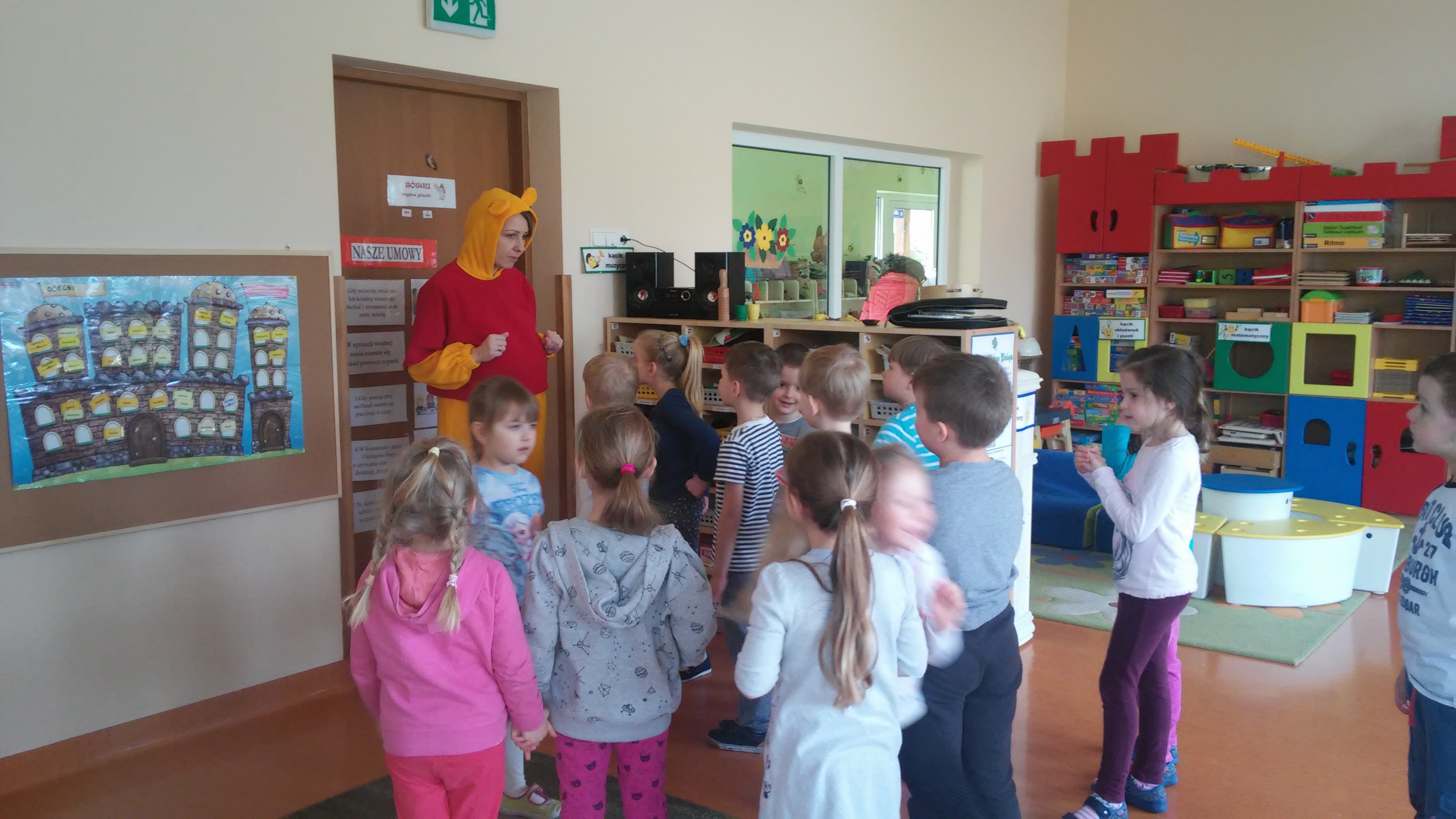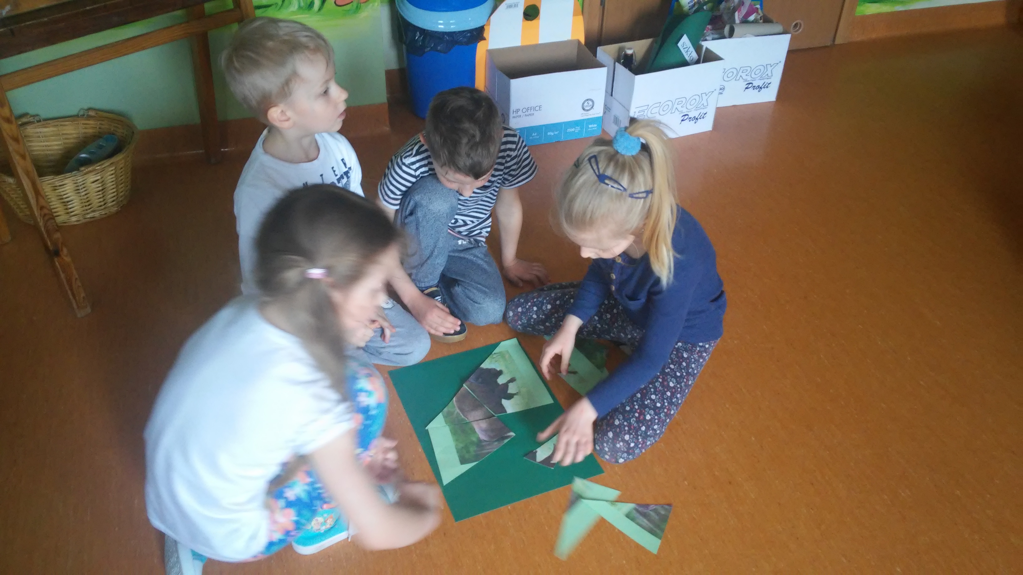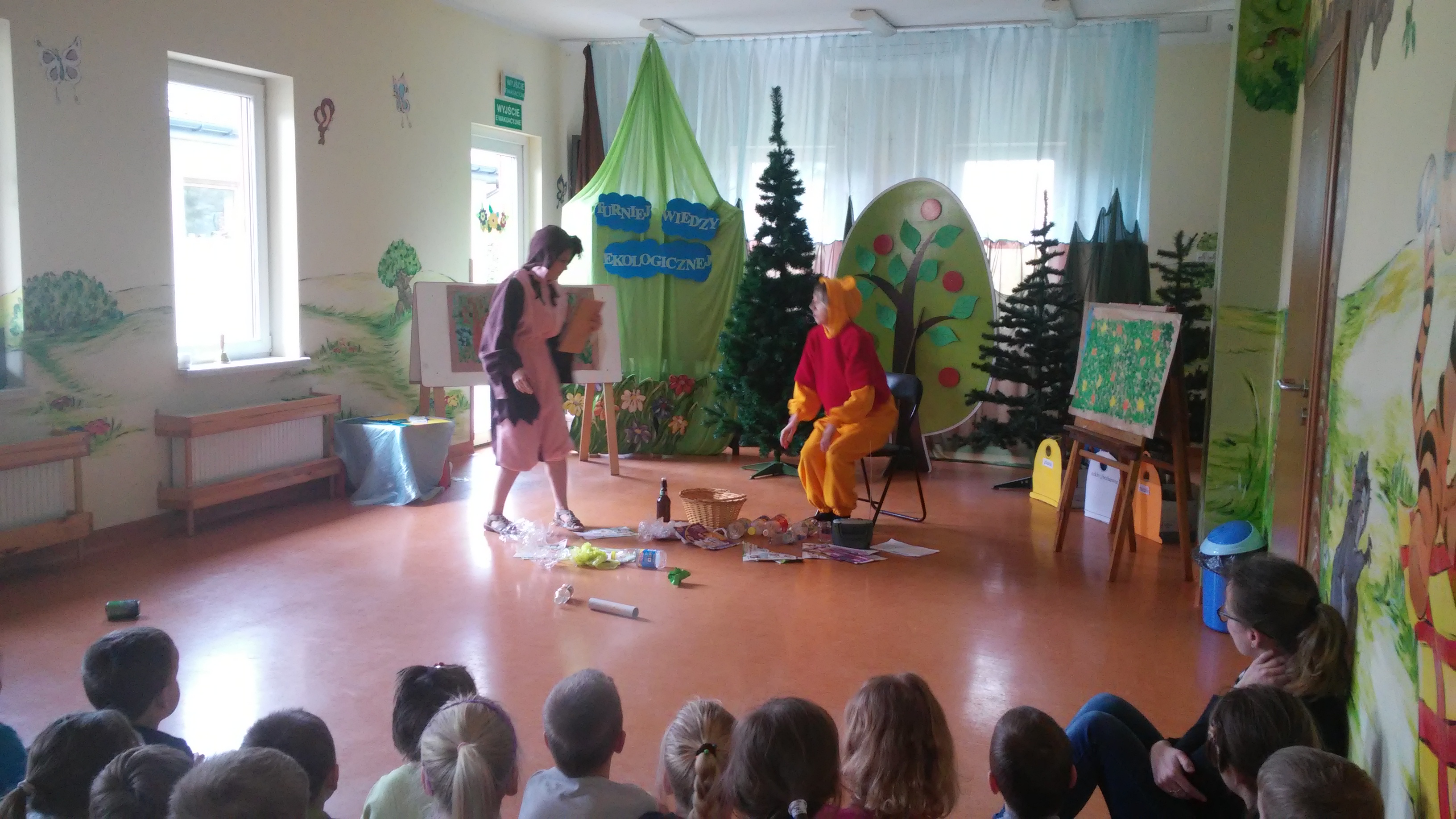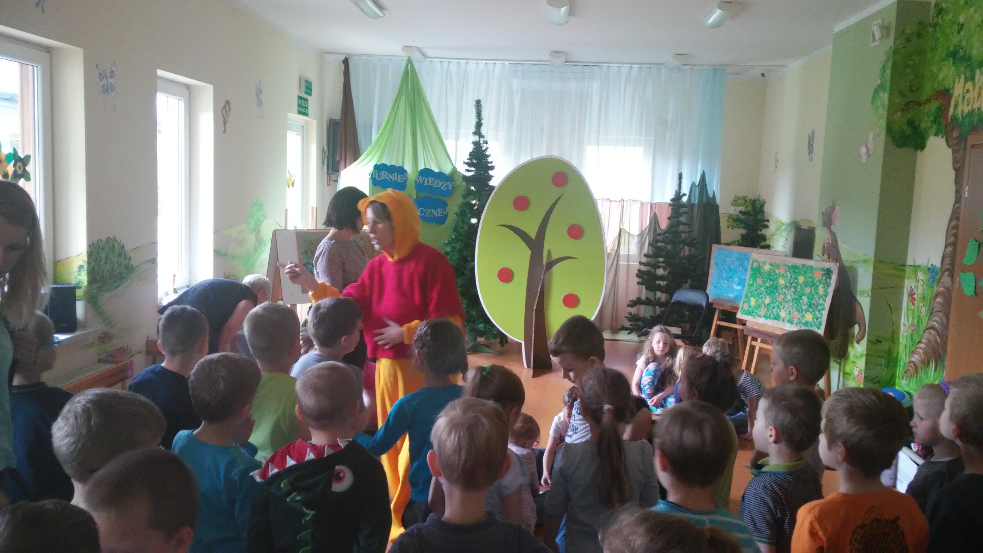 Ekologia to bardzo ważna nauka o tym, jak funkcjonuje środowisko, zwierzęta, ludzie, rośliny. Na świecie podejmuje się wiele działań mających na celu budzenie świadomości ekologicznej, wdrażanie do odpowiedzialności za jej stan, kształtowanie właściwego, opiekuńczego stosunku do świata roślin i zwierząt. W naszym przedszkolu takim działaniem był Turniej Wiedzy Ekologicznejm przeznaczony dla 5 i 6 latków, który odbył się 26 kwietnia. Podczas quizu wykorzystywaliśmy zdobyte wcześniej wiadomości dotyczące przyrody i jej ochrony poprzez: pomoc Kubusiowi Puchatkowi w segregowaniu śmieci, odgadywaniu zagadek o tematyce ekologicznej, układaniu puzzli, przyporządkowaniu etykiet z nazwami zwierząt do odpowiedniego środowiska przedstawionego na plakacie. Ostatnim zadaniem było naklejenie listków na sylwetę drzewa. Przy tym działaniu wykazaliśmy się postawą zgodnej współpracy w grupach. Z łatwością rozpoznaliśmy też gatunki drzew – klonu, dębu i brzozy. Wszyscy doskonale poradziliśmy sobie z powierzonymi zadaniami. Na zakończenie każda grupa otrzymała zwycięski dyplom i książkę o zwierzętach, która w każdej sali zajmuje honorowe miejsce w Kąciku Książki.