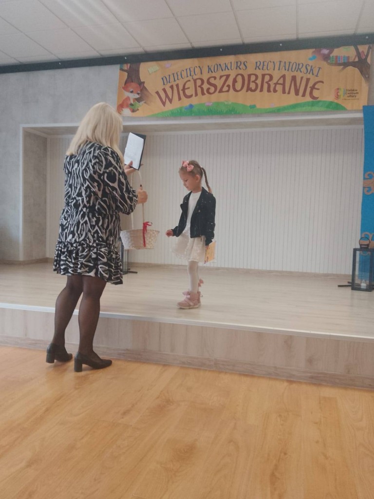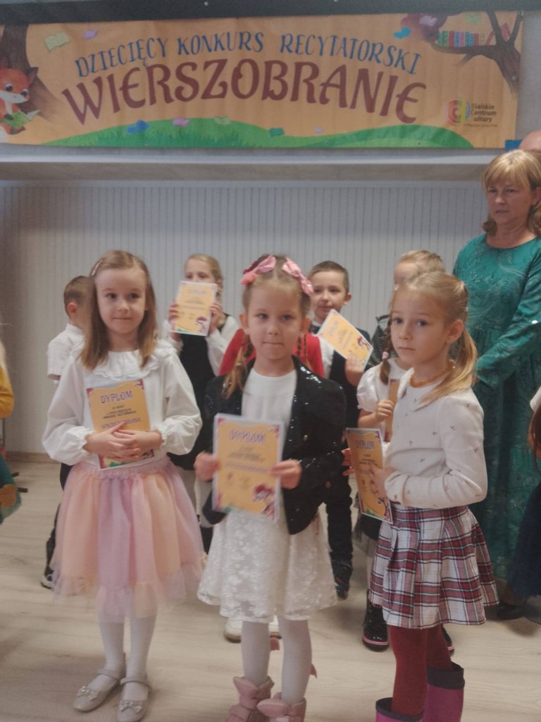 W konkursie udział wzięły dzieci z grup 5 i 6 latków z ul. Kolejowej: Rozalia, Ryszard, Kornelia i Stanisław zaś z ul. Łomaskiej: Adrianna i Hanna. Wszycy oni z wysokim poziomem kultury żywego słowa recytowali wybrane wiersze. Gratulujemy odwagi i pięknej recytacji. Wśród wszystkich reprezentantów mamy jednego laureata - Stanisława z grupy 5 latków. Cieszymy się tym wyróżnieniem i gratulujemy.