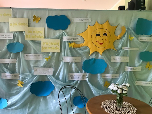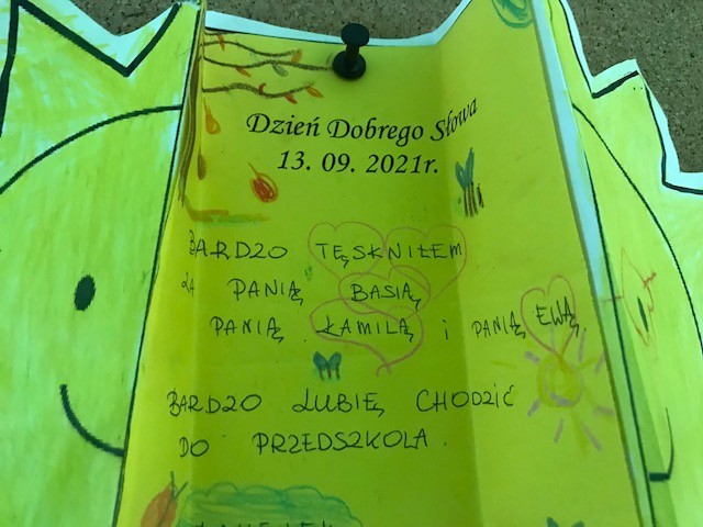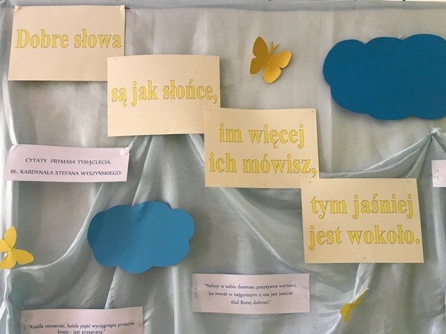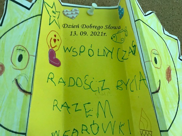 Wrześniowe słońce było inspiracją do pomysłu na świętowanie Dnia Dobrego Słowa. Tym razem dzieci przy aktywnym udziale rodziców oraz wychowawczyń wykonały Słoneczka z Dobrymi Słowami (3 latki) oraz Kartki z Dobrym Słowem (5 i 6 latki). Dobre słowa zawarte na ww. pracach nawiązywały do minionych wakacji oraz do roku szkolnego, który się niedawno rozpoczął. Dziękujemy wszystkim, którzy zangażowali się w te działania i życzymy aby dobre słowa rozświetlały naszą codzienność przedszkolną oraz rodzinną, aby dawały siłę do działania i zmieniania rzeczywistości na lepszą. Dobrą inspirację do zmiany na lepsze stanowiły cytaty bł. Kardynała Stefana Wyszyńskiego, które były wyeksponowane w przedszkolu w ramach naszego świętowania.