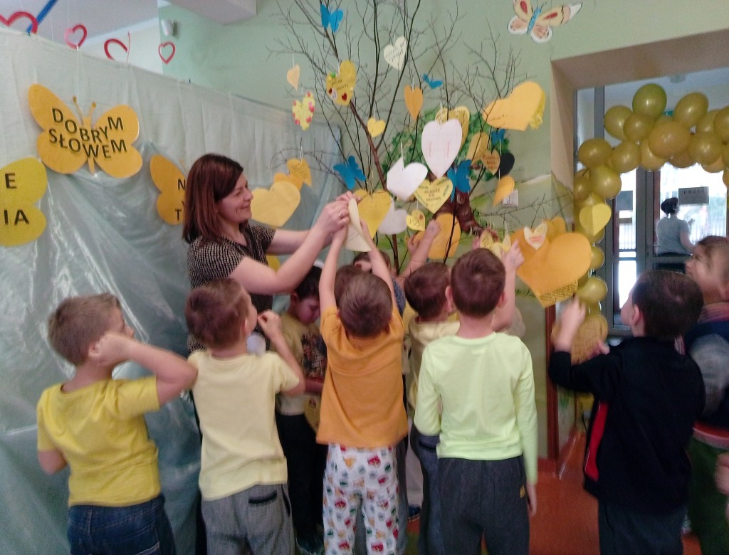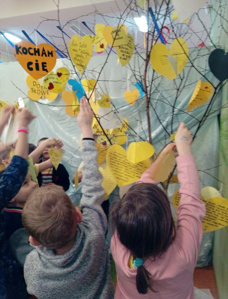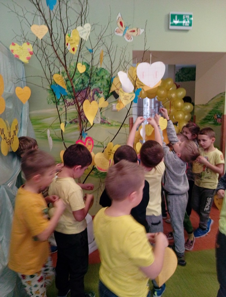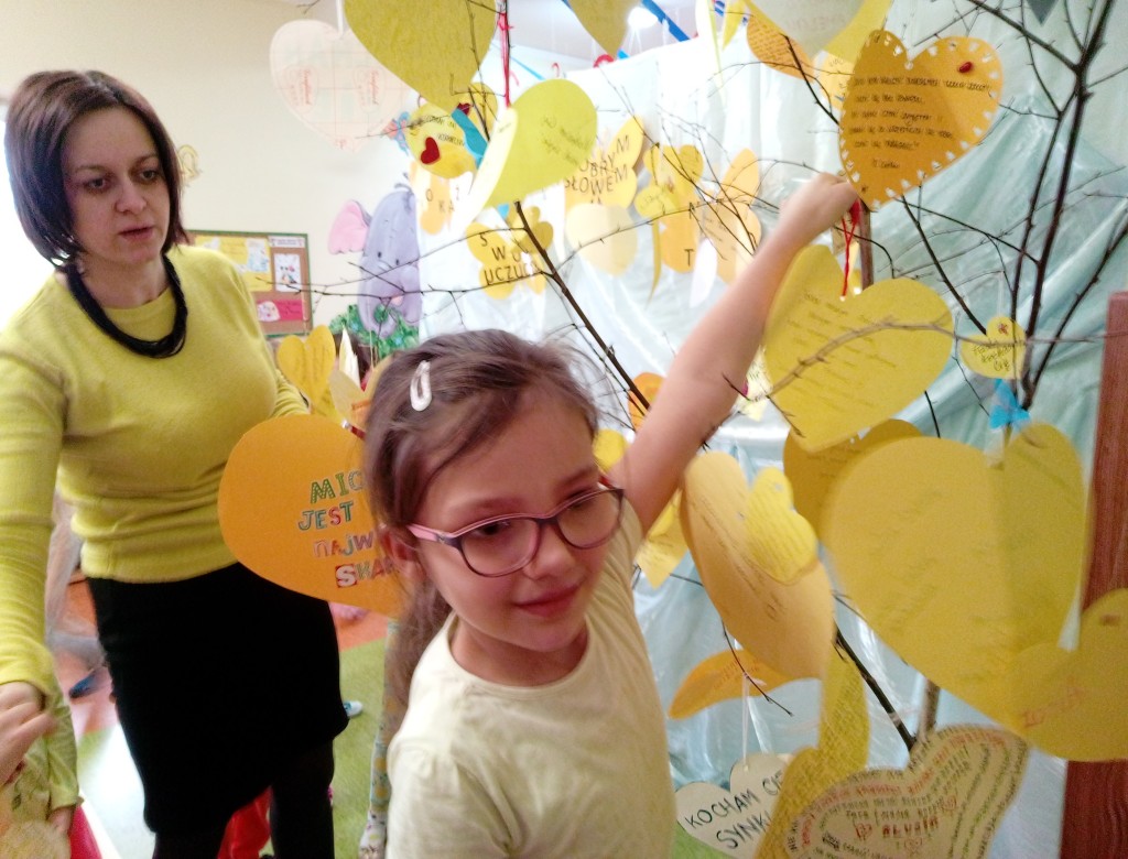 W lutym, połączyliśmy świętowanie Dnia Dobrego Słowa z Walentynkami. "Okazuj swoje uczucia dobrym słowem - nie tylko w Walentynki" - to hasło przewodnie tego świętowania. Tego dnia w przedszkolu pojawiło się drzewo pełne żółtych serc ze słowami, które mówią o rodzicielskiej miłości. Dziękujemy Wam Szanowni Rodzice za Wasze ogromne zaangażowanie i wspieranie naszych działań. Z wielkim wzruszeniem czytałyśmy Wasze słowa zapisane na tych sercach. Widziałyśmy radość i szczęście na twarzach Waszych dzieci kiedy im to czytałyśmy oraz ich zaangażowanie w wykonywanie serc dla Was.