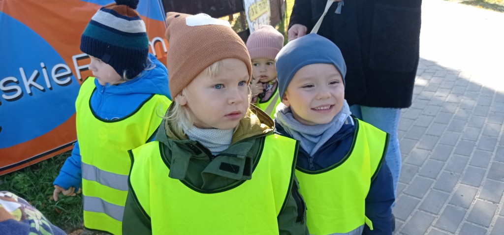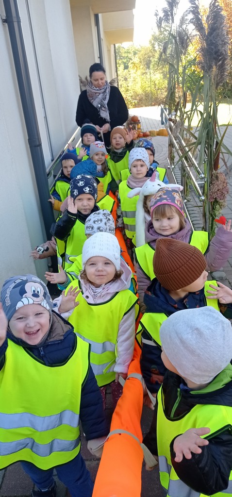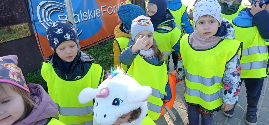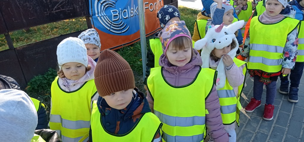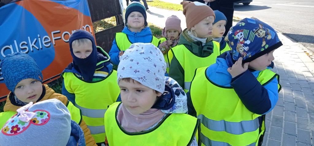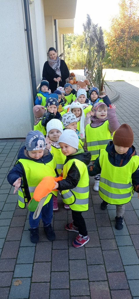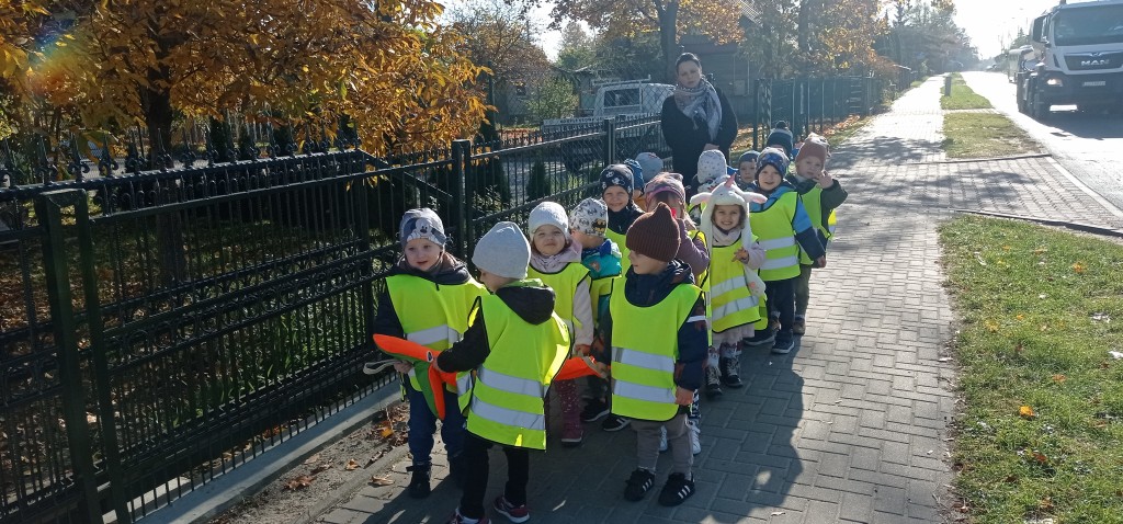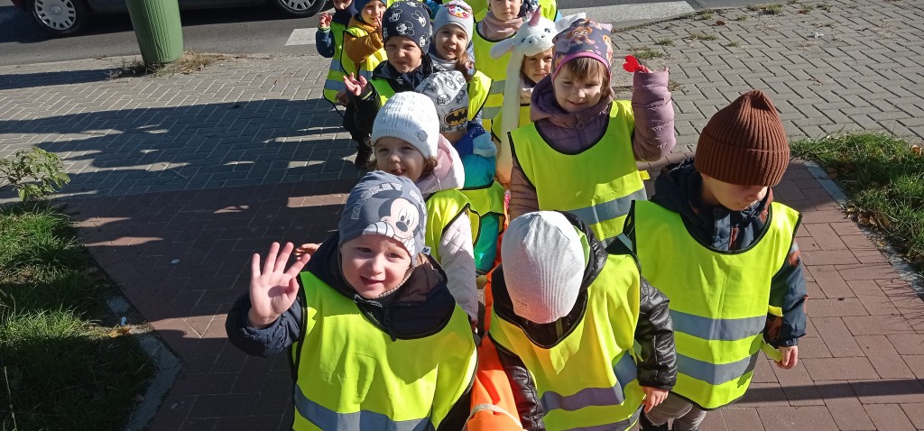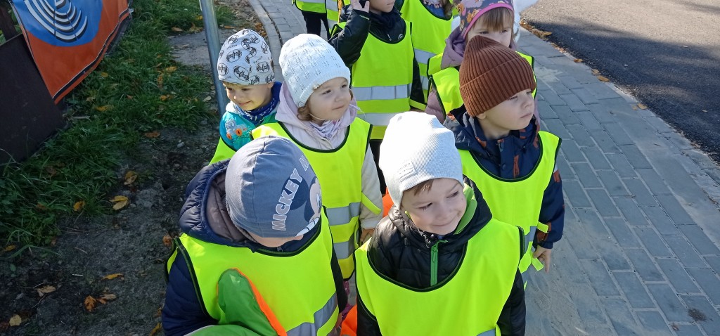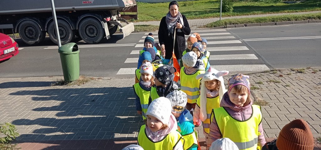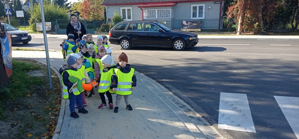 Dnia 12 października wybraliśmy się także na pobliskie skrzyżowanie, aby w praktyce doskonalić umiejętność bezpiecznego przechodzenia przez jezdnię. Każdemu z nas dużo radości sprawiło założenie kamizelki odblaskowej.