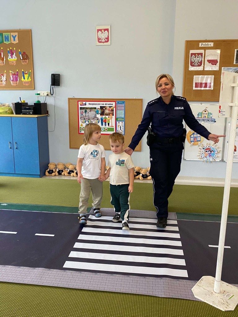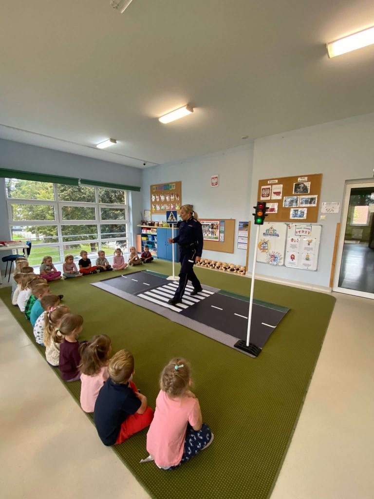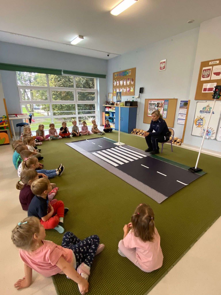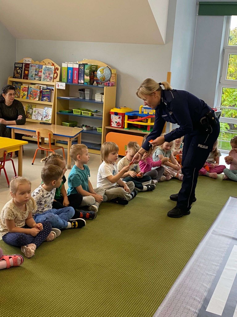 W pierwszym tygodniu października rozmawialiśmy o przepisach drogowych, których trzeba przestrzegać, aby być bezpiecznym na drodze. Naszą wiedzę utrwalaliśmy podczas wizyty w przedszkolu pani policjantki, z którą ćwiczyliśmy przechodzenia przez przejście dla pieszych z sygnalizacją i bez. Rozmawialiśmy również, o tym, czego unikać w kontaktach z nieznajomymi. Na pamiątkę spotkania otrzymaliśmy breloczki odblaskowe.
