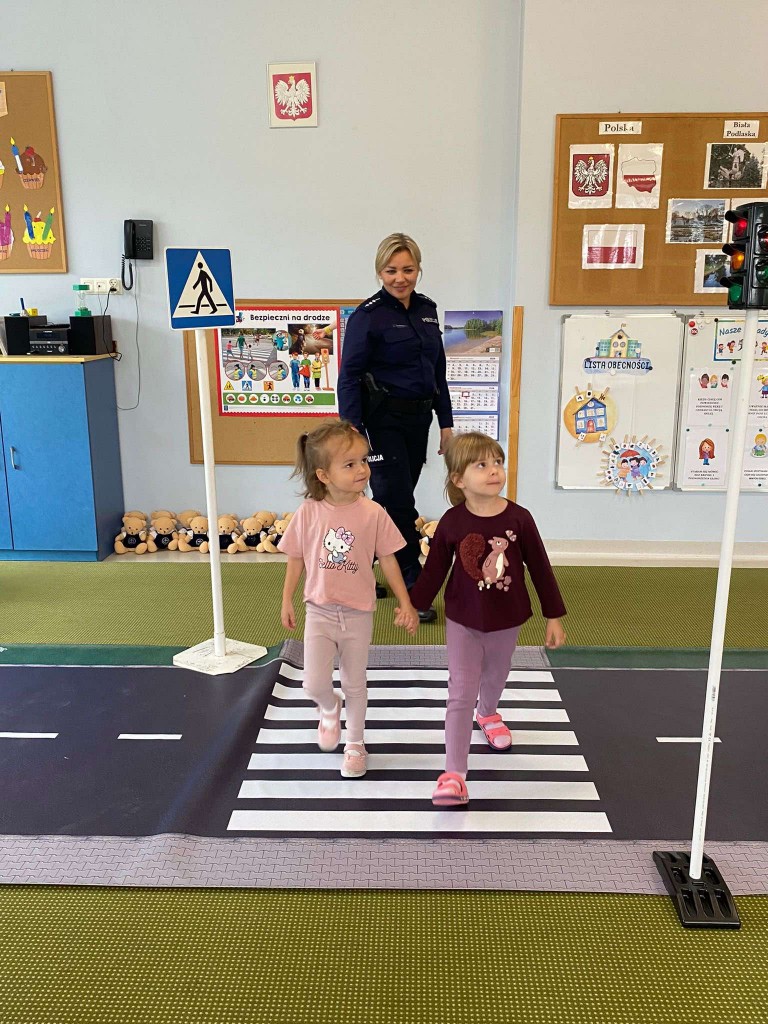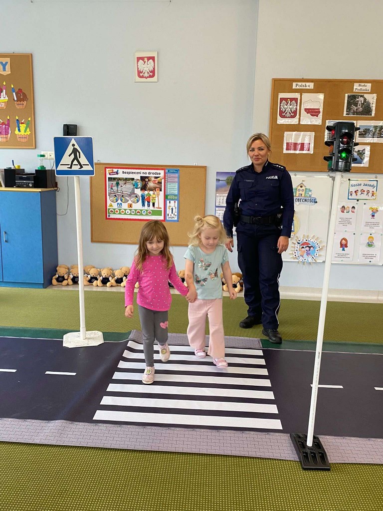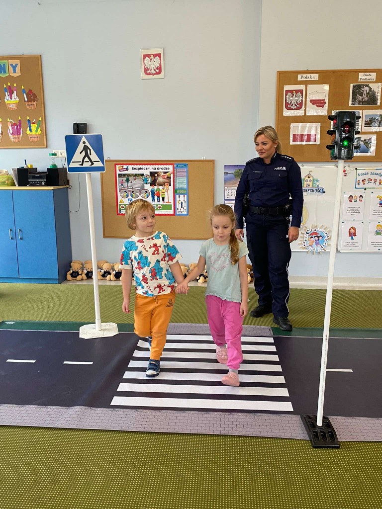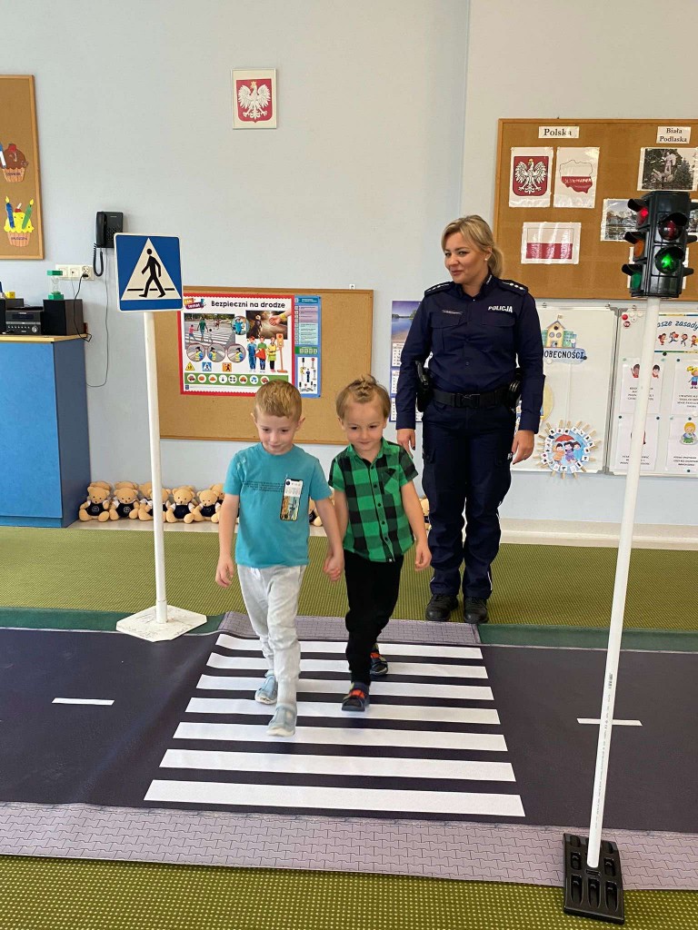 W pierwszym tygodniu października rozmawialiśmy o przepisach drogowych, których trzeba przestrzegać, aby być bezpiecznym na drodze. Naszą wiedzę utrwalaliśmy podczas wizyty w przedszkolu pani policjantki, z którą ćwiczyliśmy przechodzenia przez przejście dla pieszych z sygnalizacją i bez. Rozmawialiśmy również, o tym, czego unikać w kontaktach z nieznajomymi. Na pamiątkę spotkania otrzymaliśmy breloczki odblaskowe.