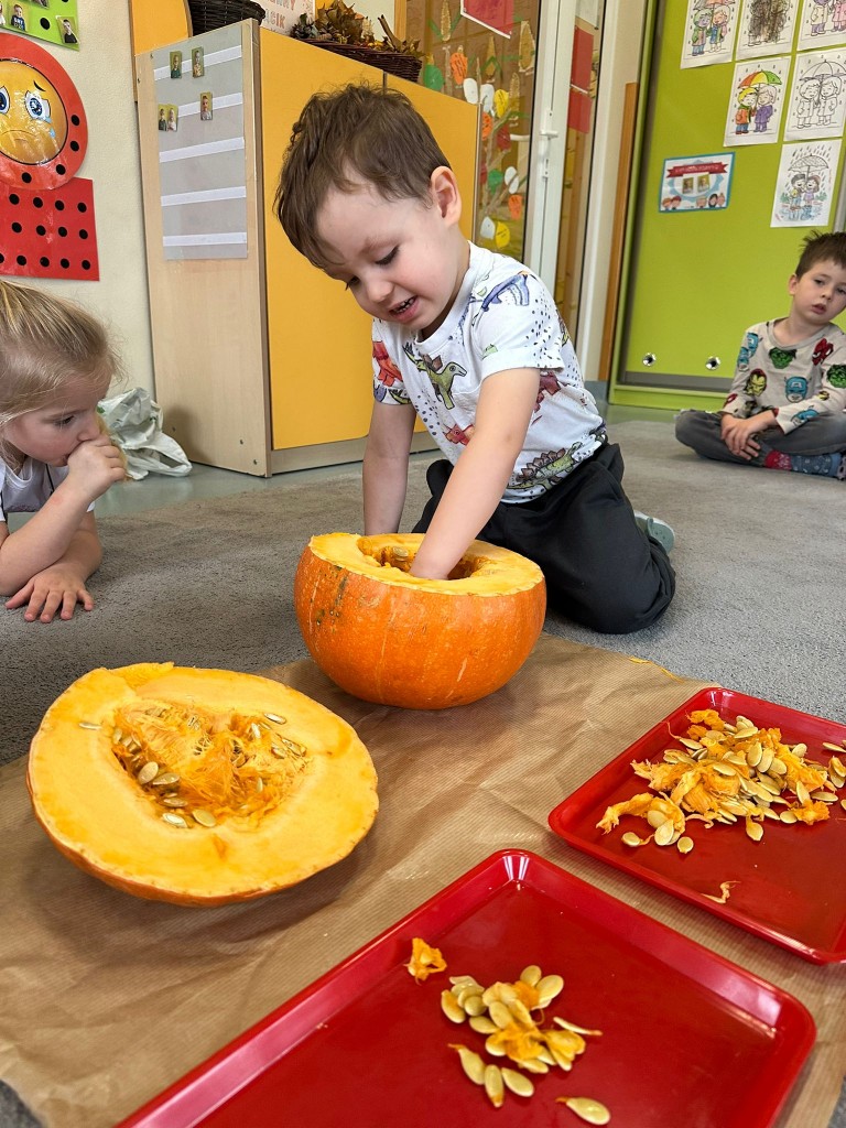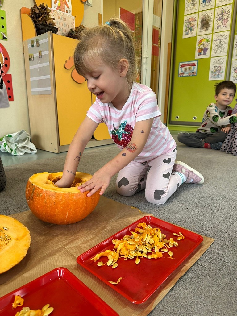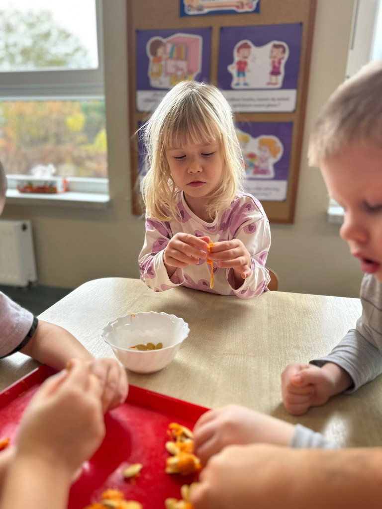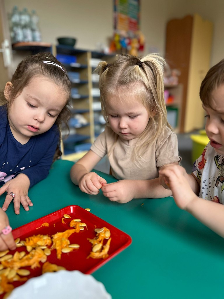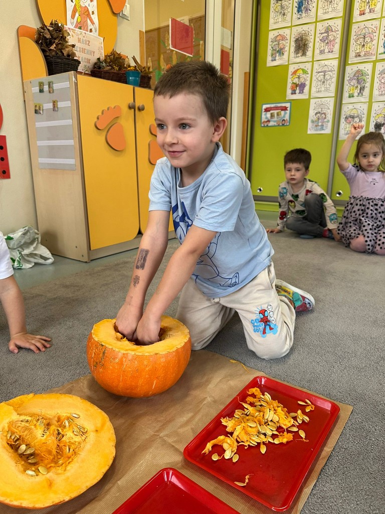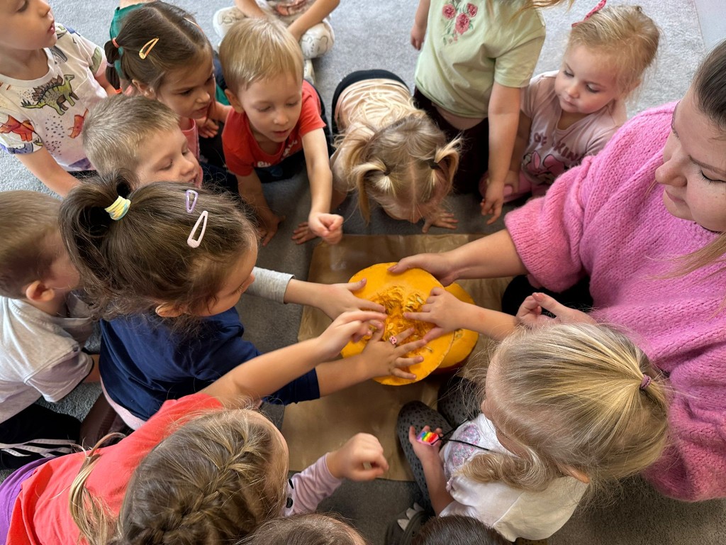 Podczas październikowych zajęć badawczych zamieniliśmy się w prawdziwych odkrywców! Wspólnie sprawdzaliśmy, co kryje w sobie dynia – oglądaliśmy jej kształt, kolor i zapach, a potem zajrzeliśmy do środka. Z zaangażowaniem wydrążaliśmy miąższ i oddzielaliśmy od niego pestki. To była nie tylko wspaniała zabawa, ale też doskonałe ćwiczenie dla naszych małych paluszków! Dzięki takim działaniom rozwijaliśmy motorykę małą, koordynację wzrokowo-ruchową oraz uczyliśmy się cierpliwości i współpracy. Zajęcia przyniosły nam mnóstwo radości i jesiennych wrażeń!