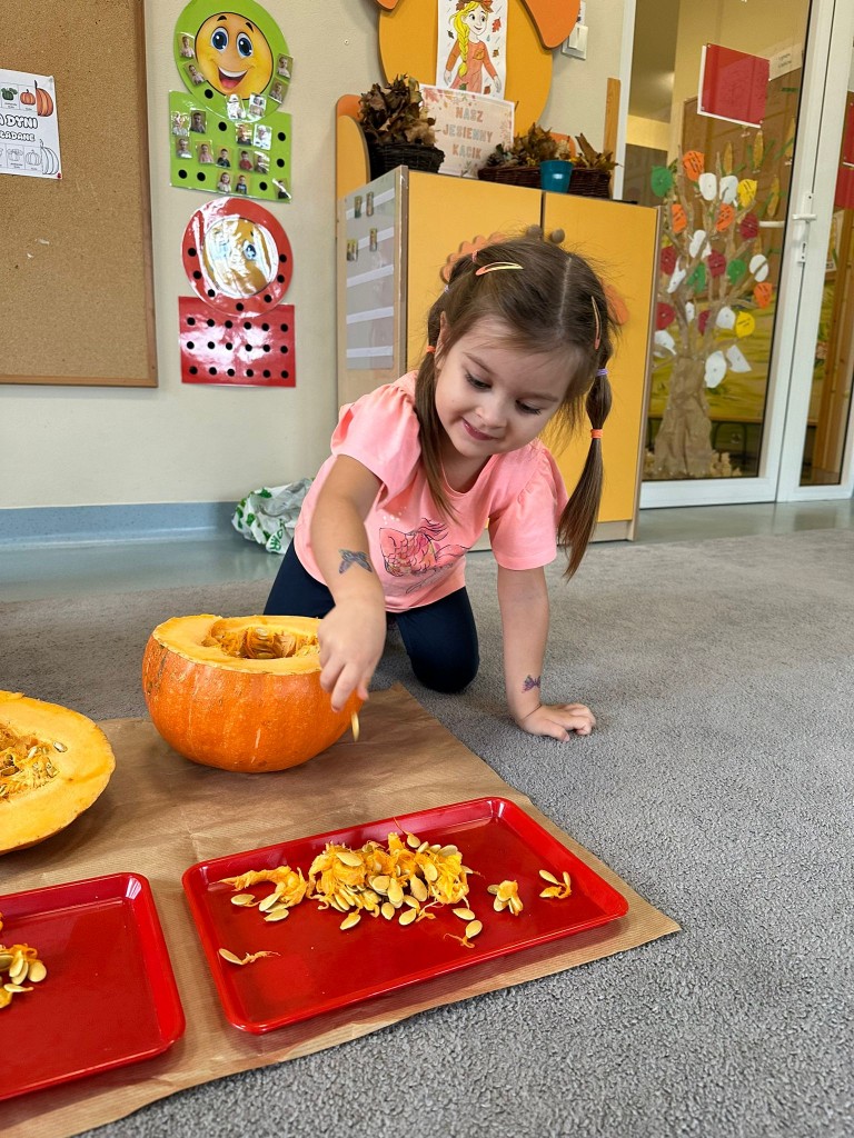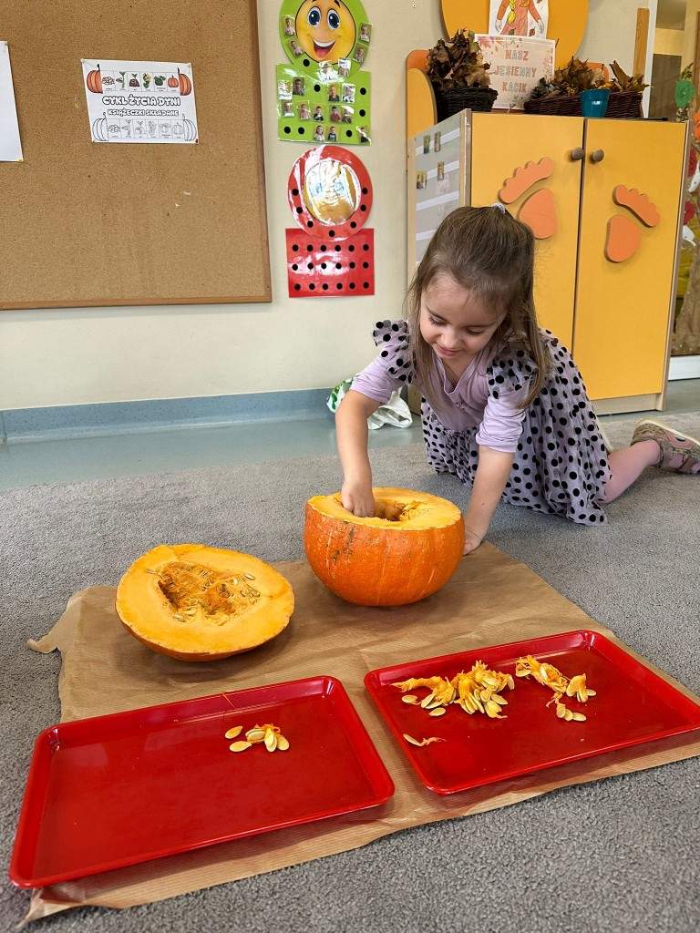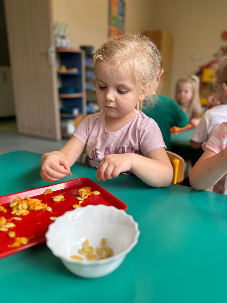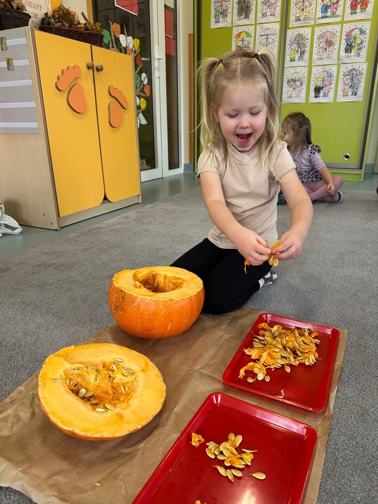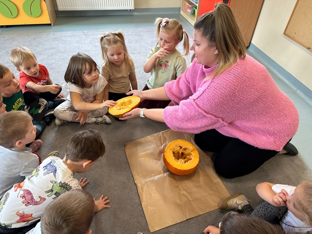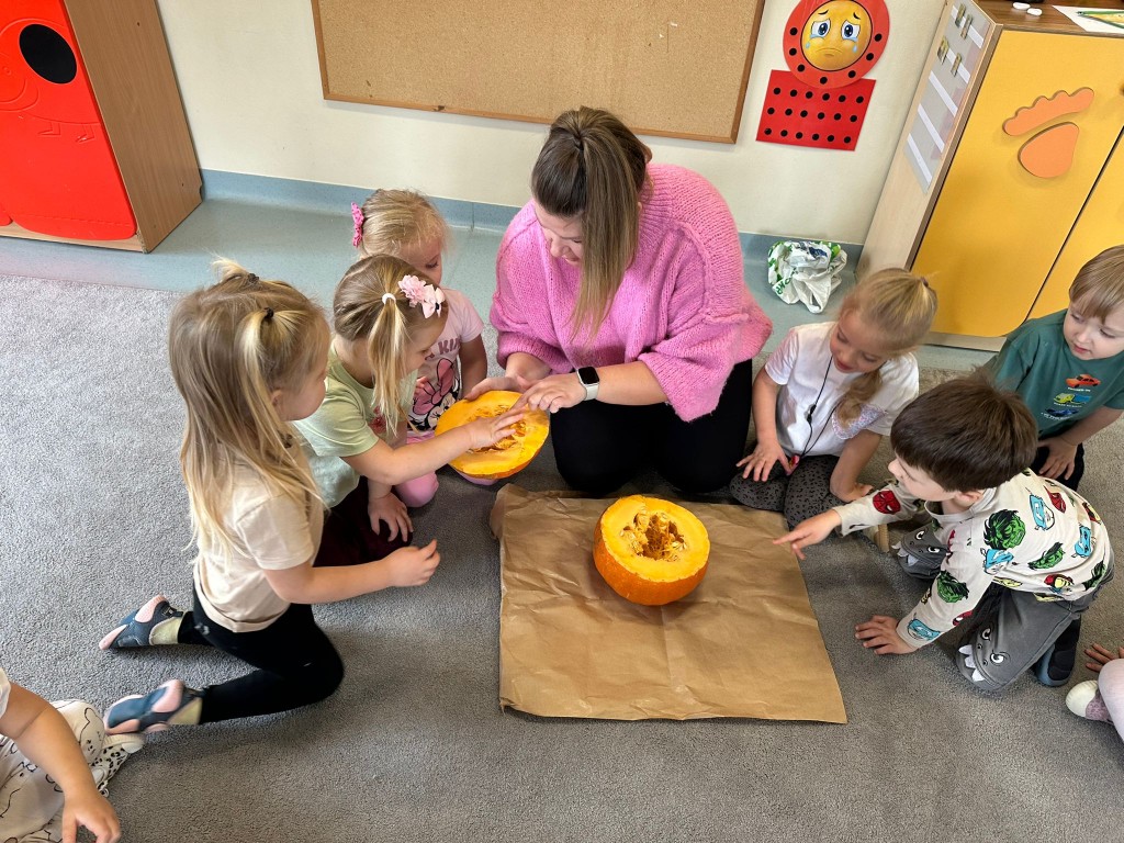 Podczas październikowych zajęć badawczych zamieniliśmy się w prawdziwych odkrywców! Wspólnie sprawdzaliśmy, co kryje w sobie dynia – oglądaliśmy jej kształt, kolor i zapach, a potem zajrzeliśmy do środka. Z zaangażowaniem wydrążaliśmy miąższ i oddzielaliśmy od niego pestki. To była nie tylko wspaniała zabawa, ale też doskonałe ćwiczenie dla naszych małych paluszków! Dzięki takim działaniom rozwijaliśmy motorykę małą, koordynację wzrokowo-ruchową oraz uczyliśmy się cierpliwości i współpracy. Zajęcia przyniosły nam mnóstwo radości i jesiennych wrażeń!