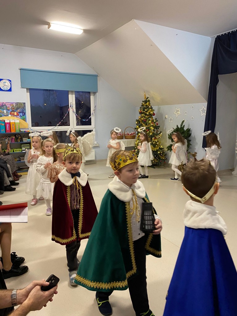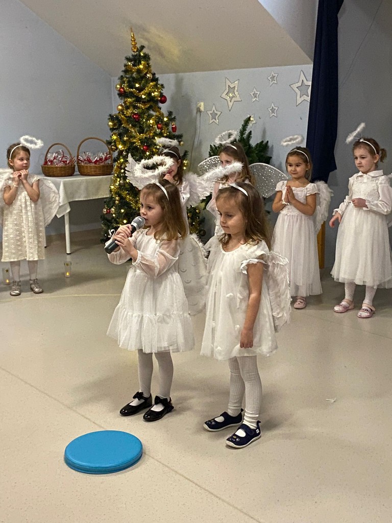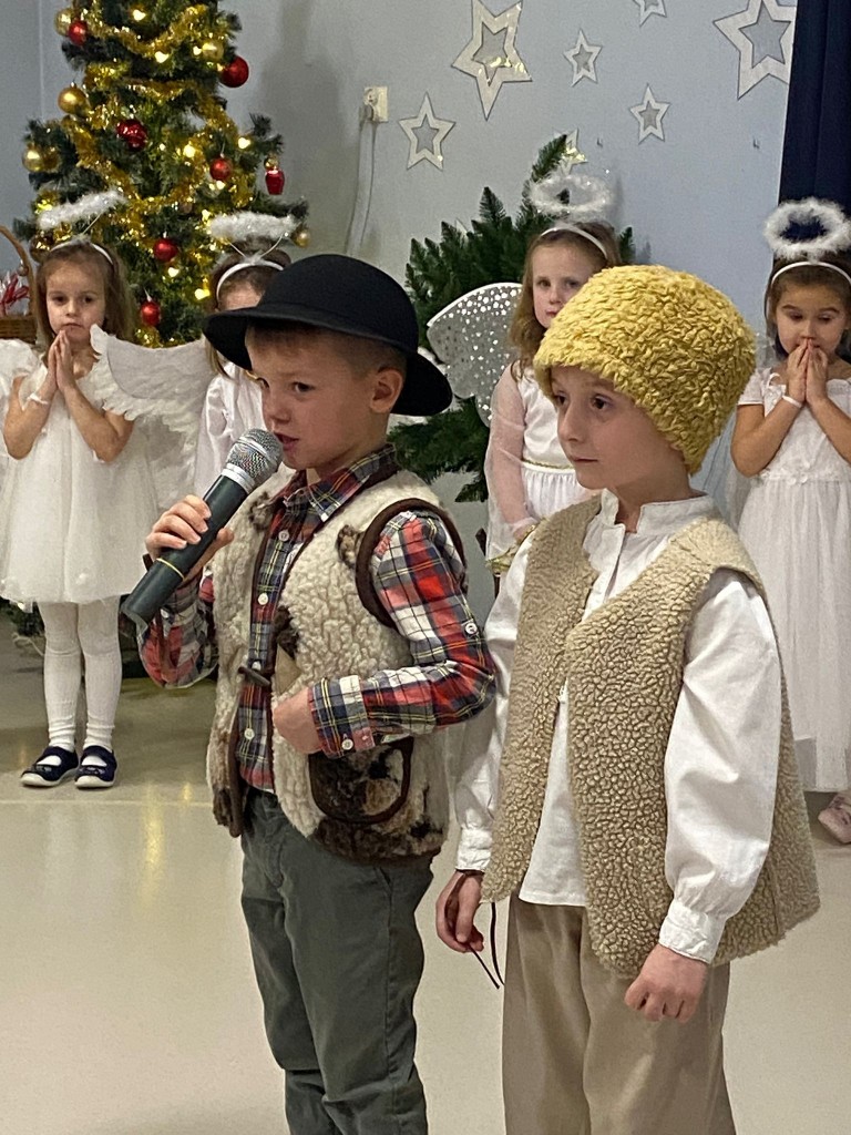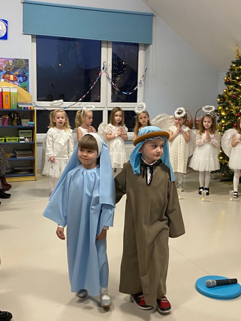 Okres przedświąteczny, w naszym przedszkolu, to czas spotkań jasełkowych z Rodzicami. My również 18 grudnia zaprezentowaliśmy jasełka, podczas których tradycyjnie wystąpiły: aniołki, pasterze, trzech króli i oczywiście Maryja z Józefem. Każdy chciał zobaczyć nowo narodzonego Jezusa, lecz, aby trafić do stajenki trzeba było odnaleźć drogę do Betlejem. Drogę tę wskazywała gwiazda betlejemska, w której postać wcieliła się Weronika. Podczas przedstawienia swój dostojny taniec z lampionami zatańczyły aniołki, a pasterze z werwą zatańczyli z ciupagami. Każdy z nas starał się pięknie powiedzieć swoją rolę i zaśpiewać wszystkie kolędy i pastorałki. Rodzicom chyba się podobało, bo nagrodzili nas dużymi brawami