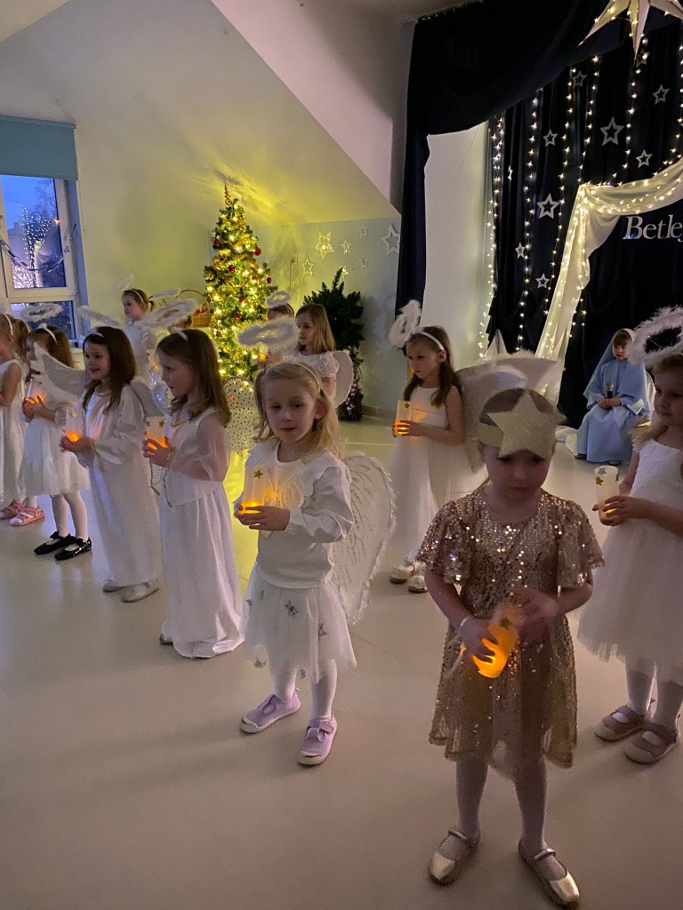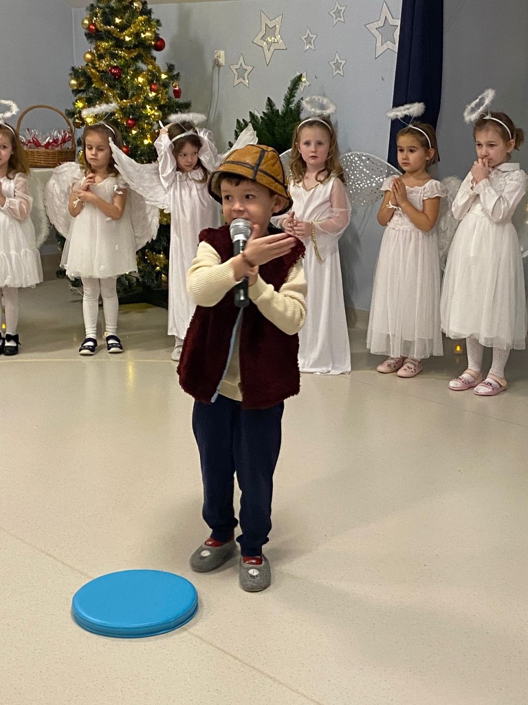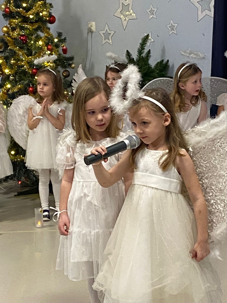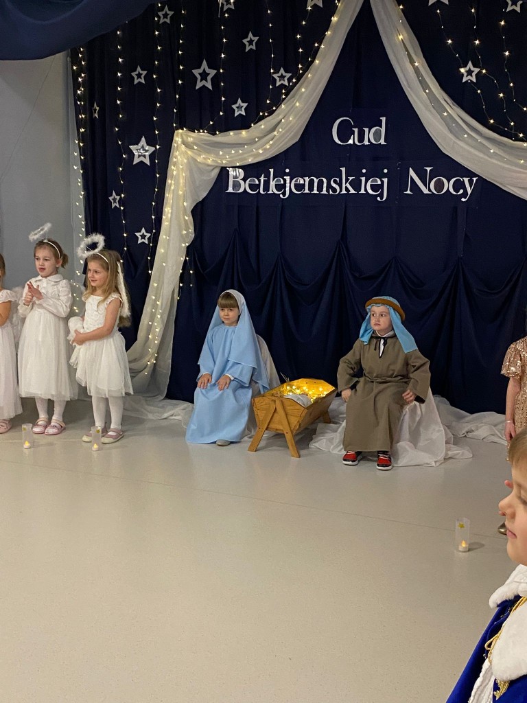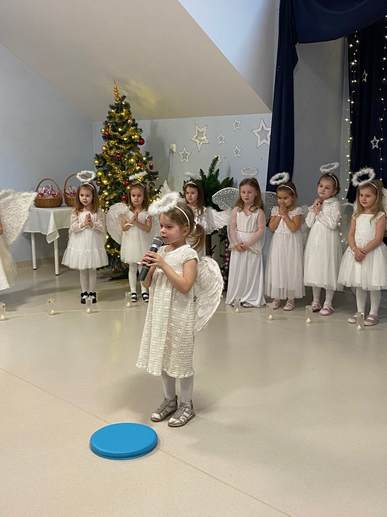 Okres przedświąteczny, w naszym przedszkolu, to czas spotkań jasełkowych z Rodzicami. My również 18 grudnia zaprezentowaliśmy jasełka, podczas których tradycyjnie wystąpiły: aniołki, pasterze, trzech króli i oczywiście Maryja z Józefem. Każdy chciał zobaczyć nowo narodzonego Jezusa, lecz, aby trafić do stajenki trzeba było odnaleźć drogę do Betlejem. Drogę tę wskazywała gwiazda betlejemska, w której postać wcieliła się Weronika. Podczas przedstawienia swój dostojny taniec z lampionami zatańczyły aniołki, a pasterze z werwą zatańczyli z ciupagami. Każdy z nas starał się pięknie powiedzieć swoją rolę i zaśpiewać wszystkie kolędy i pastorałki. Rodzicom chyba się podobało, bo nagrodzili nas dużymi brawami