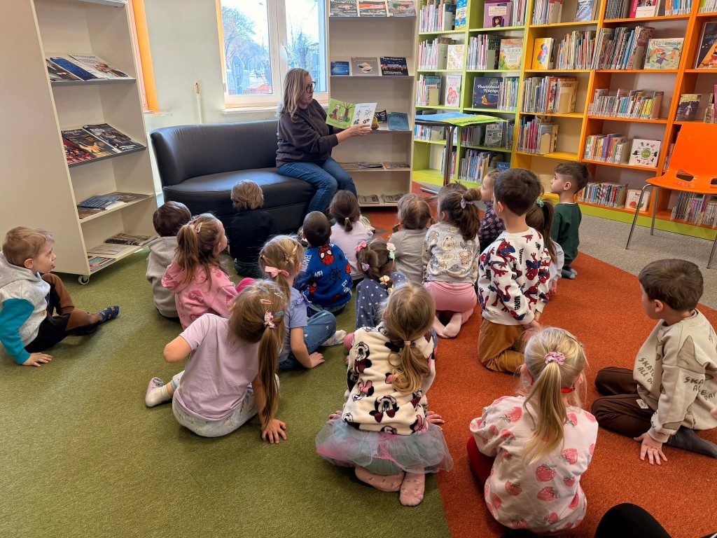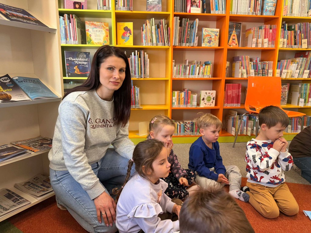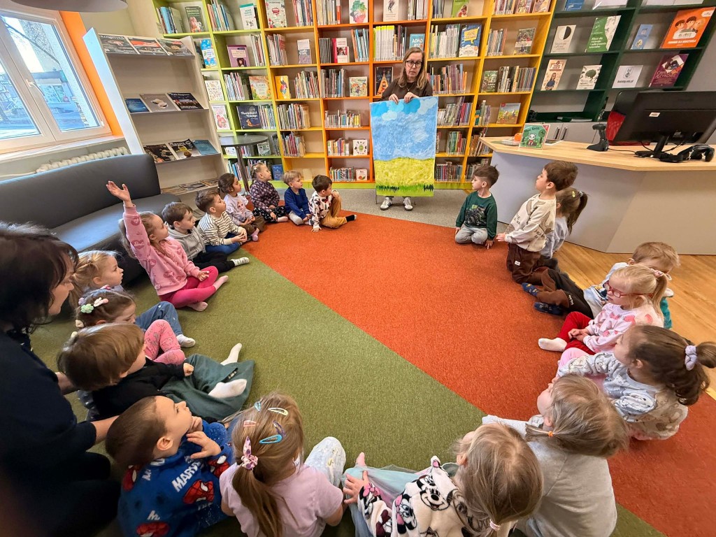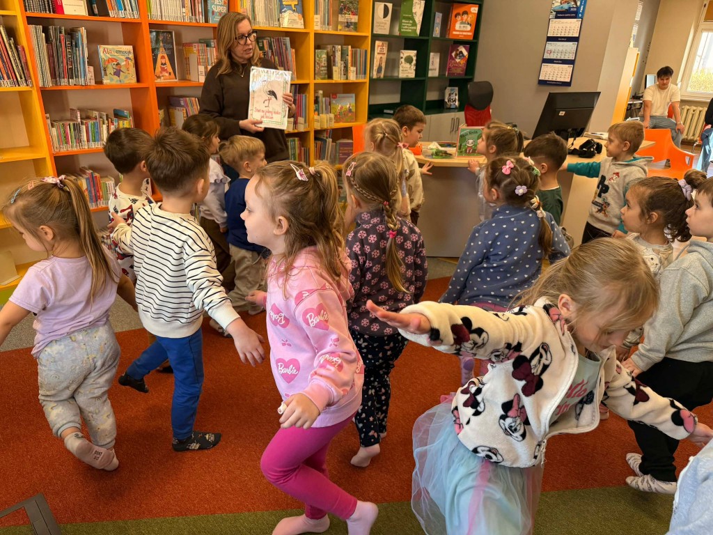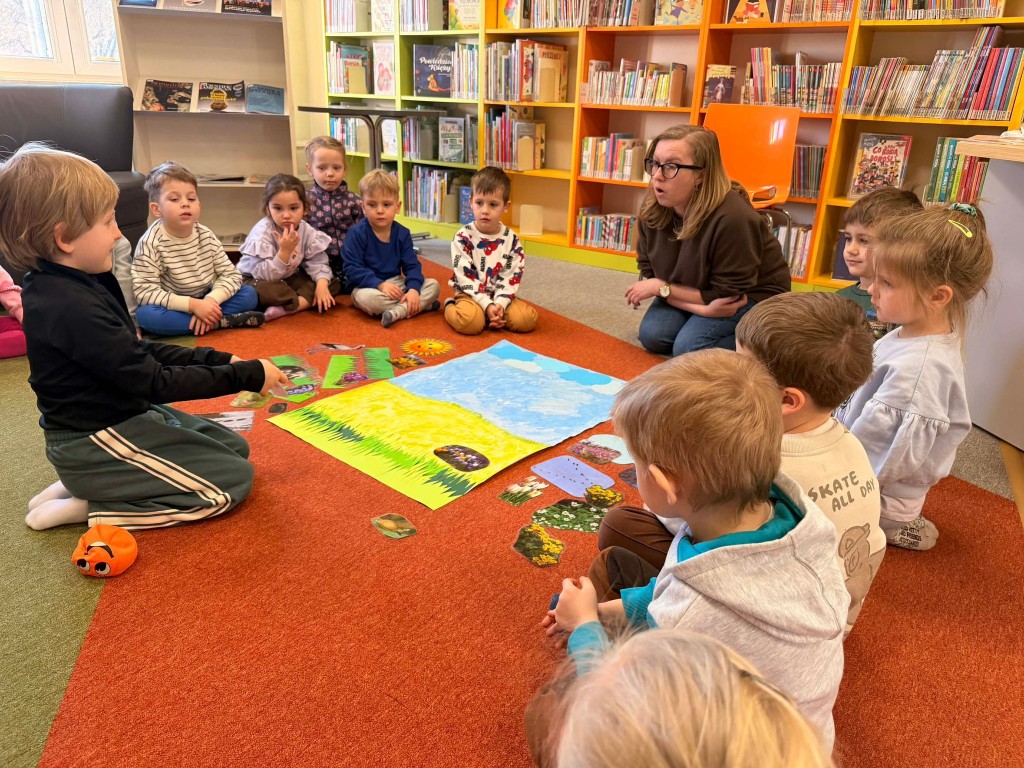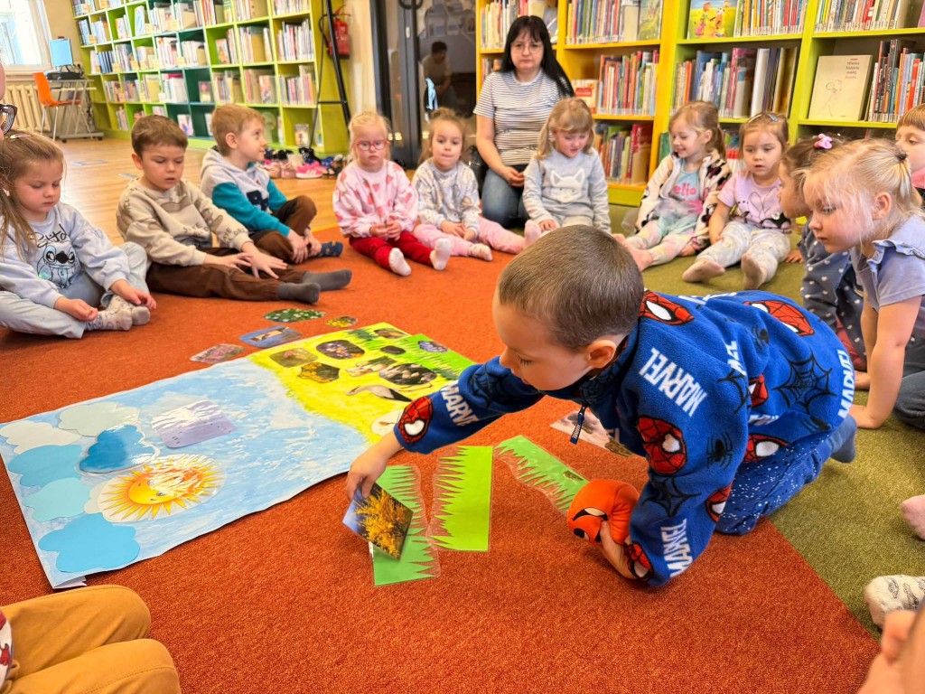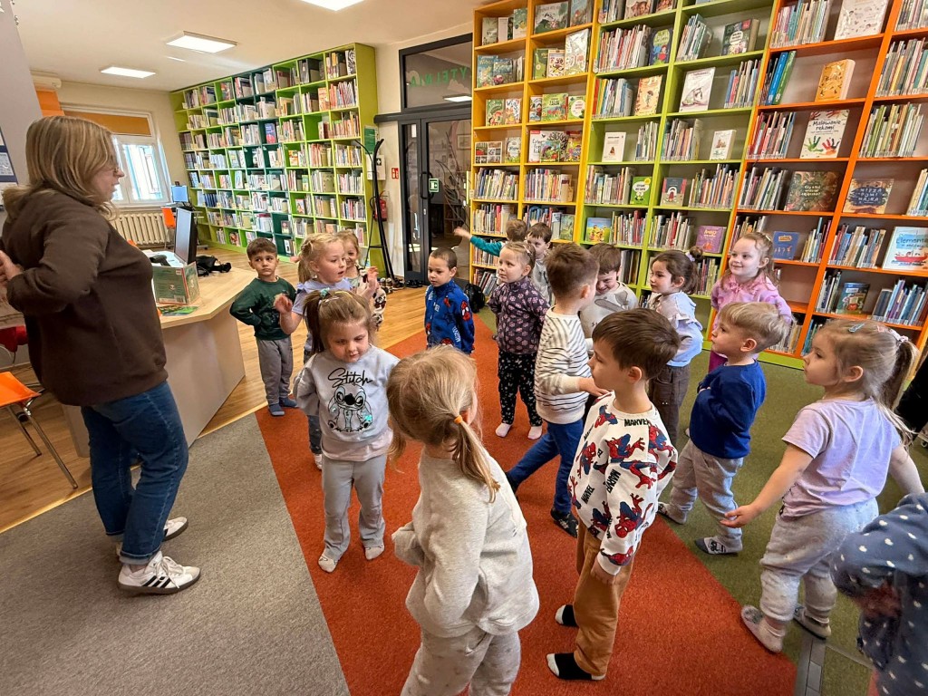 Dnia 9 marca po raz pierwszy udaliśmy się do Biblioteki Pedagogicznej. Podczas wizyty dzieci uczestniczyły w zajęciach o tematyce wiosennej. Wysłuchały opowiadania, rozmawiały o oznakach wiosny oraz brały udział w ciekawych aktywnościach przygotowanych przez panią bibliotekarkę. Dla wielu dzieci była to pierwsza wizyta w bibliotece, dlatego była to bardzo miła i wartościowa przygoda, która zachęciła je do sięgania po książki.