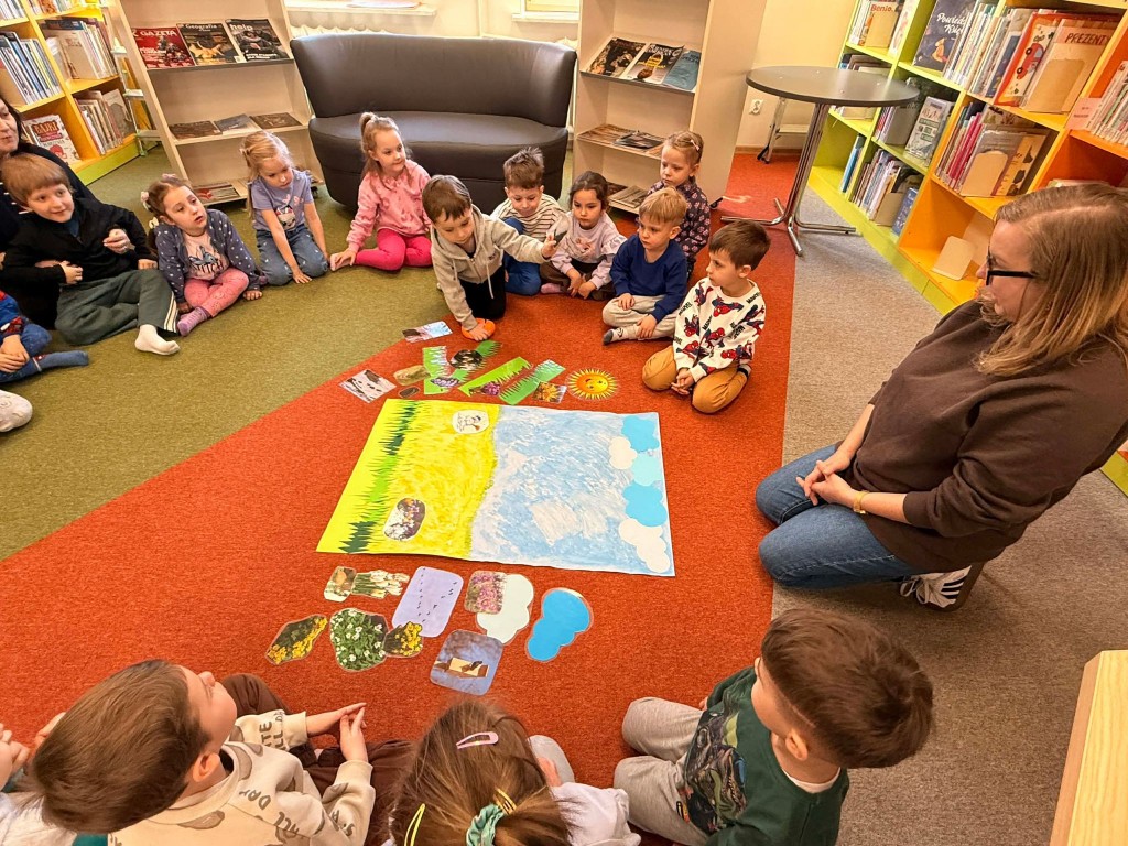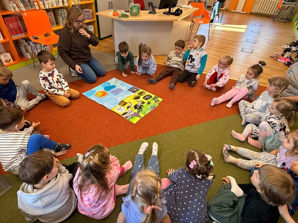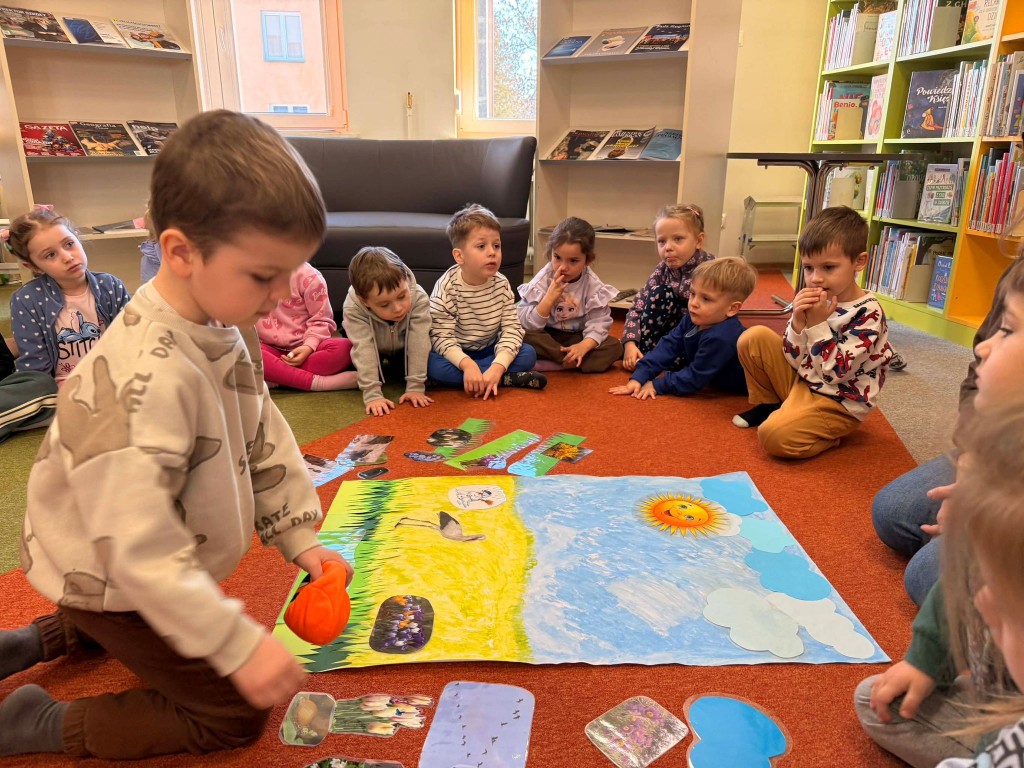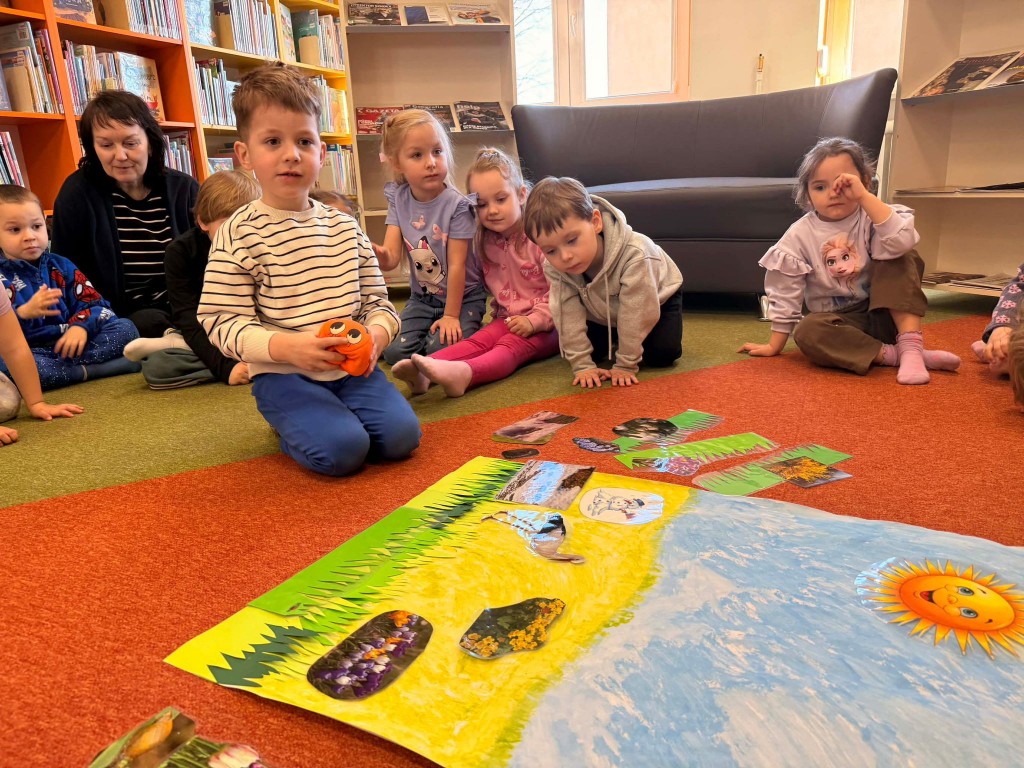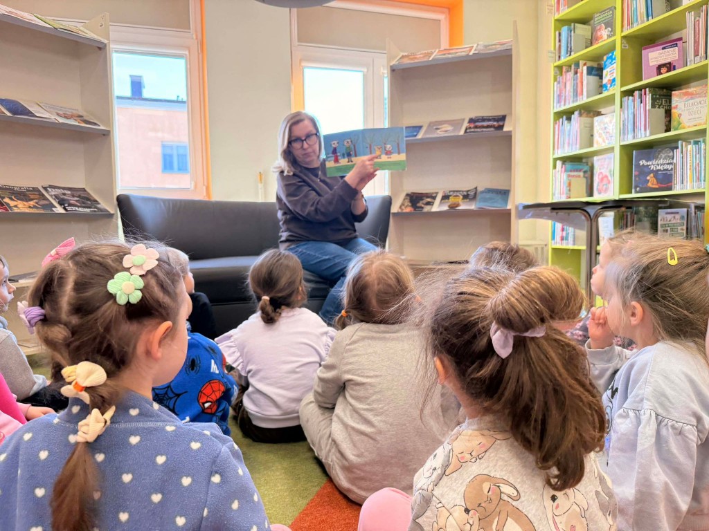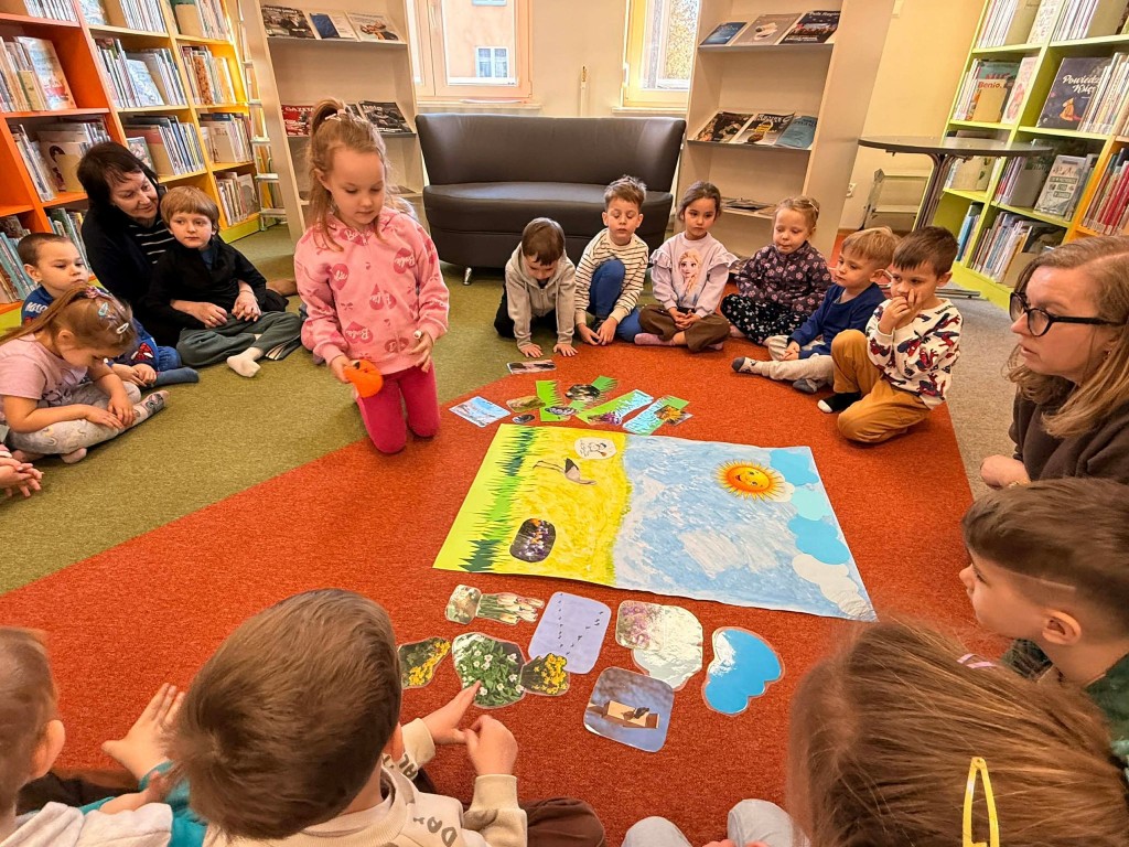 Dnia 9 marca po raz pierwszy udaliśmy się do Biblioteki Pedagogicznej. Podczas wizyty dzieci uczestniczyły w zajęciach o tematyce wiosennej. Wysłuchały opowiadania, rozmawiały o oznakach wiosny oraz brały udział w ciekawych aktywnościach przygotowanych przez panią bibliotekarkę. Dla wielu dzieci była to pierwsza wizyta w bibliotece, dlatego była to bardzo miła i wartościowa przygoda, która zachęciła je do sięgania po książki.