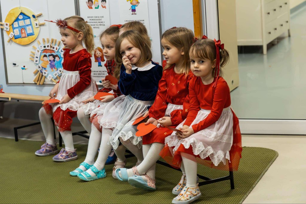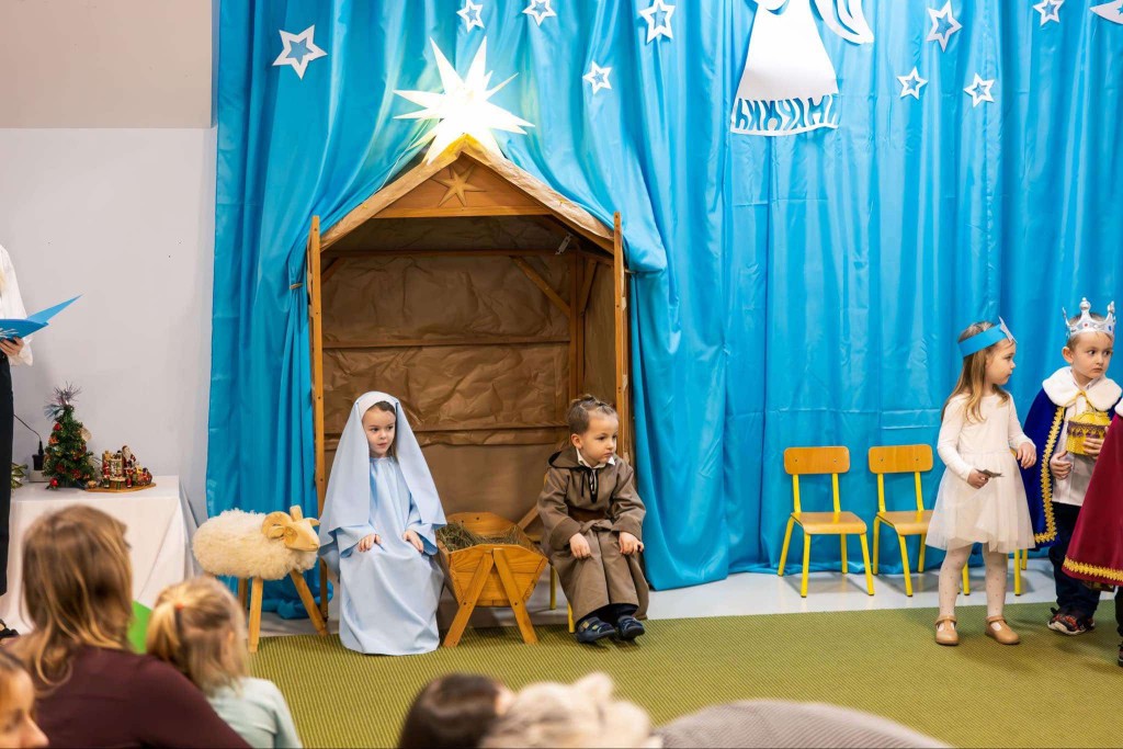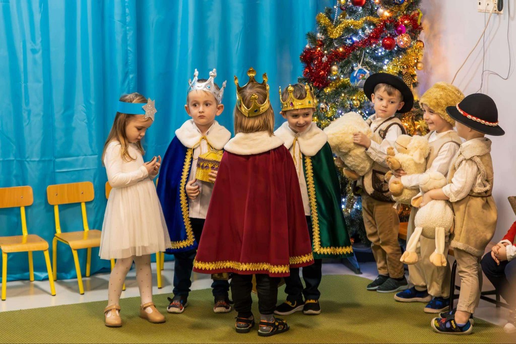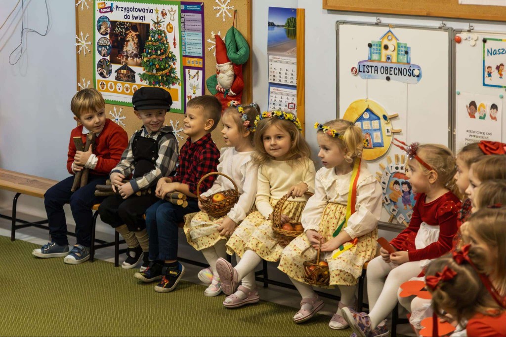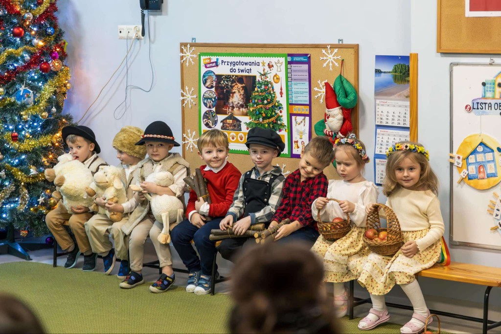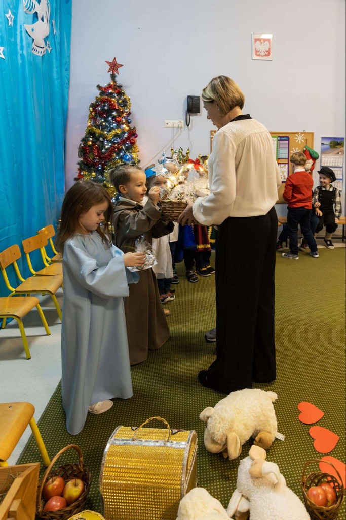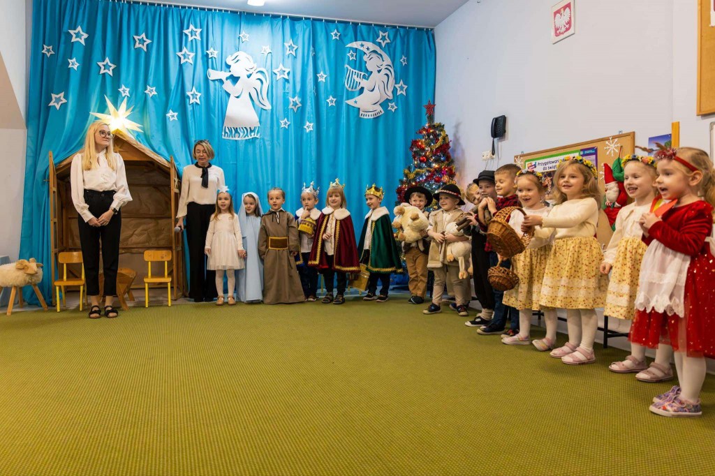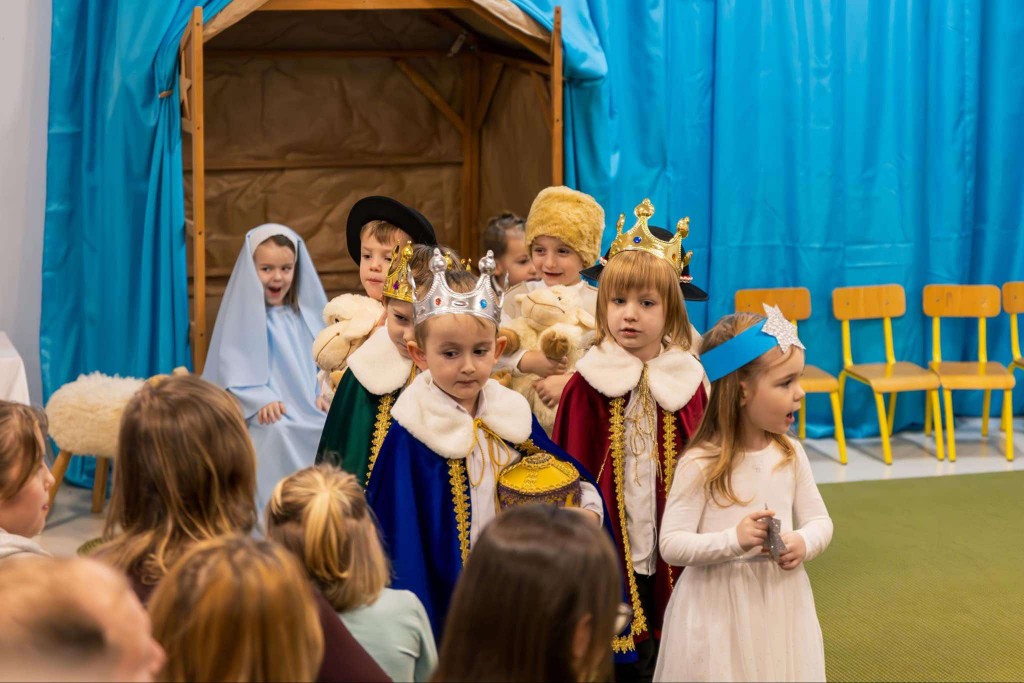 W dniu 19 grudnia zaprosiliśmy Rodziców, by wspólnie z nami wyruszyli w podróż do Betlejem. W tej podróży uczestniczyli Maryja z Józefem, Trzej Królowie, Gwiazdeczka, Pasterze, Drwale, Ogrodniczki i Dzieci. Każdy z nas miał przypisaną sobie rolę i dar dla Jezuska. W tej drodze dzielnie wspierali nas Rodzice, którzy podczas naszej wędrówki pomagali nam śpiewać kolędy. Po dotarciu do nowonarodzonego dzieciątka i złożeniu mu darów zaprezentowaliśmy wiersz o wieczorze wigilijnym, zaśpiewaliśmy świąteczną piosenkę w języku angielskim oraz zatańczyliśmy taniec dla Mikołaja. Na zakończenie spotkania wręczyliśmy rodzicom pierniczki, które wcześniej piekliśmy i ozdabialiśmy, a następnie wszyscy wszystkim życzyli: „Wesołych Świąt!” .