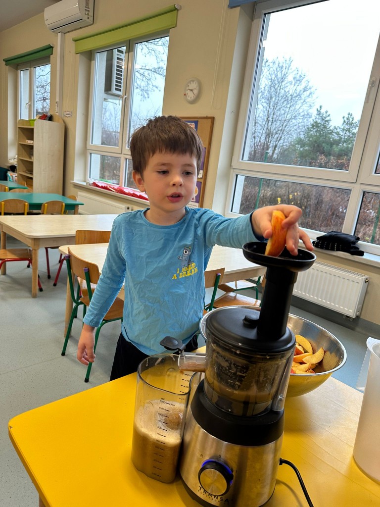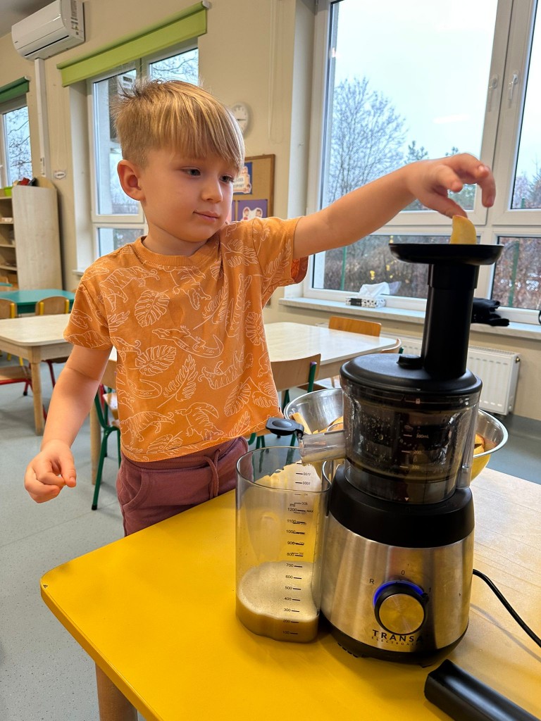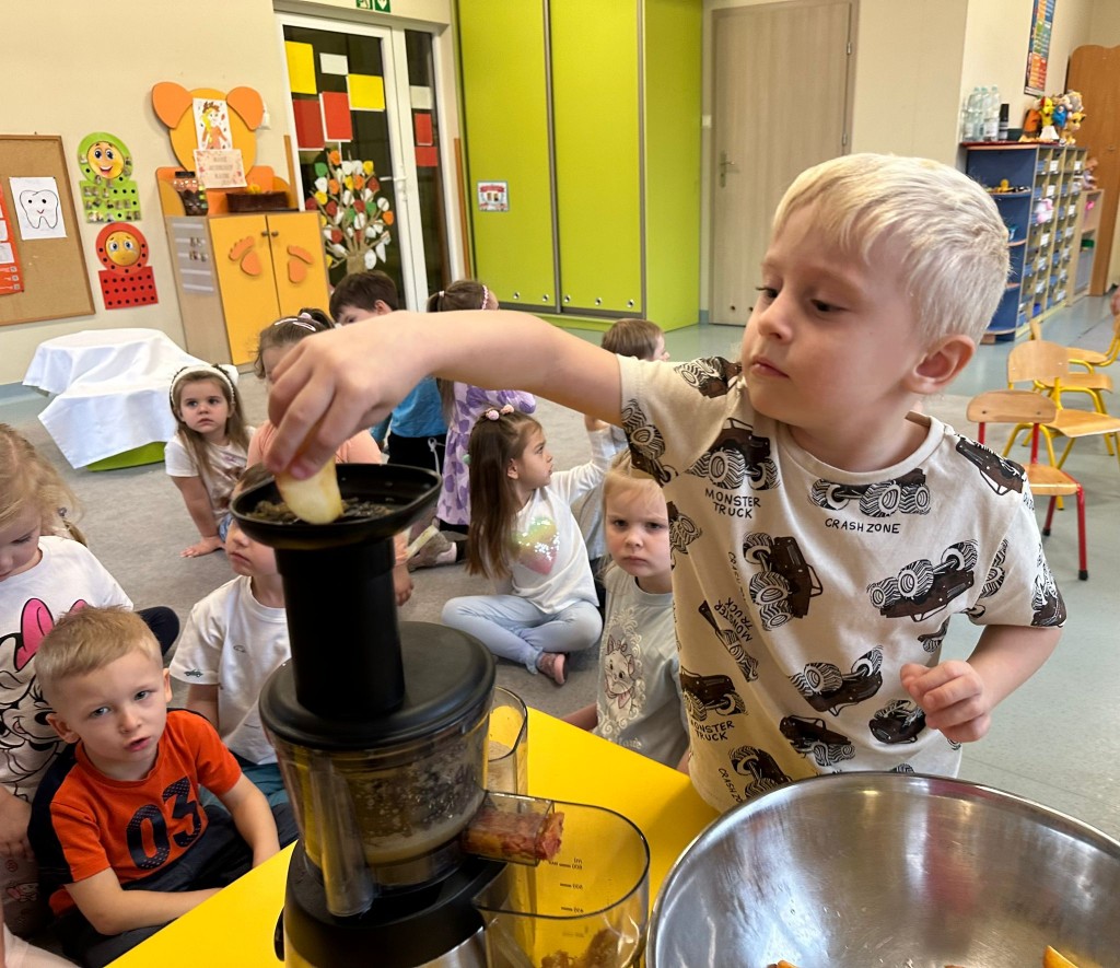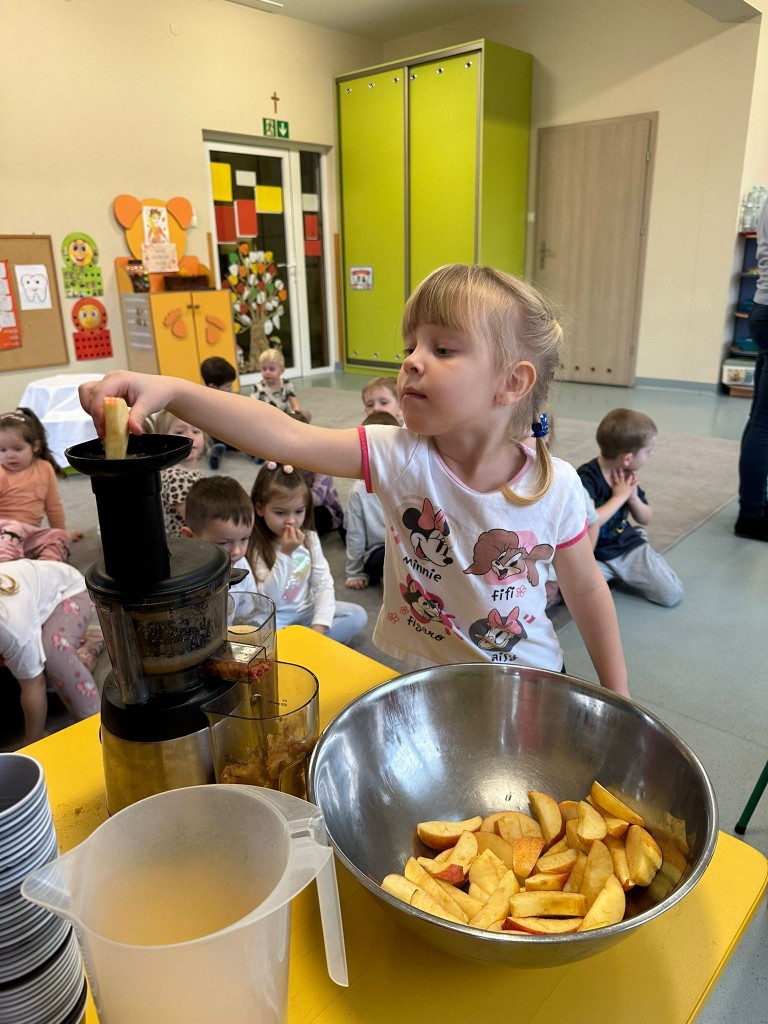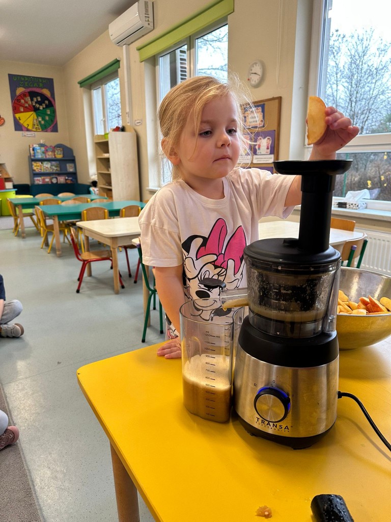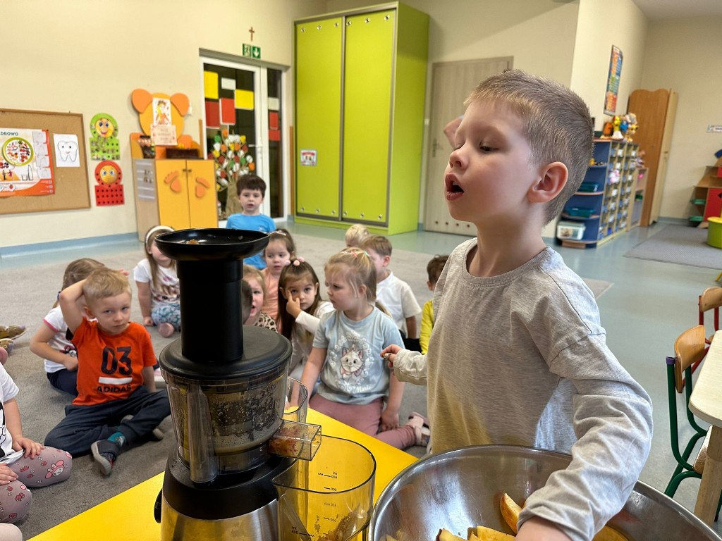 W obecnym roku przedszkolnym dużą uwagę zwracamy na promowanie zdrowego stylu życia, dlatego też wspólnie przygotowaliśmy świeży sok jabłkowy! Najpierw obejrzeliśmy jak wygląda sokowirówka i dowiedzieliśmy się, do czego służy. Następnie każdy z nas miał okazję dokładnie obejrzeć jabłka, sprawdzić ich zapach i kolor, a potem wrzucić je do urządzenia. Najwięcej radości wywołał oczywiście moment obserwowania, jak z jabłek powstaje pyszny sok. A na koniec... Z dumą próbowaliśmy własnoręcznie przygotowanego napoju. Było pysznie!
