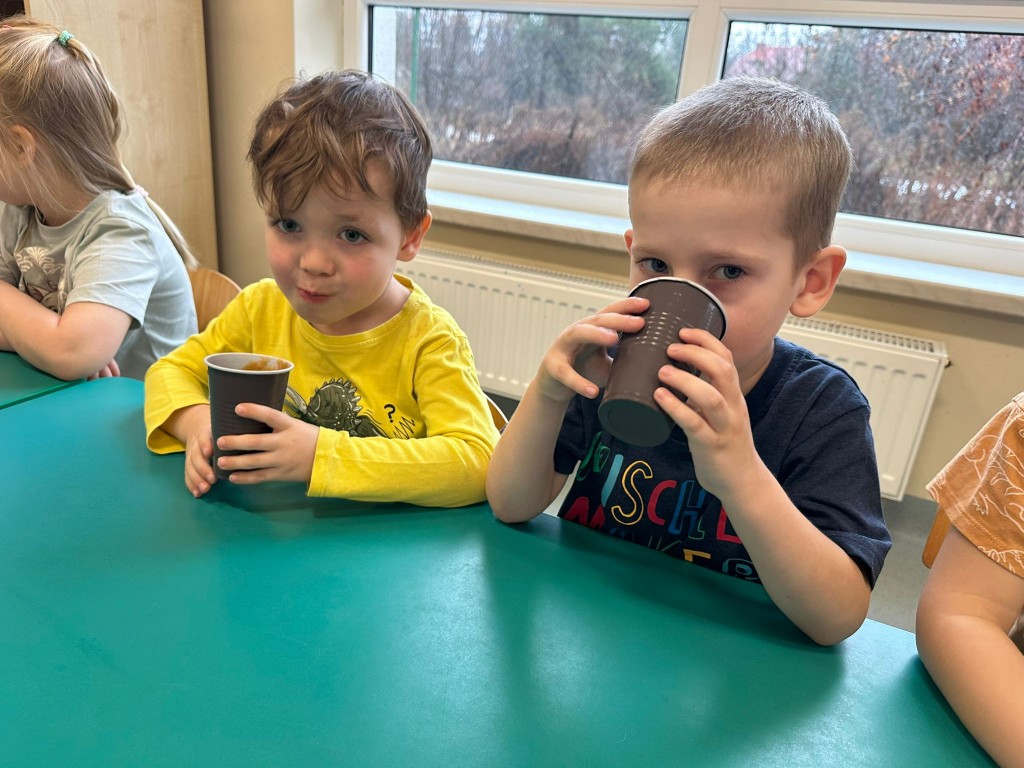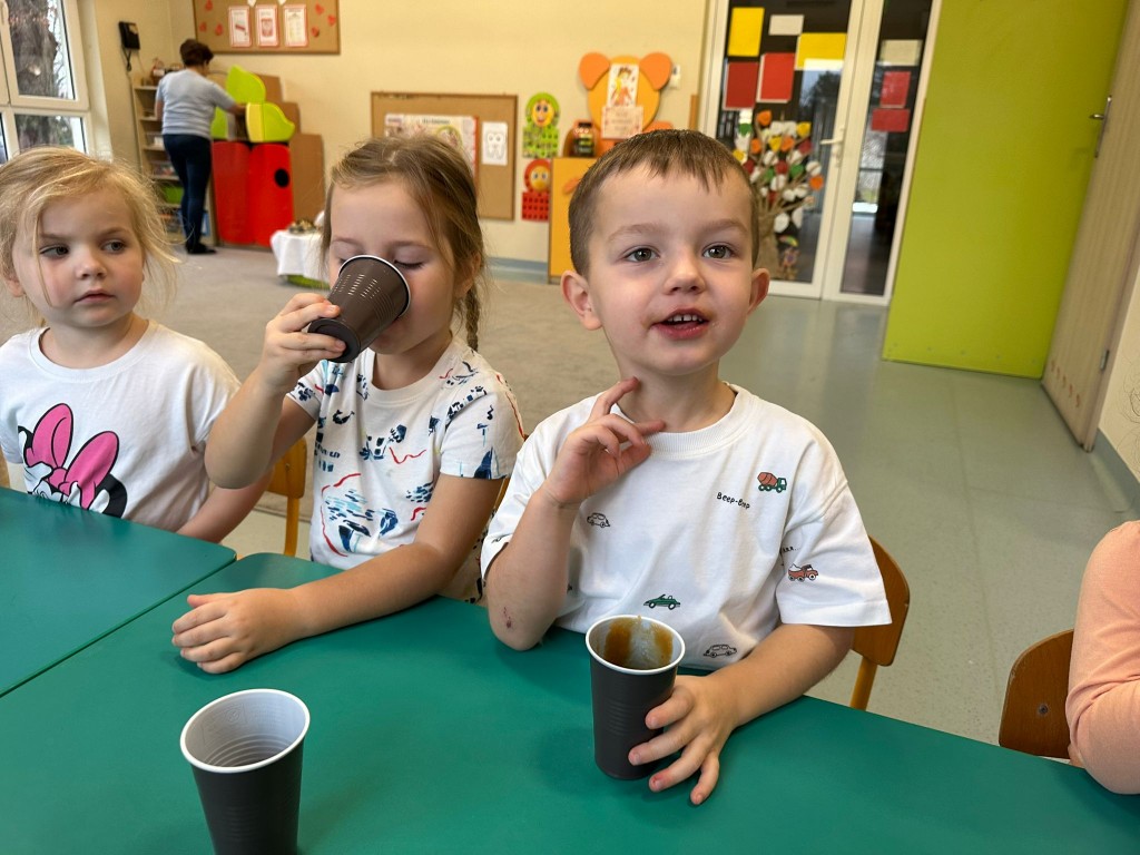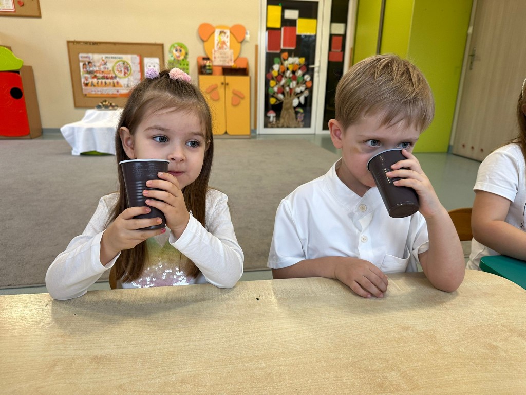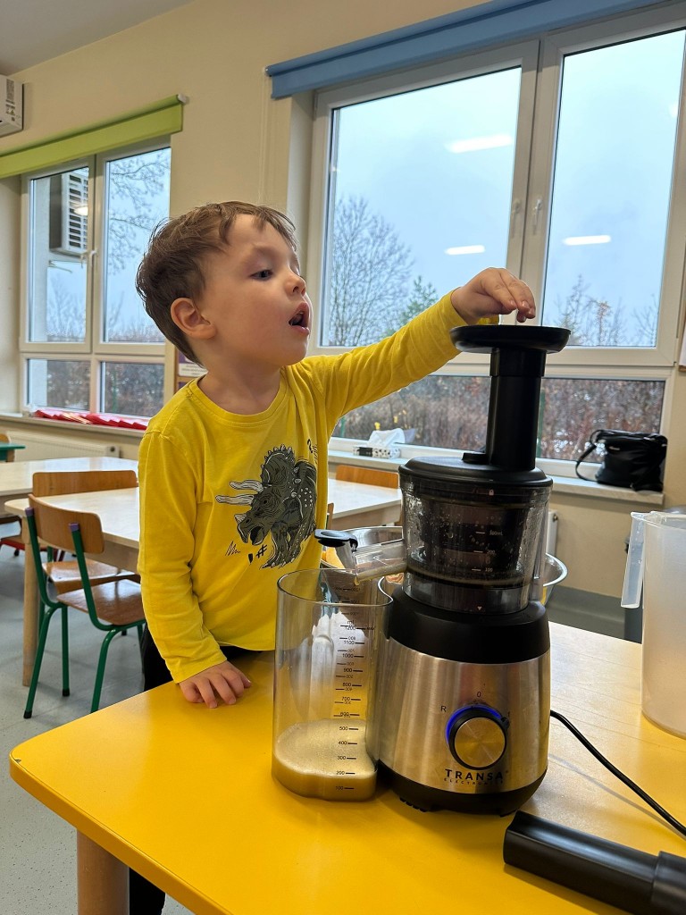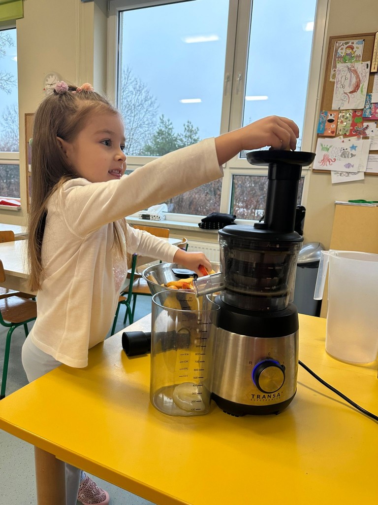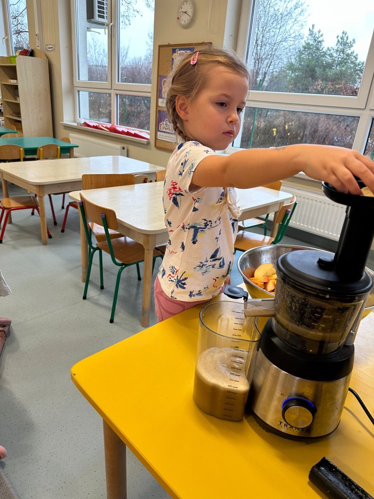 W obecnym roku przedszkolnym dużą uwagę zwracamy na promowanie zdrowego stylu życia, dlatego też wspólnie przygotowaliśmy świeży sok jabłkowy! Najpierw obejrzeliśmy jak wygląda sokowirówka i dowiedzieliśmy się, do czego służy. Następnie każdy z nas miał okazję dokładnie obejrzeć jabłka, sprawdzić ich zapach i kolor, a potem wrzucić je do urządzenia. Najwięcej radości wywołał oczywiście moment obserwowania, jak z jabłek powstaje pyszny sok. A na koniec... Z dumą próbowaliśmy własnoręcznie przygotowanego napoju. Było pysznie!
