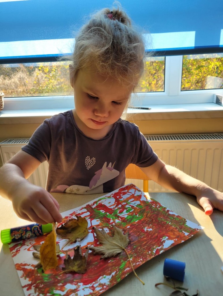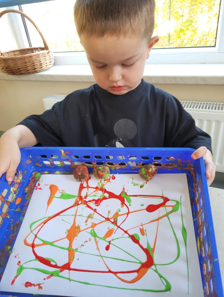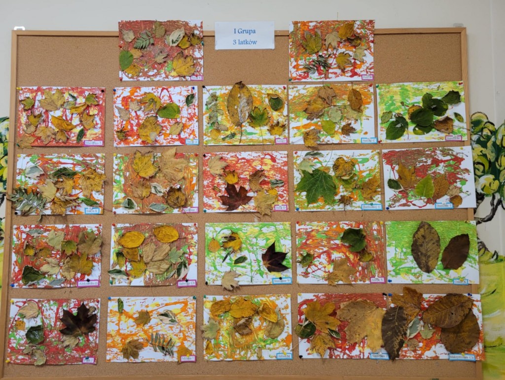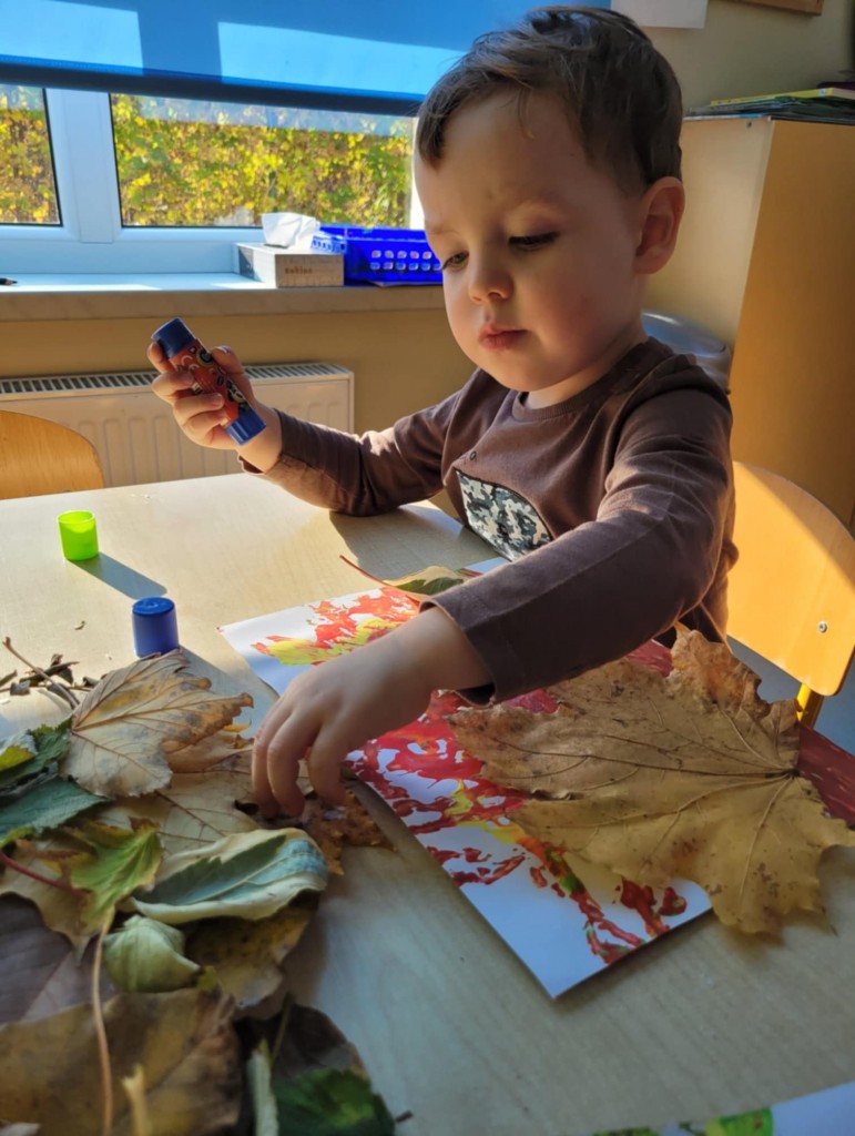 Najpierw dzieci doświadczyły techniki malowania kasztanami, następnie po zebraniu liści przyklejały je komponując piękne prace - na wcześniej przygotowanej kartce.
